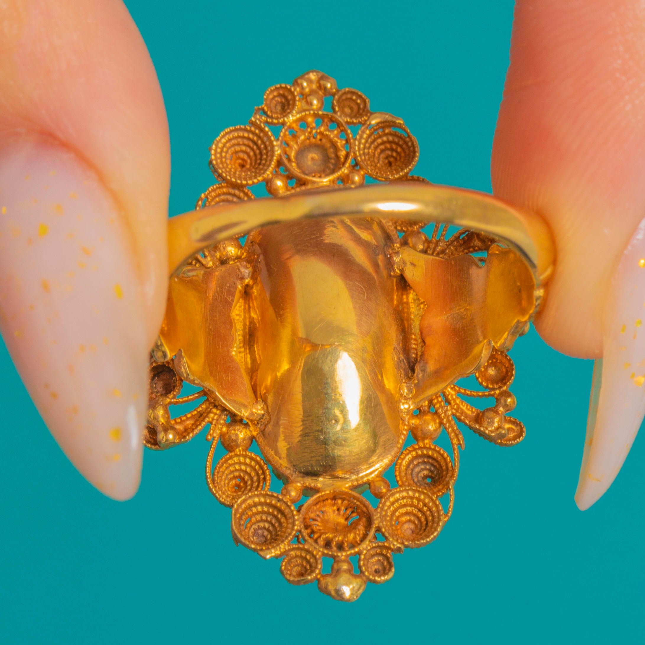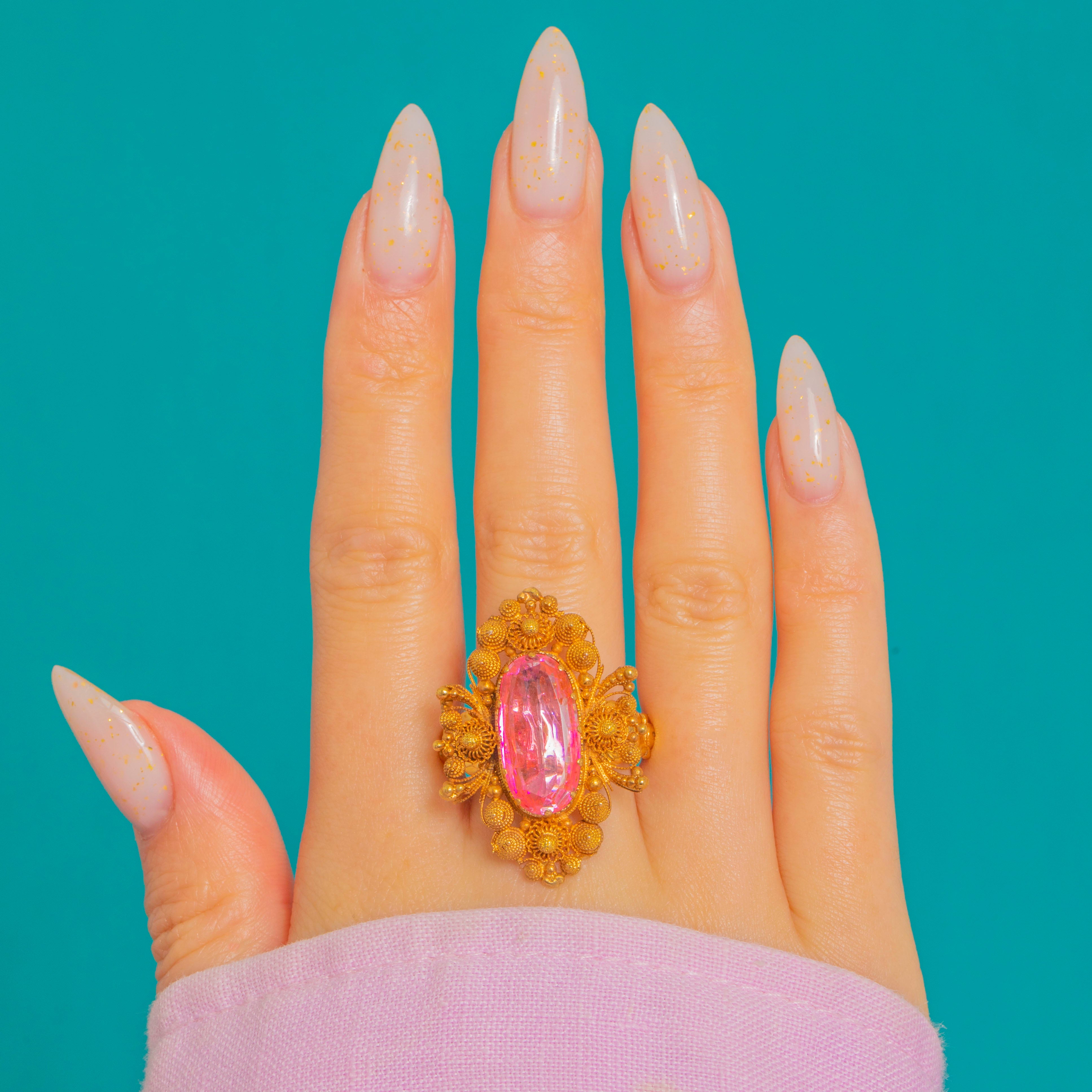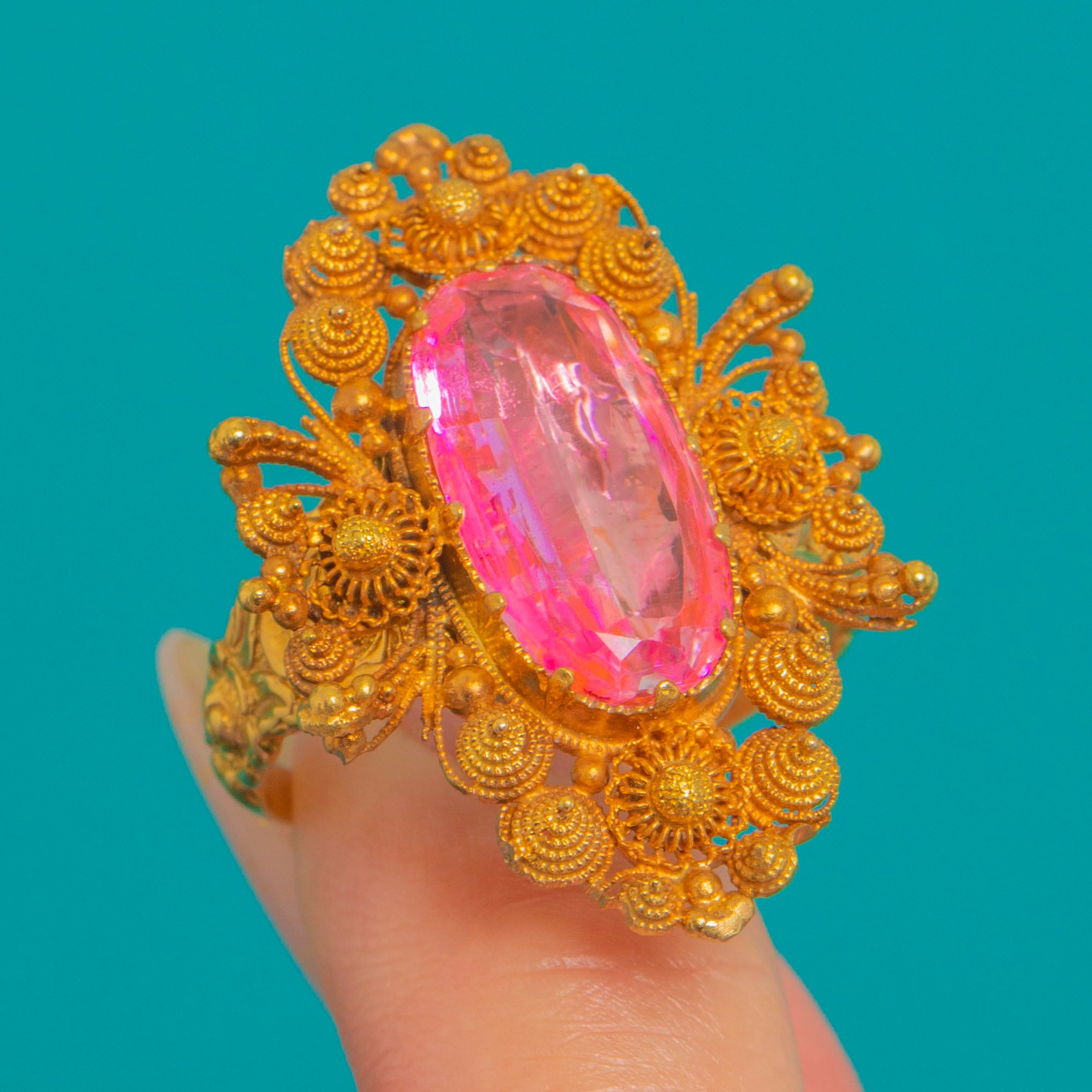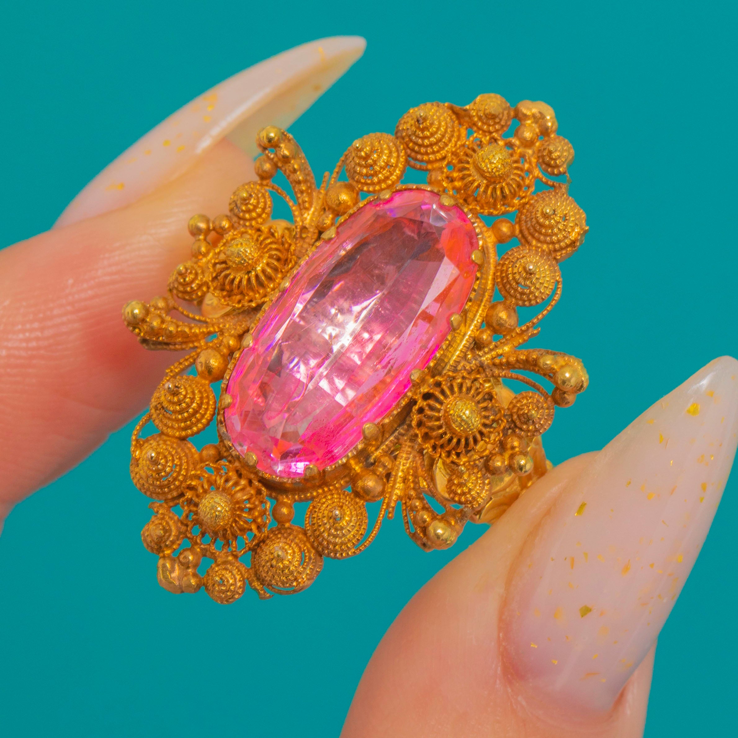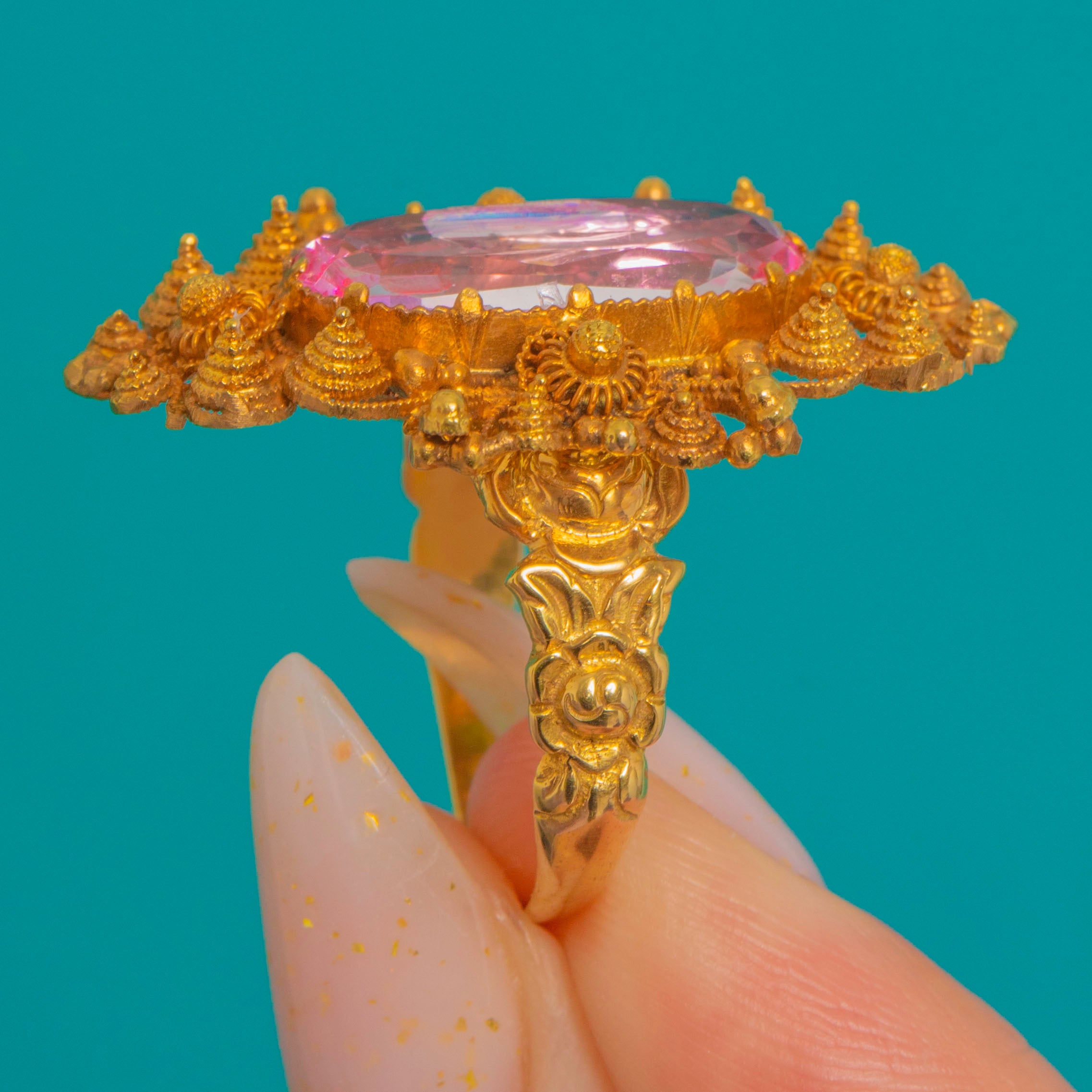 Opulent Georgian cannetille at its most romantic. This statement ring showcases a vivid Pink Topaz in an elongated oval, lifted in a high collet and haloed by dense coils, granulated rosettes and scrolling wirework. The richly toned Gold glows with that unmistakable period warmth, while the plaque-like head offers a bold, elegant silhouette that sits proudly on the hand.