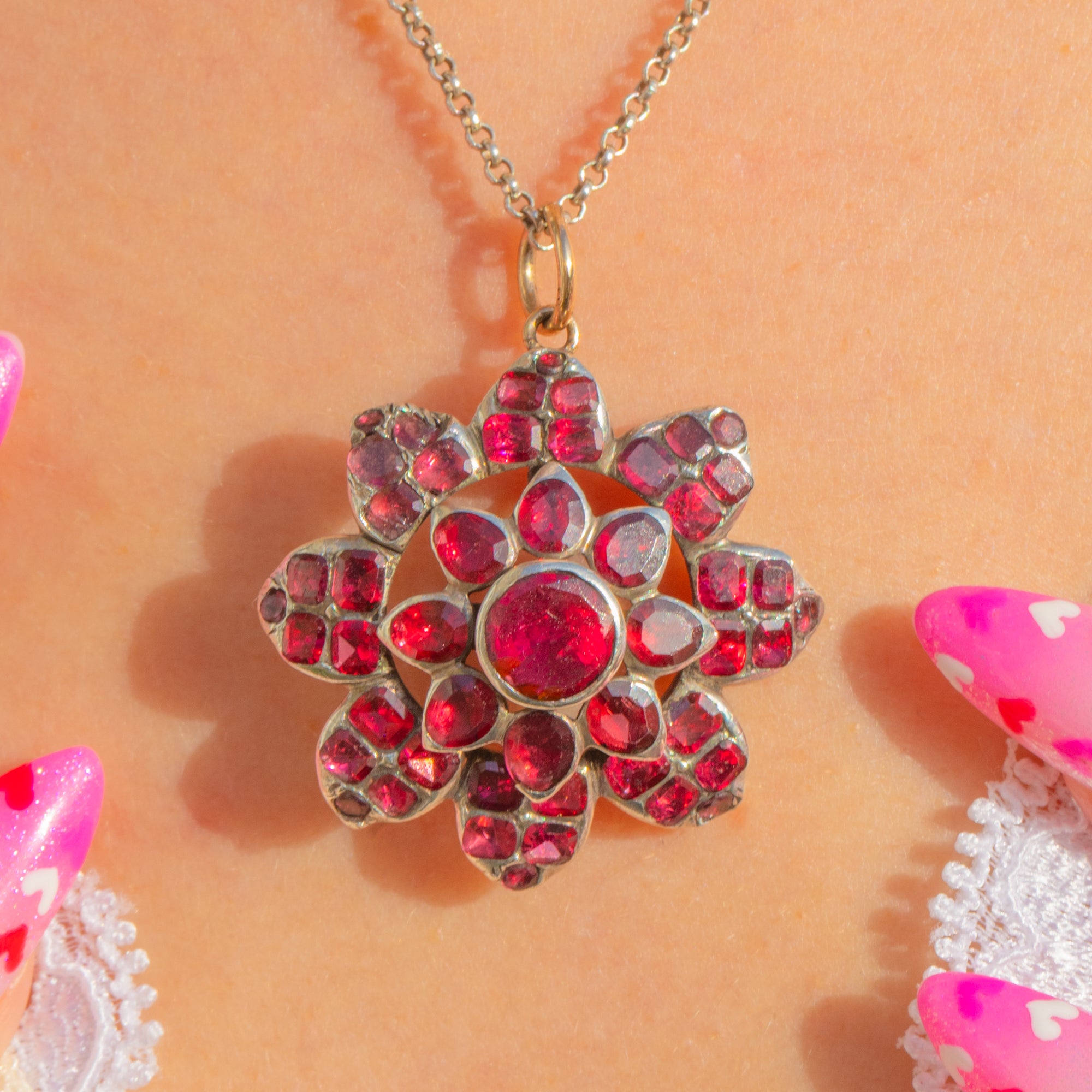 A sumptuous Georgian flower pendant alive with the rich wine-red glow of Flat Cut Garnets. Arranged in a radiant rosette, the stones graduate towards a domed centre, each nestled in hand-worked closed-back collet settings that create a deep, romantic shimmer. The ornate, layered openwork gives air and dimension to the cluster, while an 18ct Gold jump ring adds a refined note to the Silver mount.