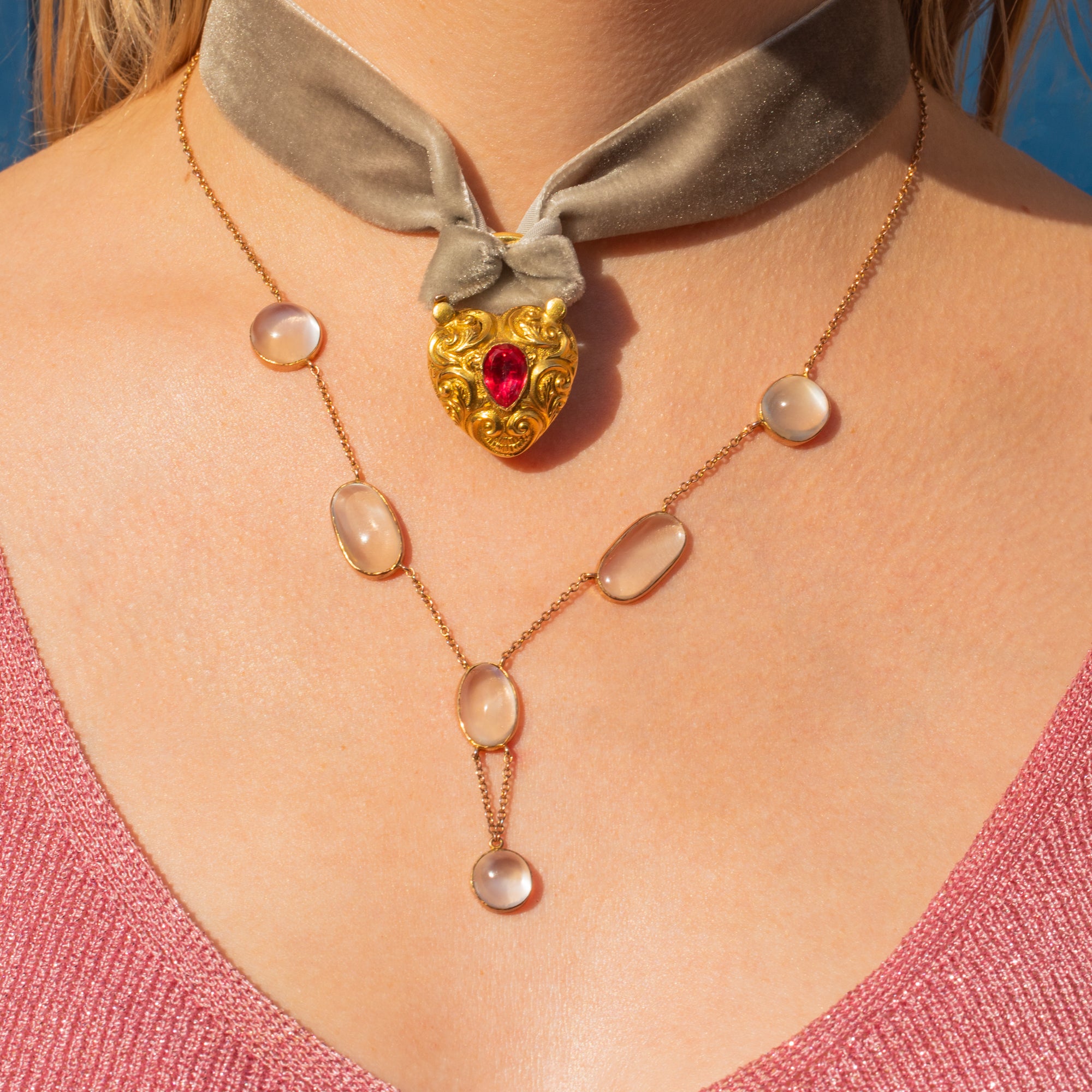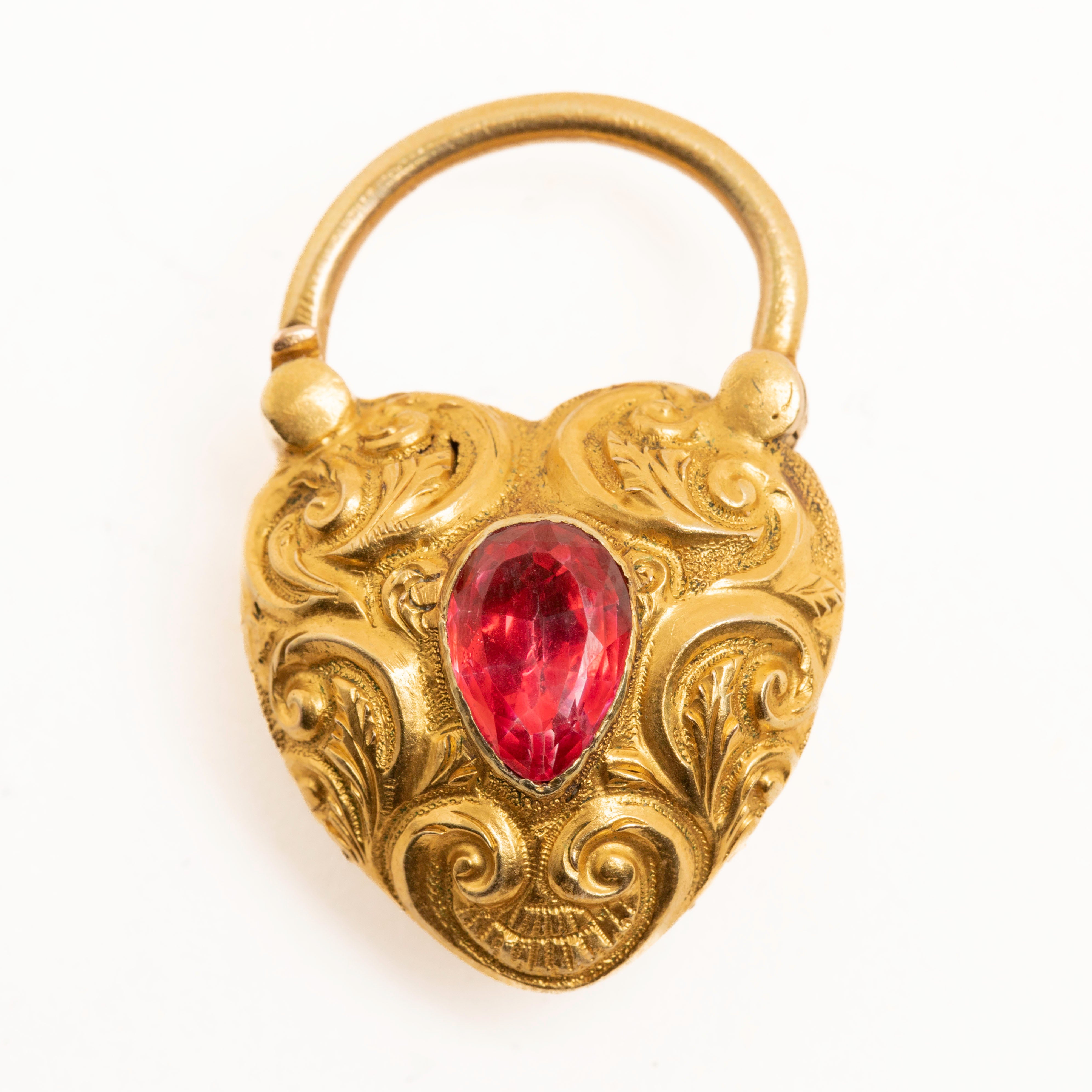 VERY GOOD. This Georgian 18ct Gold Foiled Topaz repoussé heart padlock is in splendid condition, especially when considering her grand age. Her Topaz is excellently foiled and has the most magnificent deep pink tone. While her Topaz does have a little nibble on a left sided facet, this is only visible under close inspection.