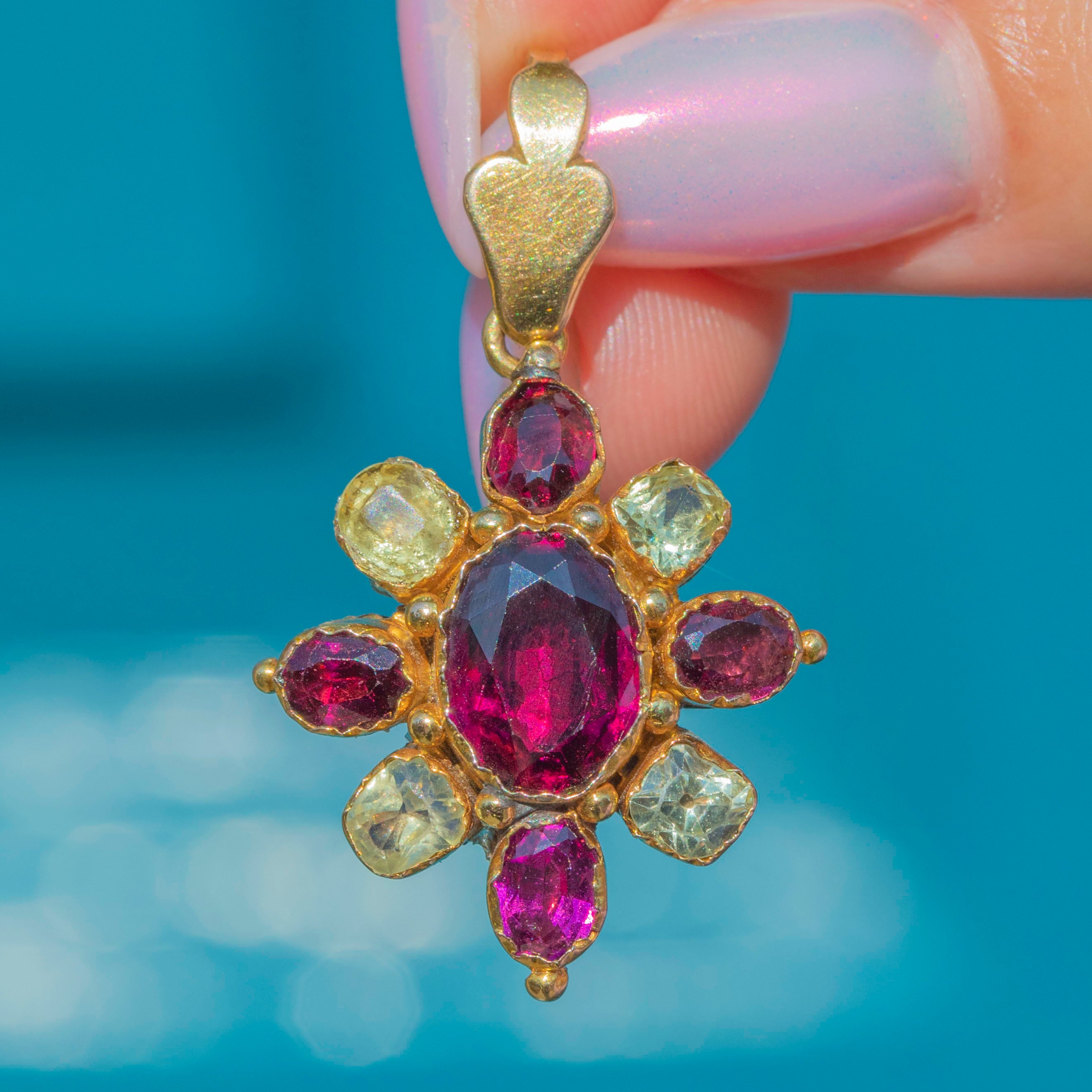VERY GOOD-EXCELLENT: Each gemstone has been preserved wonderfully and is secure in its bezel. The Gold is bright and buttery, with only minor spots of discolouration to the settings, which are difficult to spot without a jeweller's loupe. With a secure bale, you can wear this Georgian cluster pendant with utmost confidence.