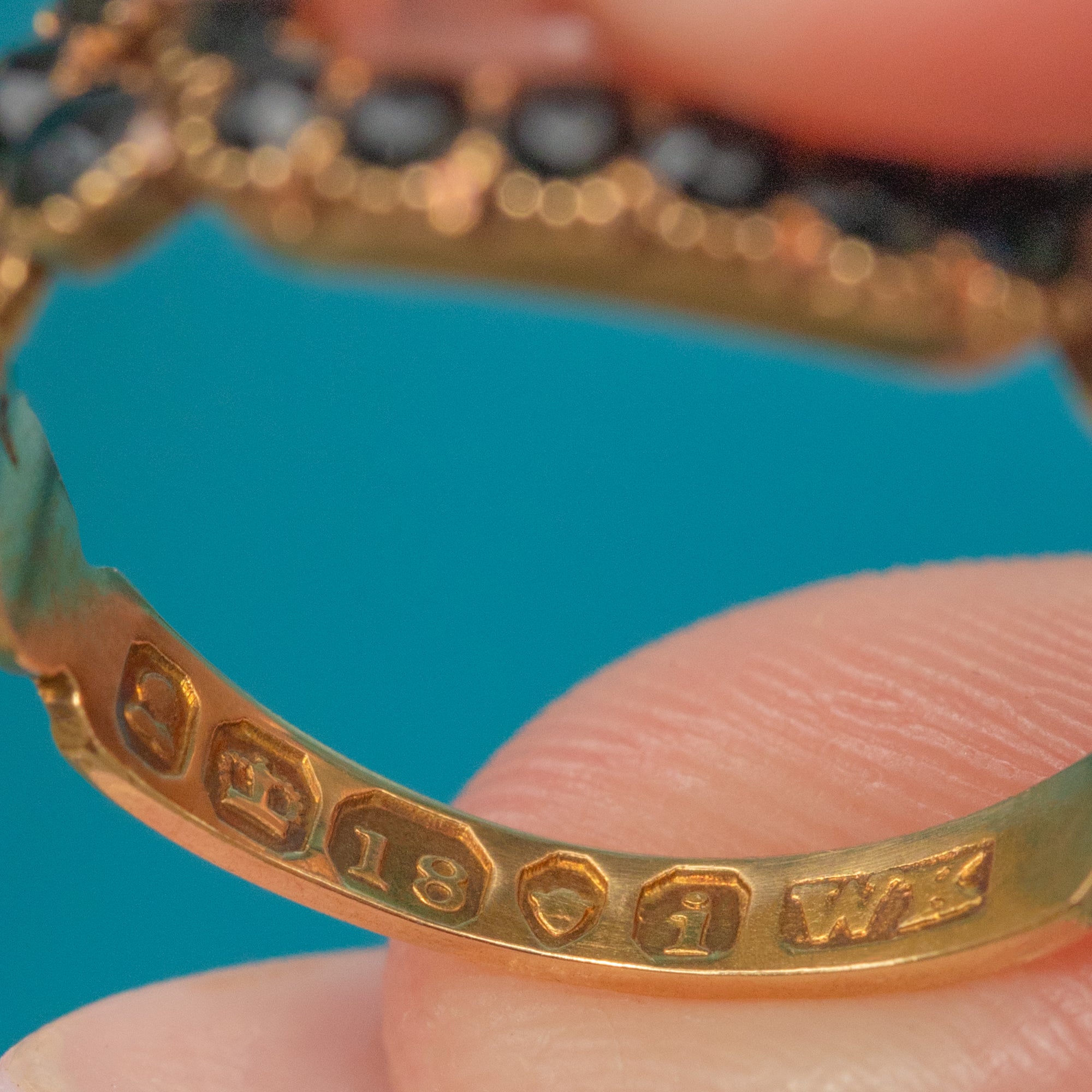 The beauty of this Georgian ring lies in the inscription on the reverse of the gemstone setting, which reads: John Wetton, Ob Oct 13, 1829, aged 38, a beautiful memento. This is a one-of-a-kind piece of mourning jewellery no one else will have in their collection!