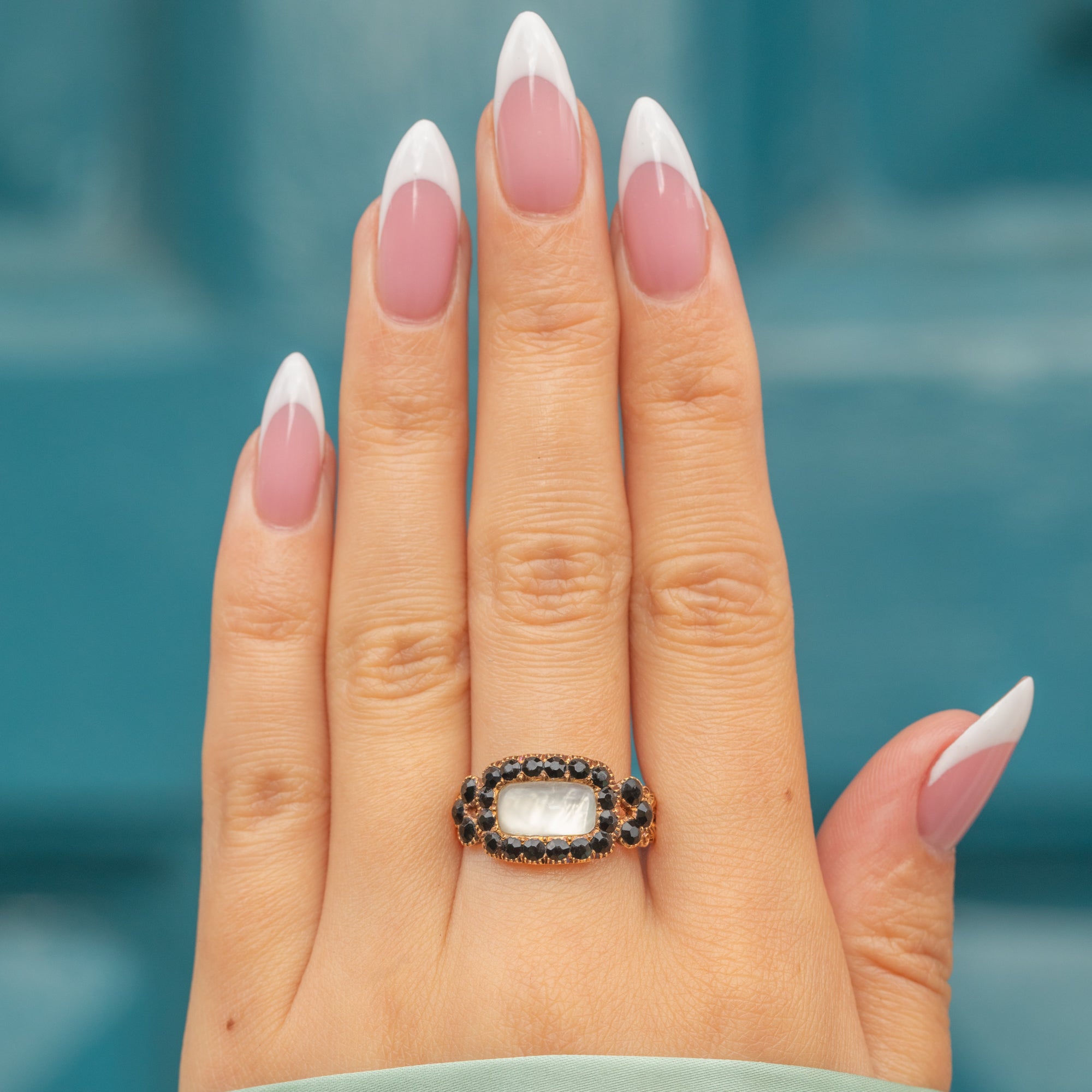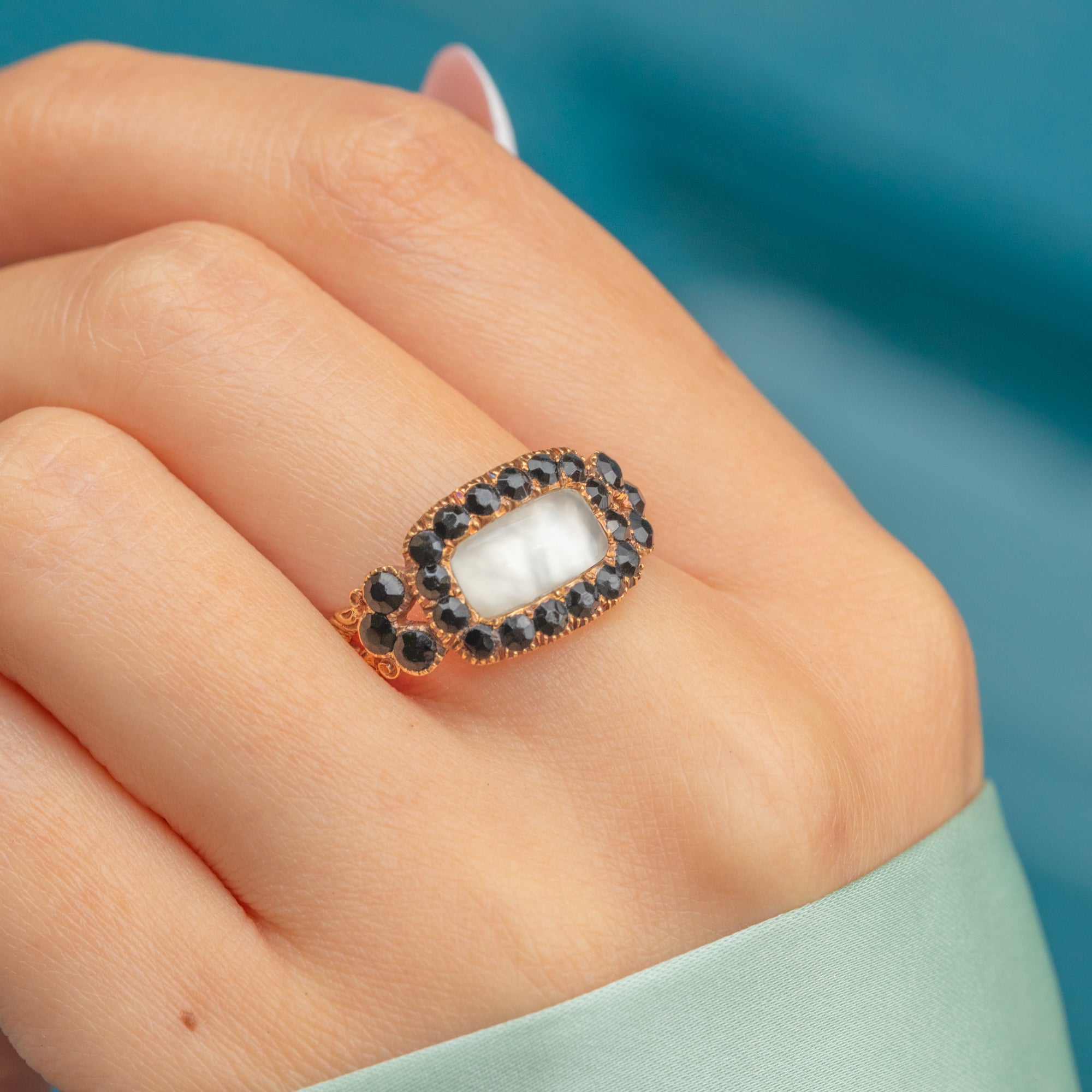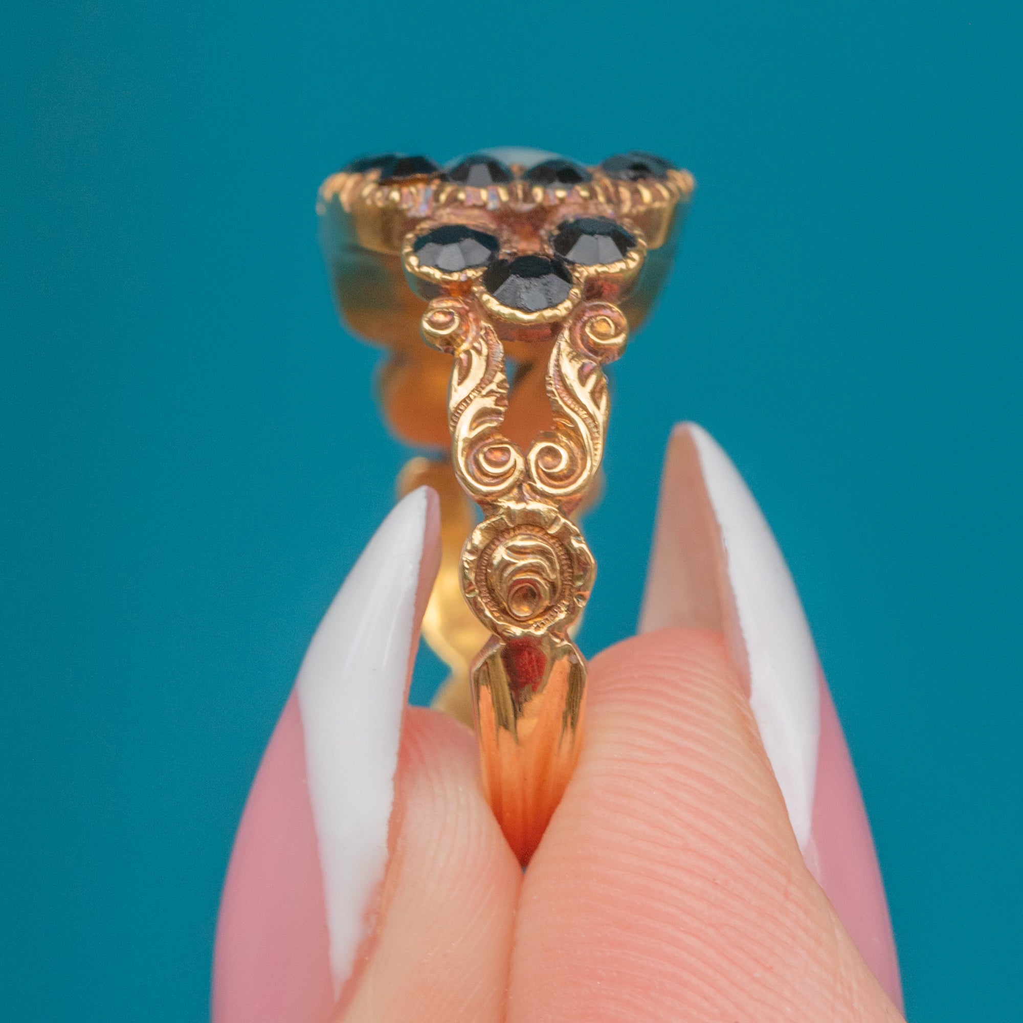 This Georgian 9ct Gold Amethyst Jet mourning ring is simply exquisite. Crafted from 9ct Gold, this ring is almost 200 years old and remains in wonderful condition! The front of the ring features a smooth cabochon-cut Moonstone, adorned by glinting Jet gemstones.