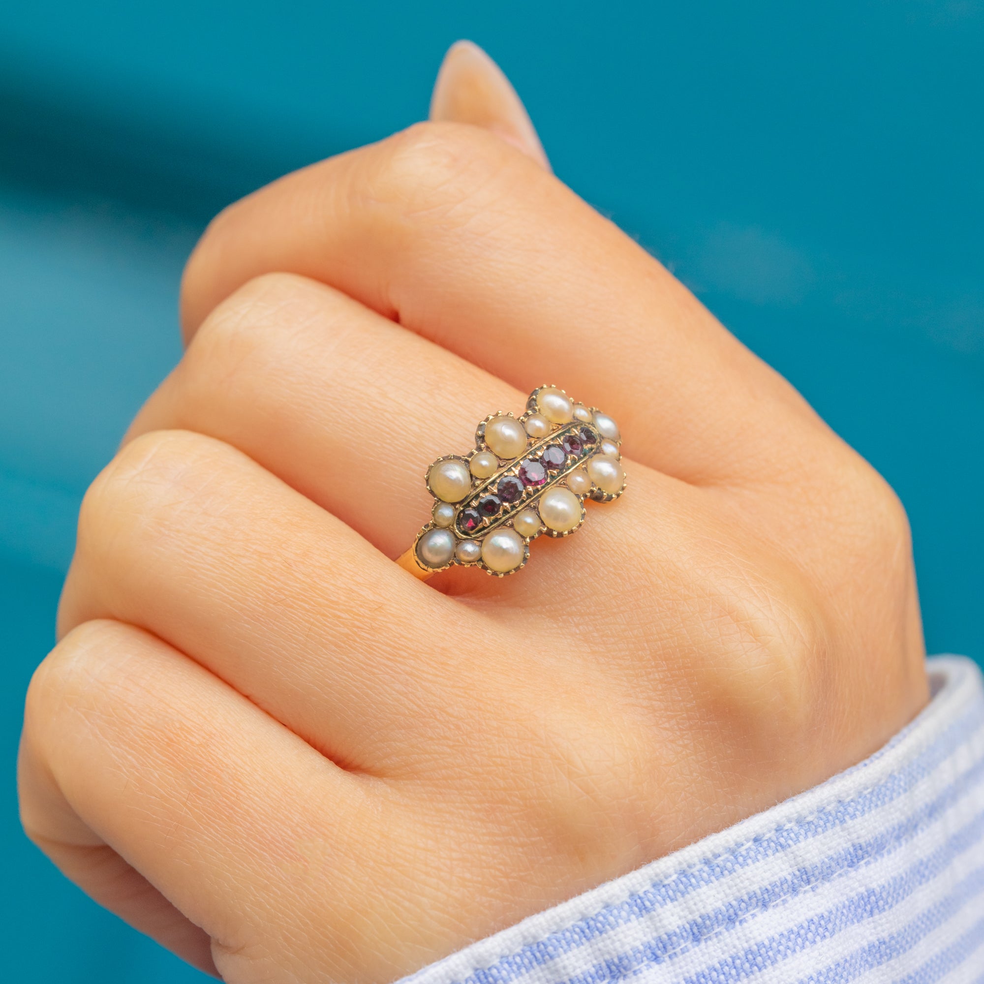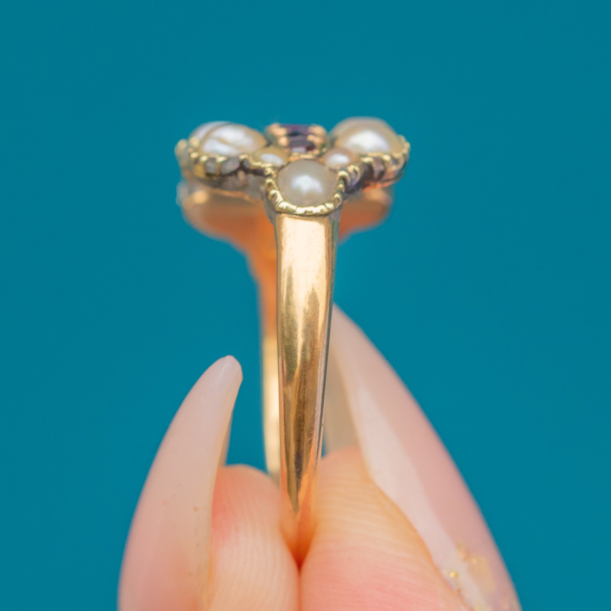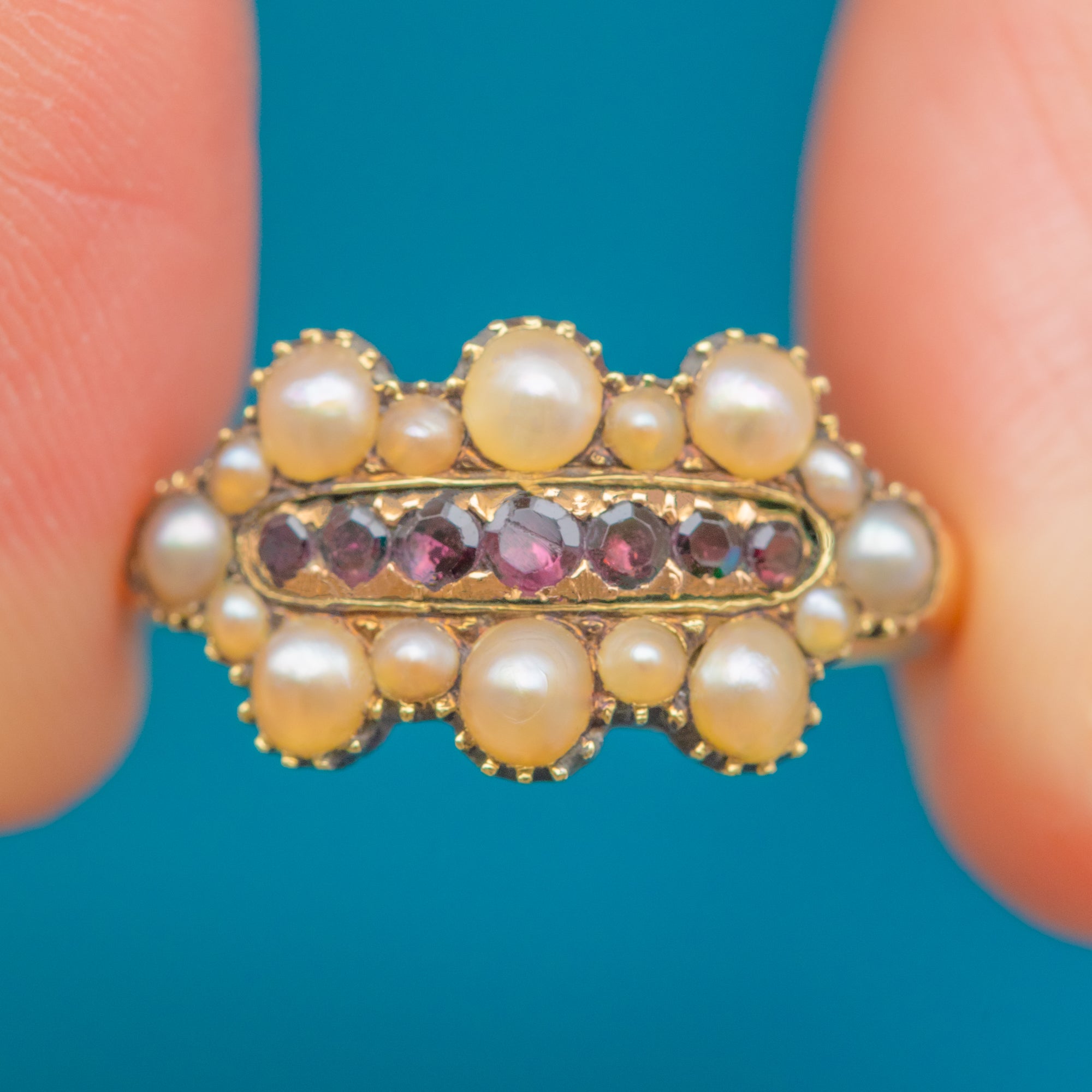 EXCELLENT: Closed backs intact and tidy; Pearls are smooth and well-matched, Garnets bright and securely set. Shank and shoulders are strong with crisp detail. All stones appear original with no signs of repair—a superbly cared-for Georgian ring.