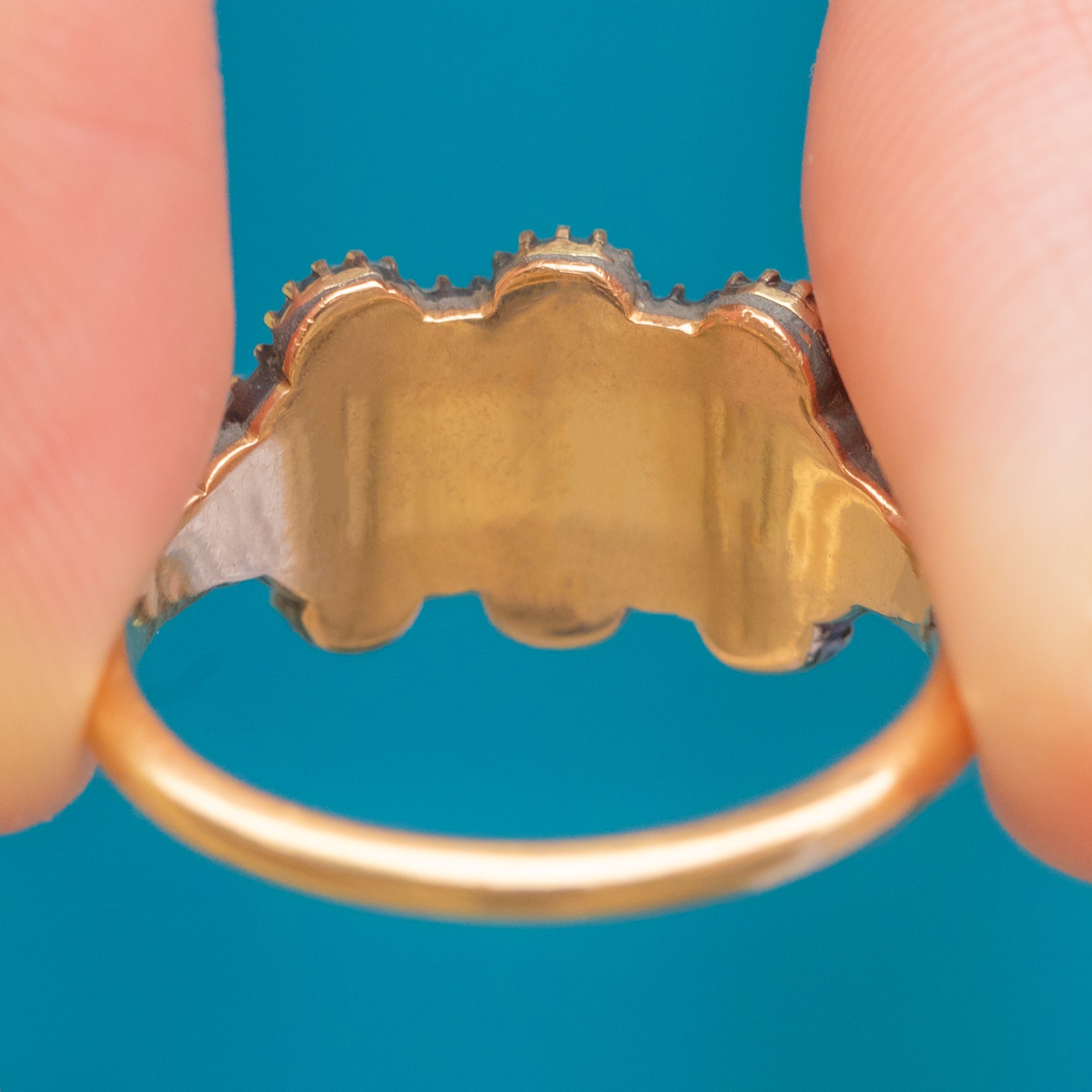 A beautiful Georgian plaque ring set with lustrous natural Pearls and a row of deep red Garnets, all in rich 18ct Gold. The classic closed-back settings enhance the gemstones’ glow and are typical of late 18th–early 19th-century craftsmanship. Elegant and tactile, it’s a wonderfully preserved jewel with timeless romance.