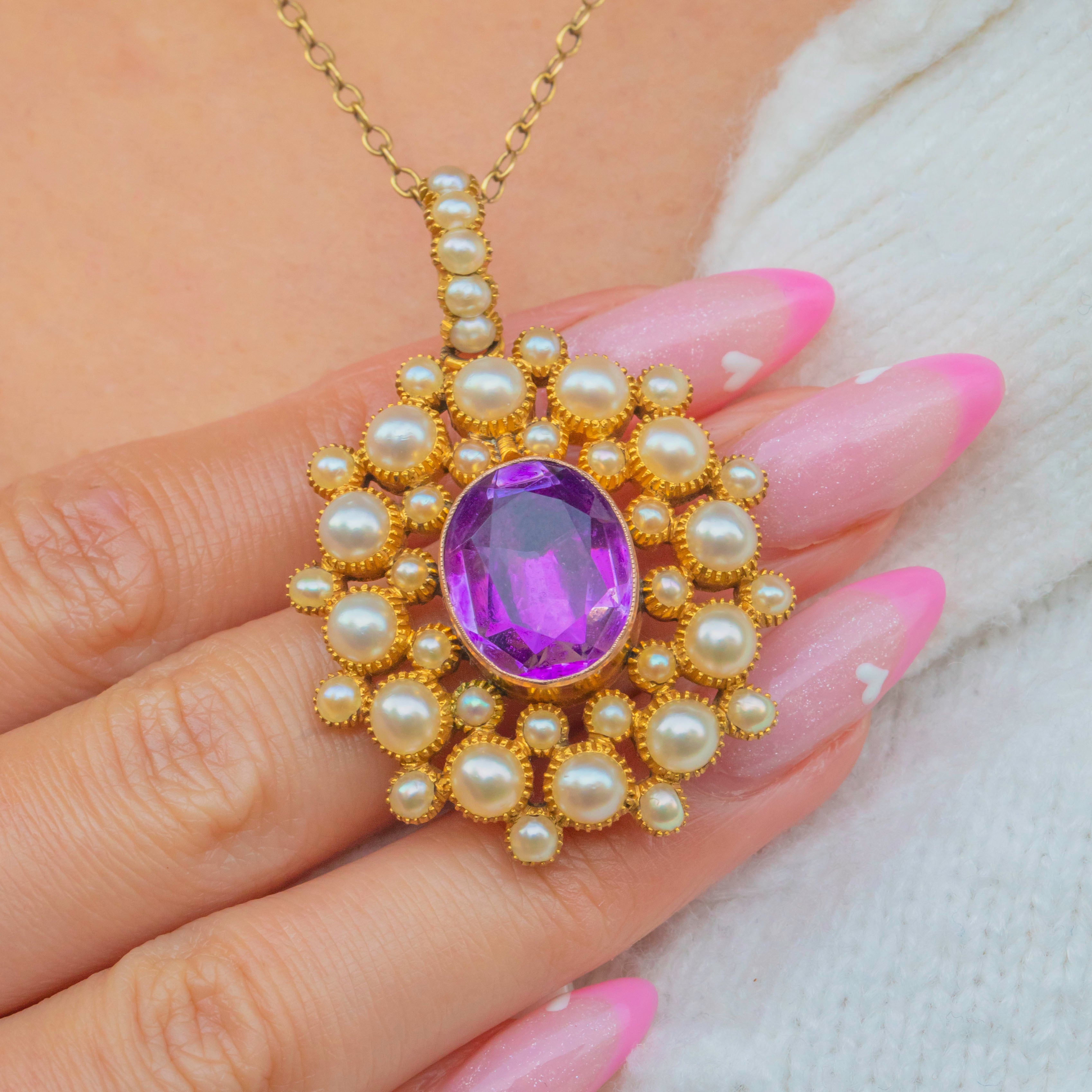 EXCELLENT. This Georgian 18ct Gold Pink Amethyst Pearl cluster pendant is offered in excellent condition. The Amethyst is free from chips or scuffs and is securely held within its 9ct Gold setting. The Pearls are creamy and smooth to the touch, each one has retained its natural nacre. The generous Pearl encrusted bale is robust allowing you to proudly display this phenomenal Georgian pendant from a chain of your choice!