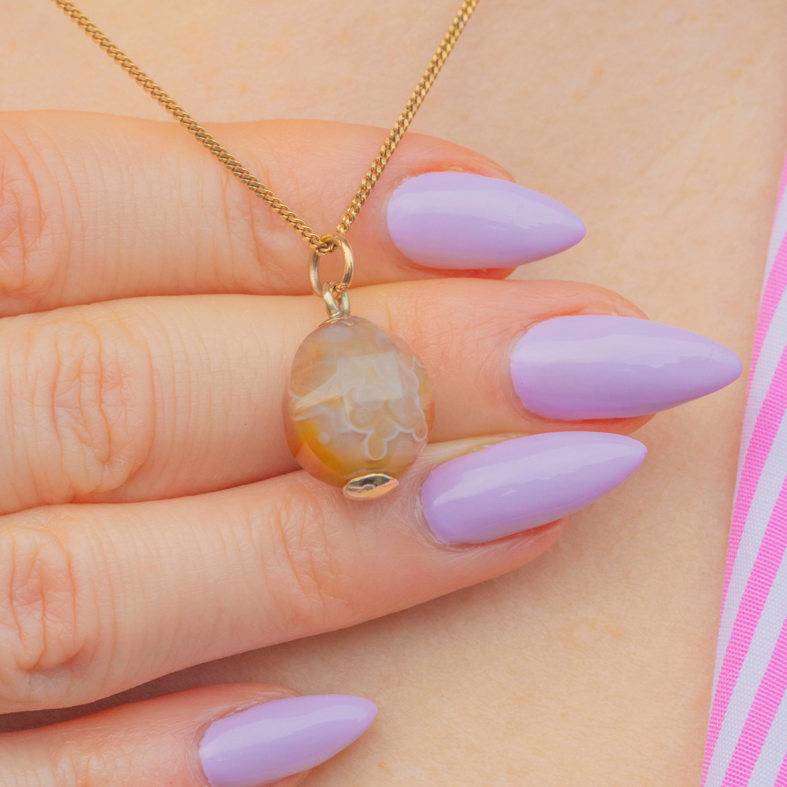 This satisfying Georgian 9ct Gold Agate faceted orb pendant will bring gorgeous earthy tones to your collection! The Agate displays striations of neutral hues that swirl delicately across the lightly curved faceted form, perfectly complemented by buttery 9ct Gold creating an elegant colour palette.