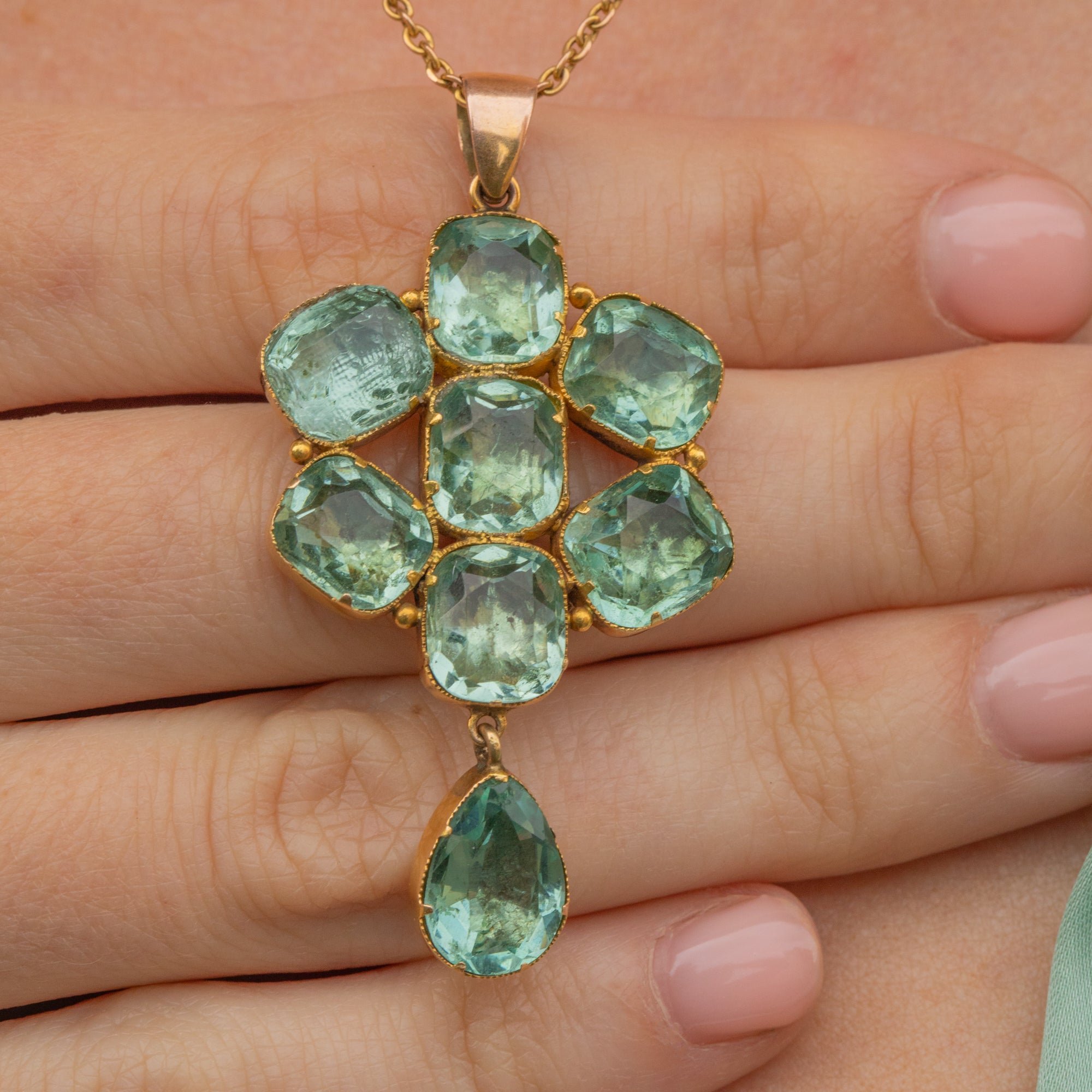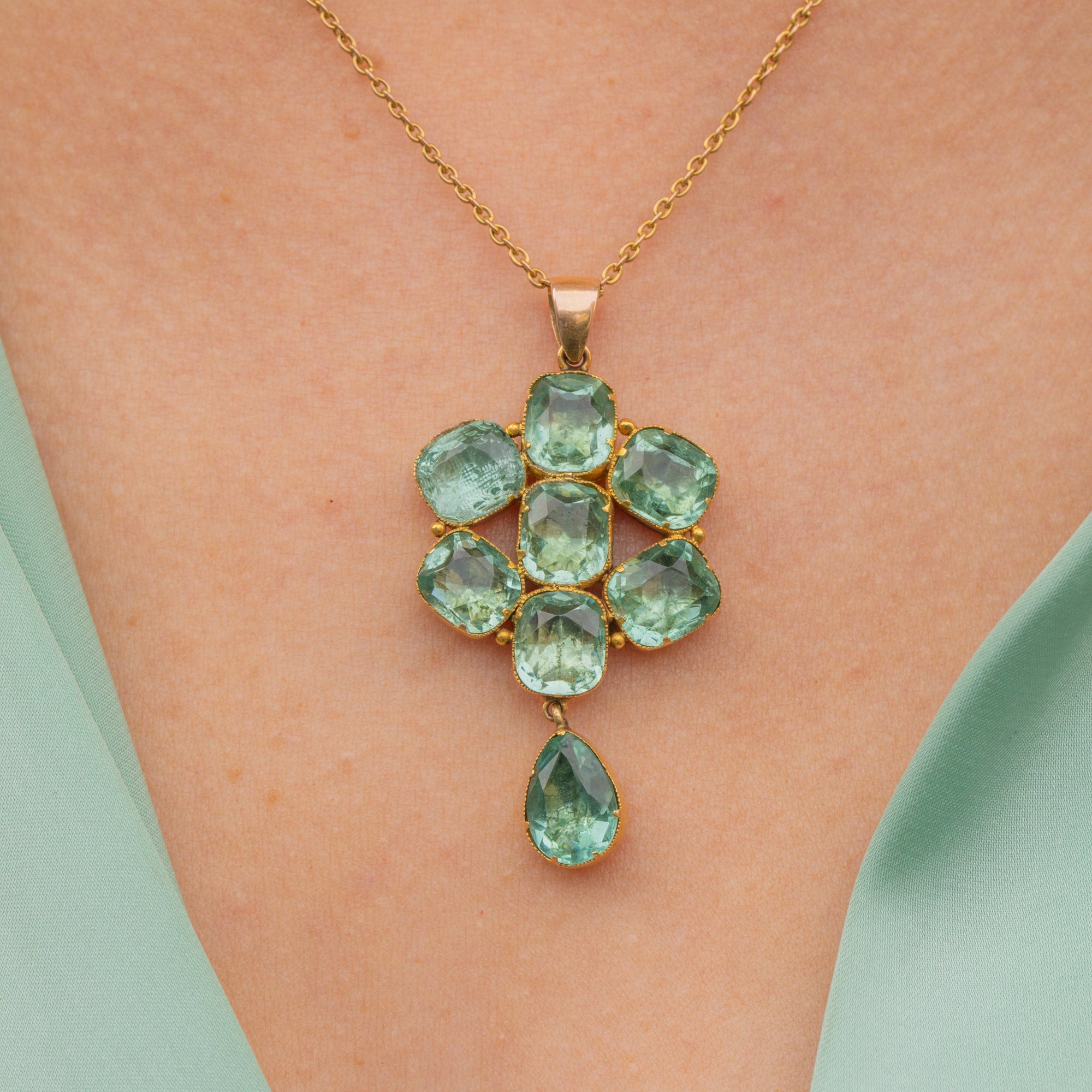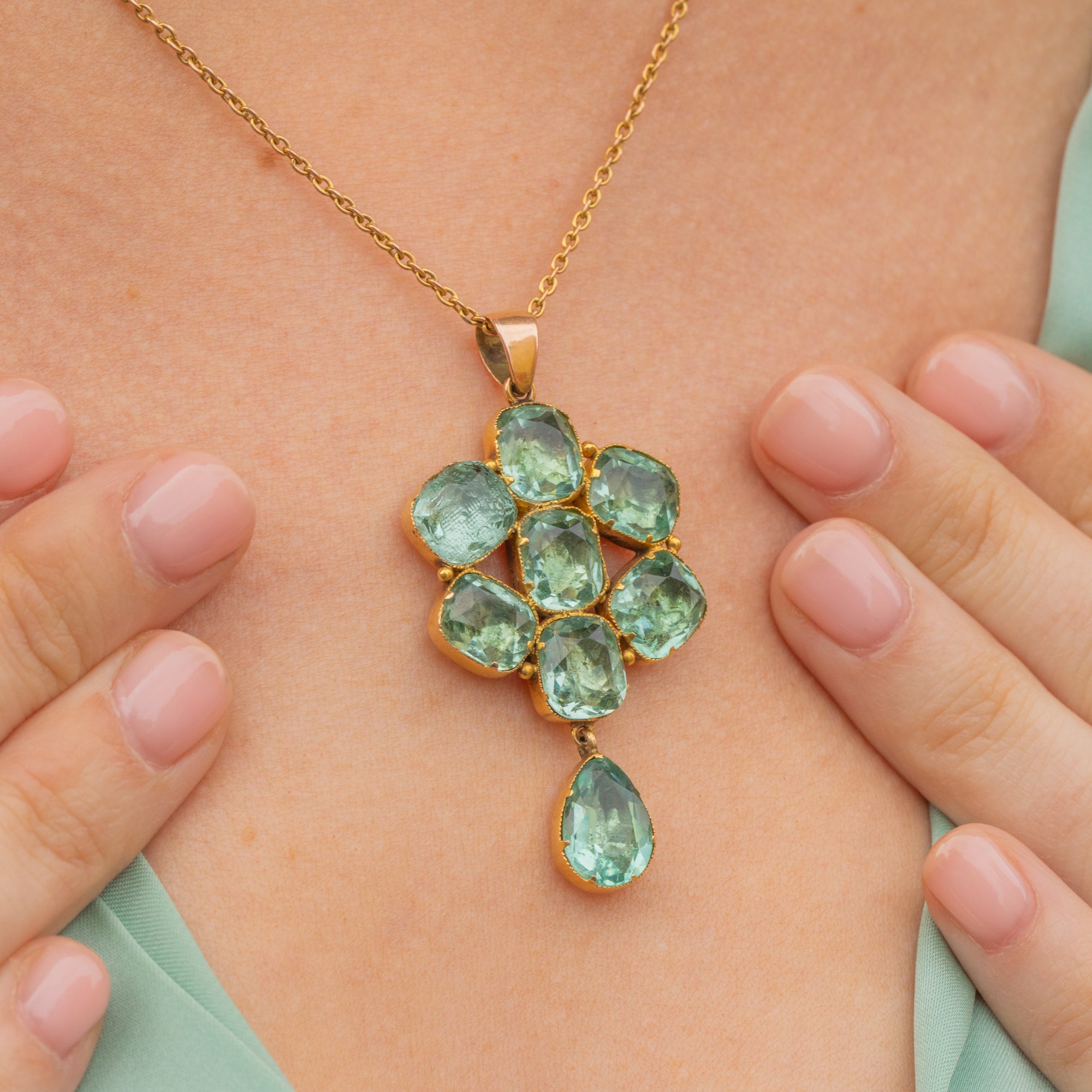 We can't keep our eyes off this Georgian blue Paste cluster drop pendant! Crafted from 9ct Gold and set with minty Paste gemstones, this pendant will be like a breath of fresh air in your collection.