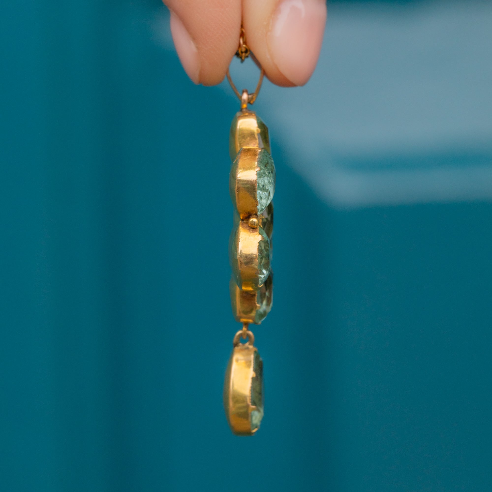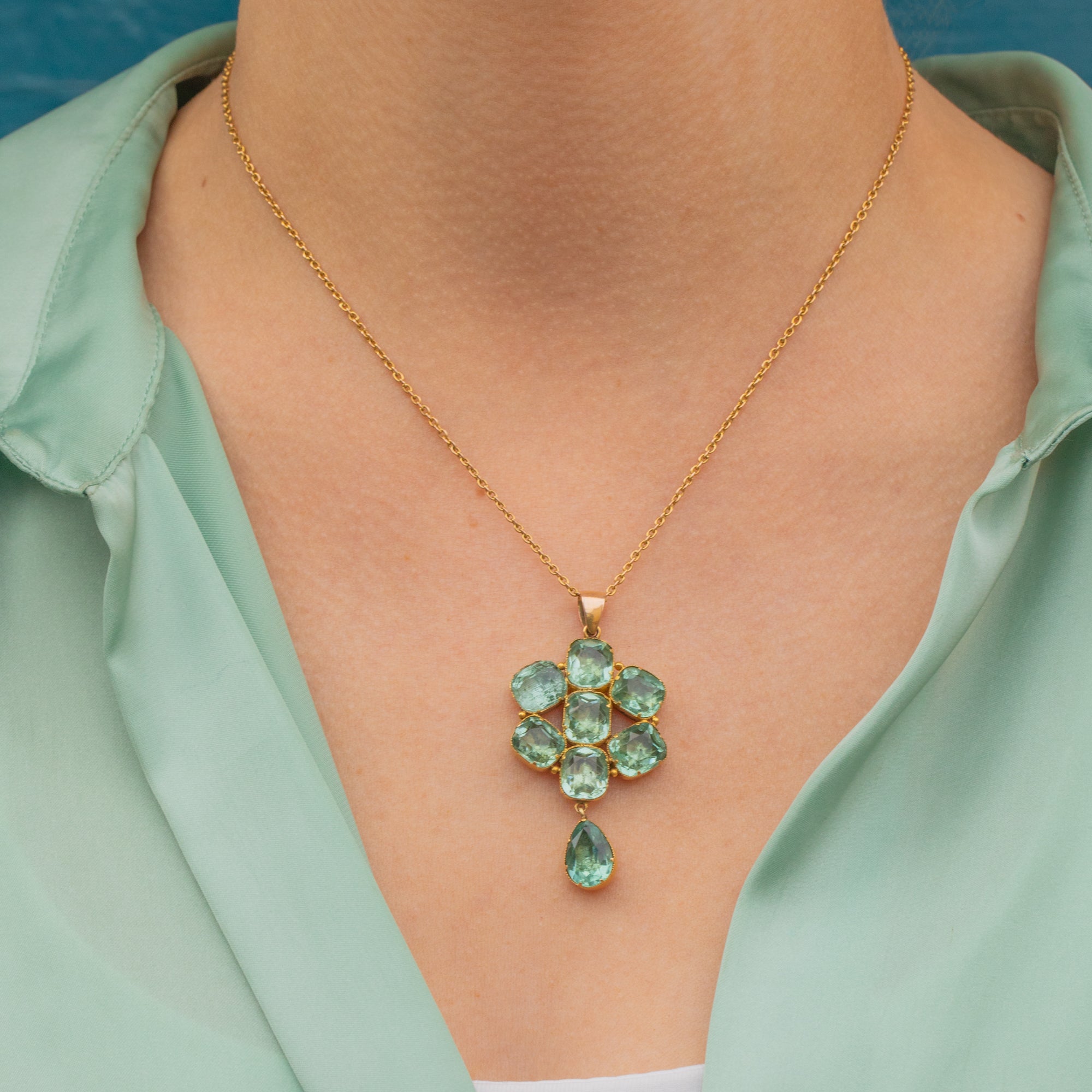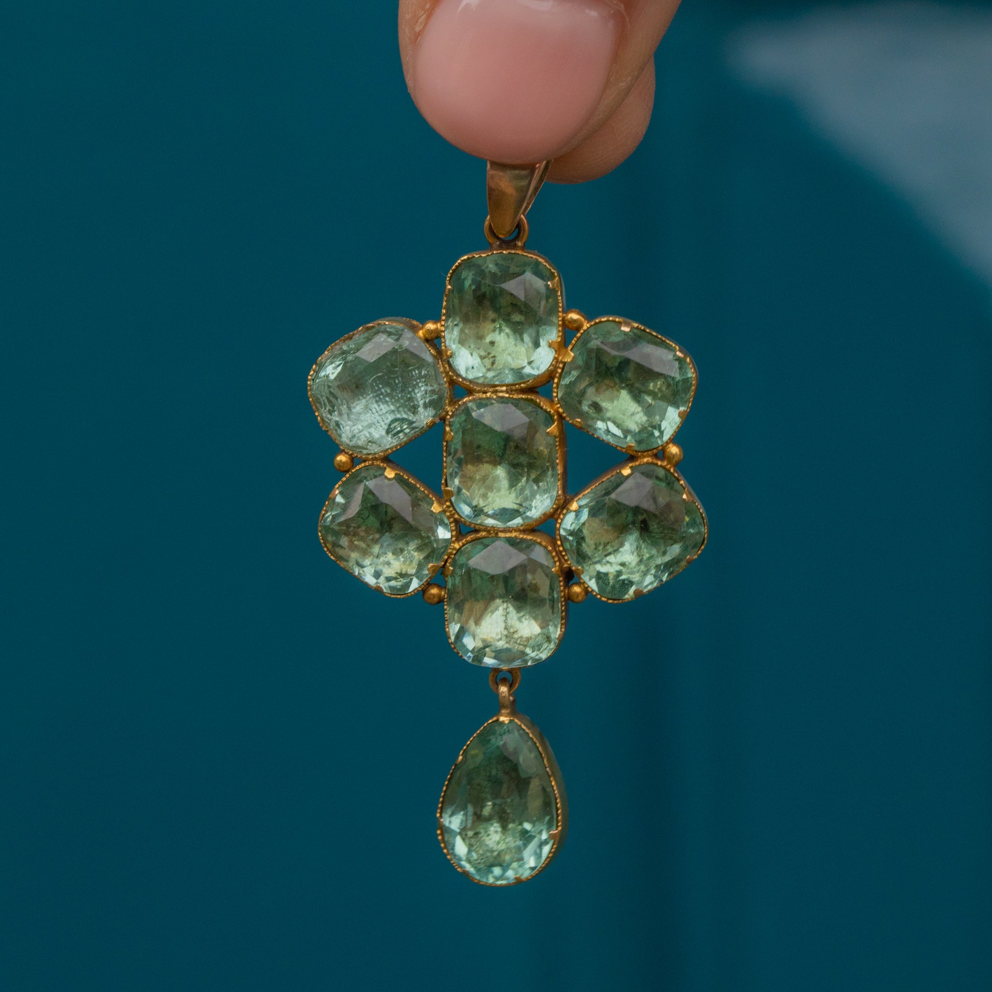 We can't keep our eyes off this Georgian blue Paste cluster drop pendant! Crafted from 9ct Gold and set with minty Paste gemstones, this pendant will be like a breath of fresh air in your collection.