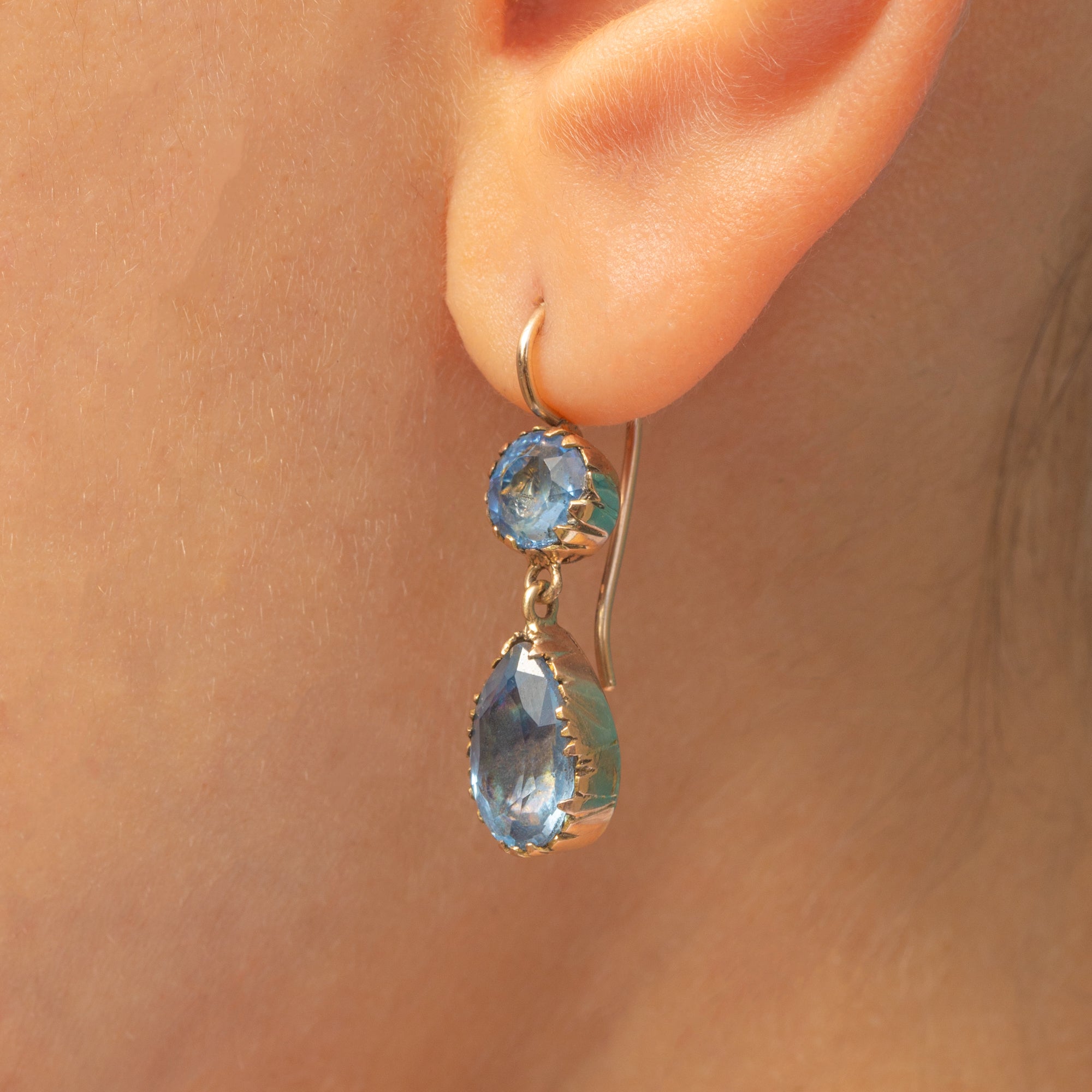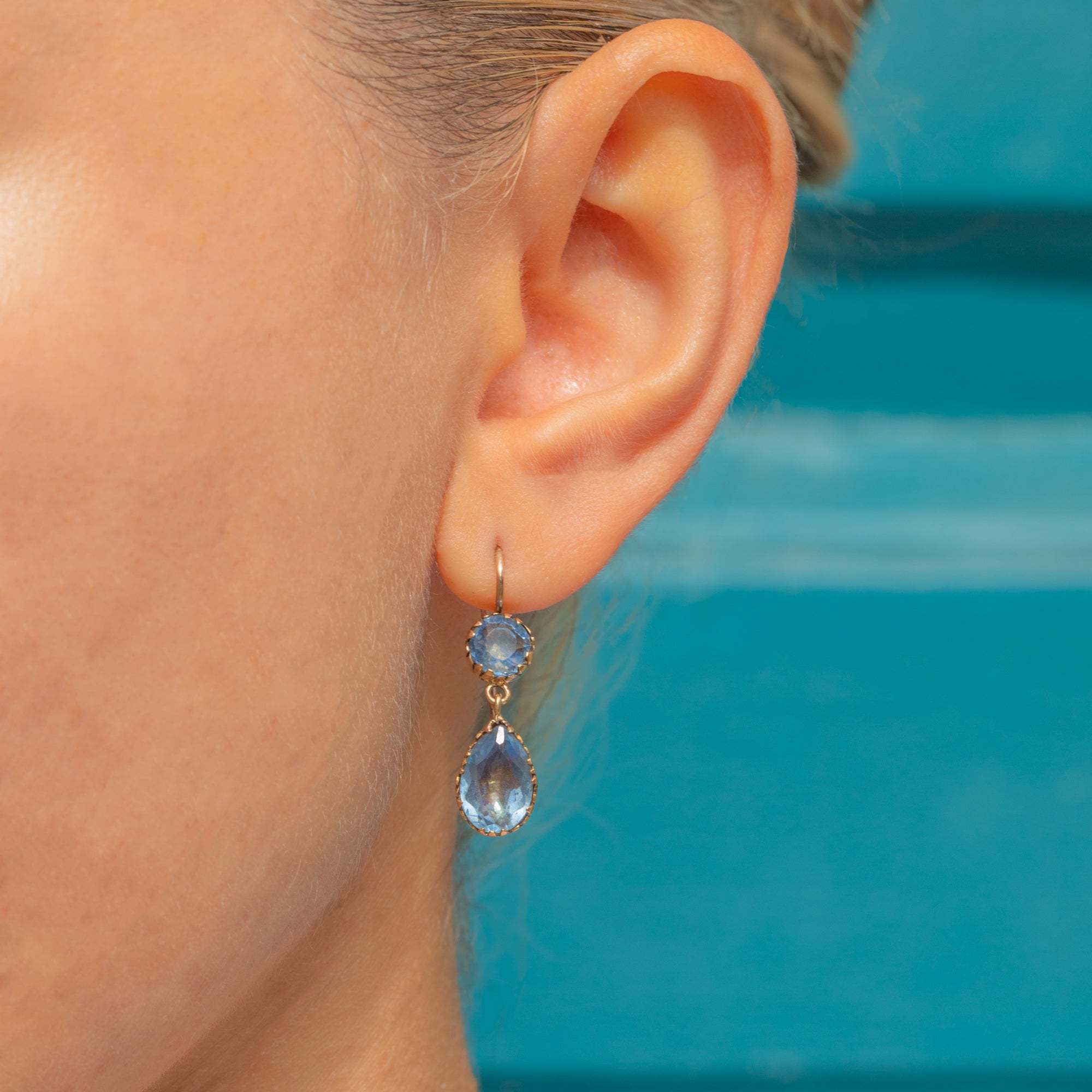 With closed backs, the stones are set in glossy 9ct Gold; the warmth of the Gold effortlessly complements the cool tones of the aqua blue Paste. Dancing with movement as they suspend from elongated hooks, these Georgian earrings are a resplendent antique pair to add to your collection.