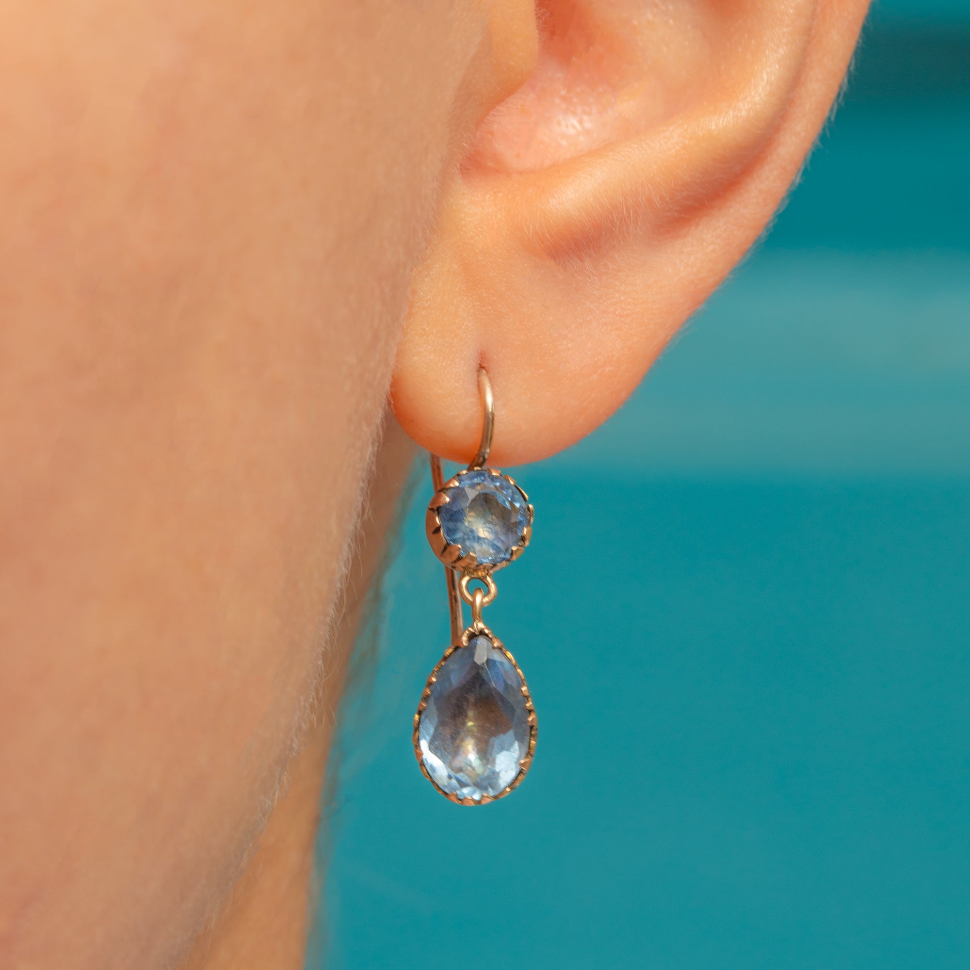 This gorgeous pair of antique earrings each suspends two vibrant blue faceted Paste stones, foiled for added vibrancy, and set in classically Georgian settings.
