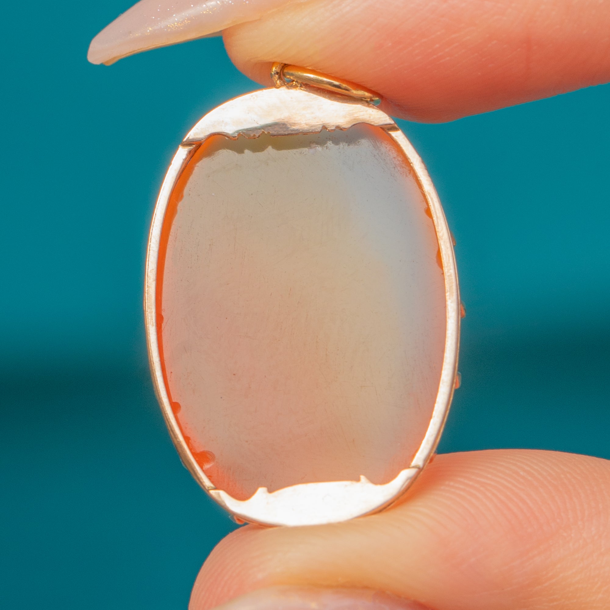This Georgian pendant presents a striking oval cabochon Carnelian, its warm, natural hues ranging from soft honeyed translucence to deep orange. The stone is held securely in a delicate 9ct Gold claw setting, which allows the full play of colour and natural banding to show through with beautiful effect.