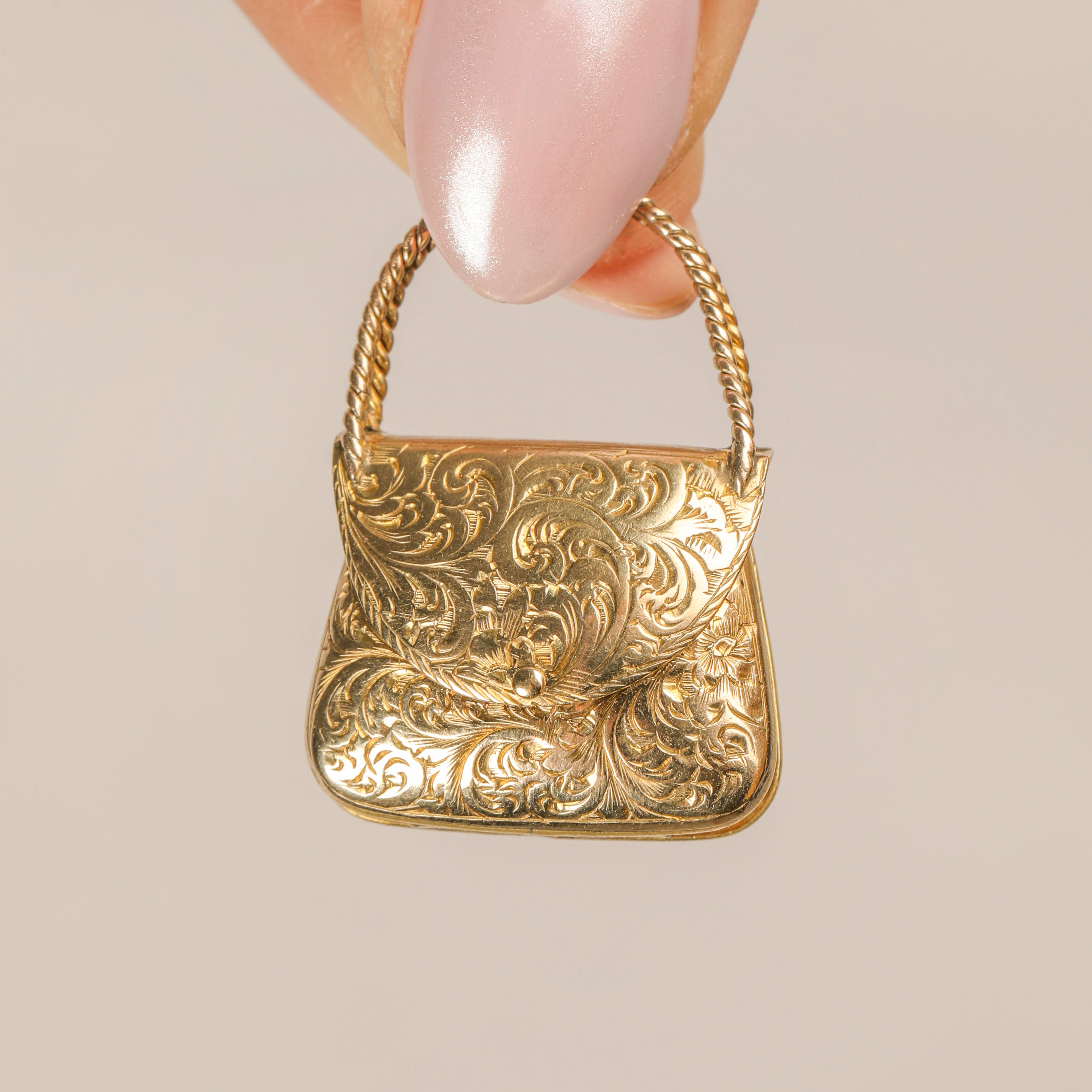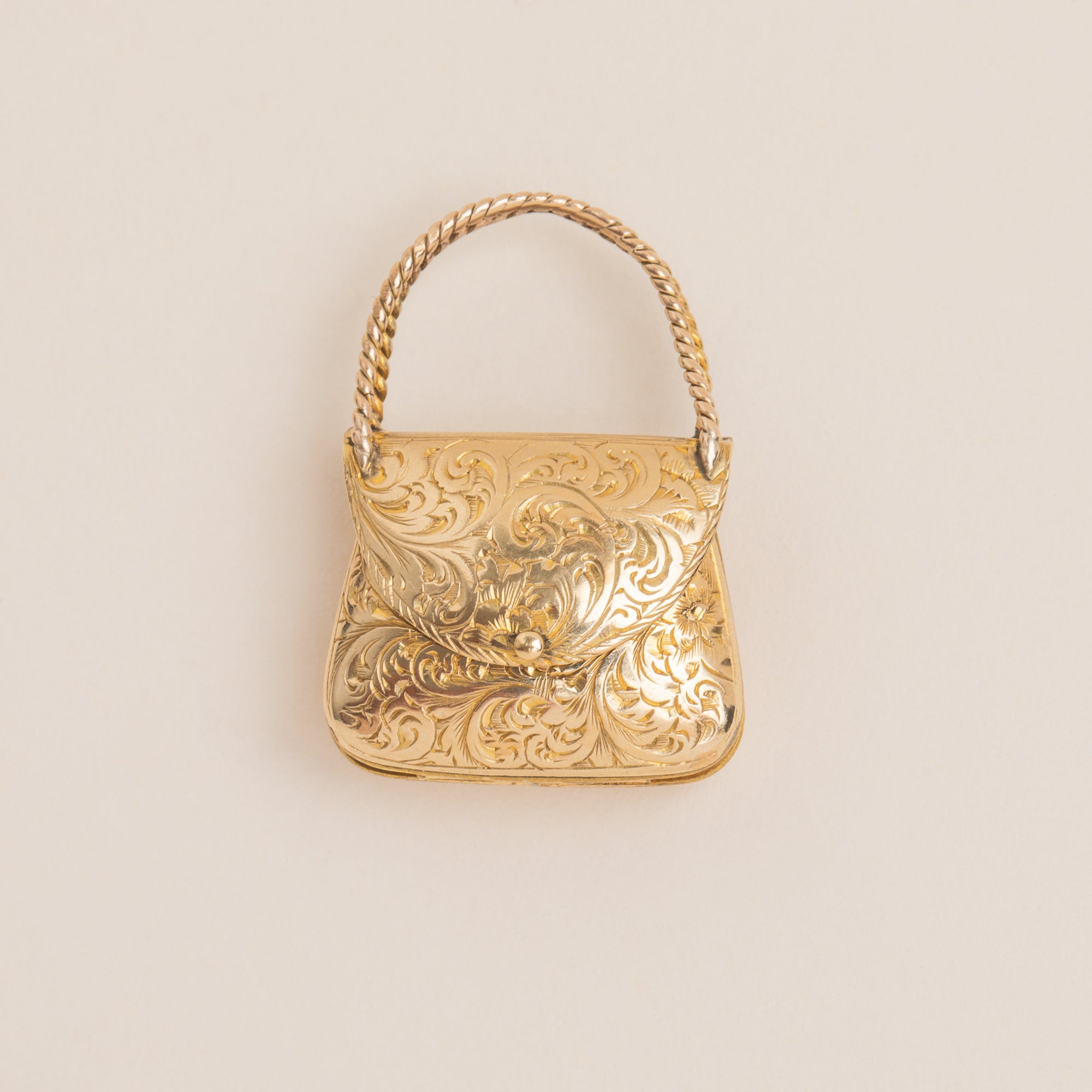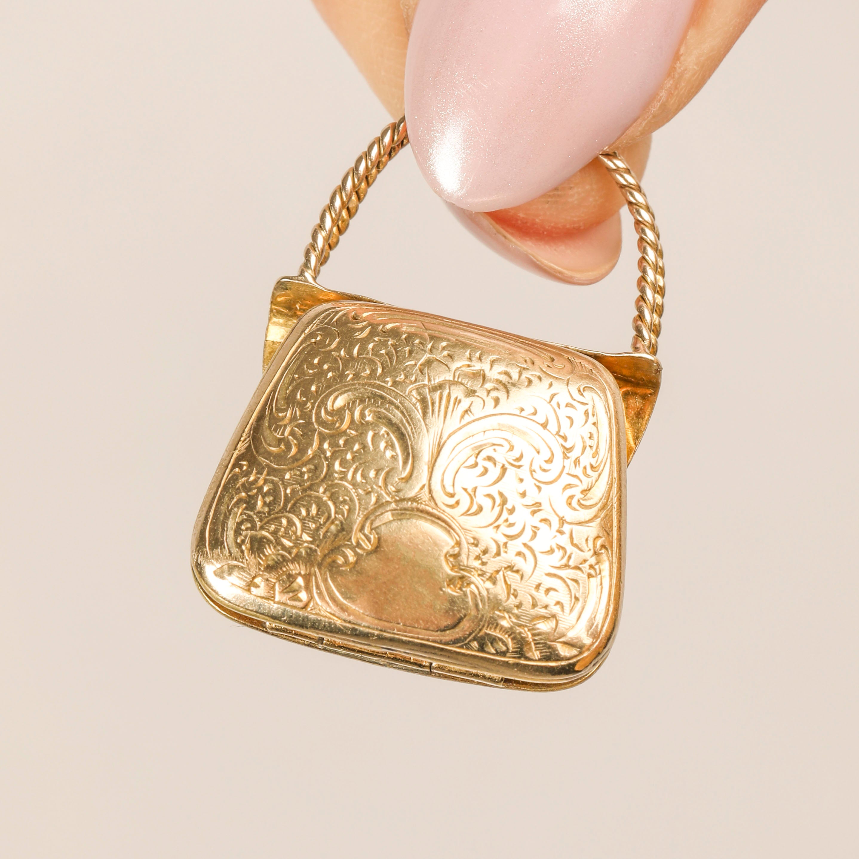 For those whose wardrobe is bursting with the prettiest collection of handbags, this Georgian 9ct Gold engraved handbag locket pendant was made for you! Crafted entirely from buttery 9ct Gold, this Georgian pendant is inlaid with delicate acanthus leaf engravings adorning the front with a handle made from twisted Gold-toned rope from which you can hold or suspend her.