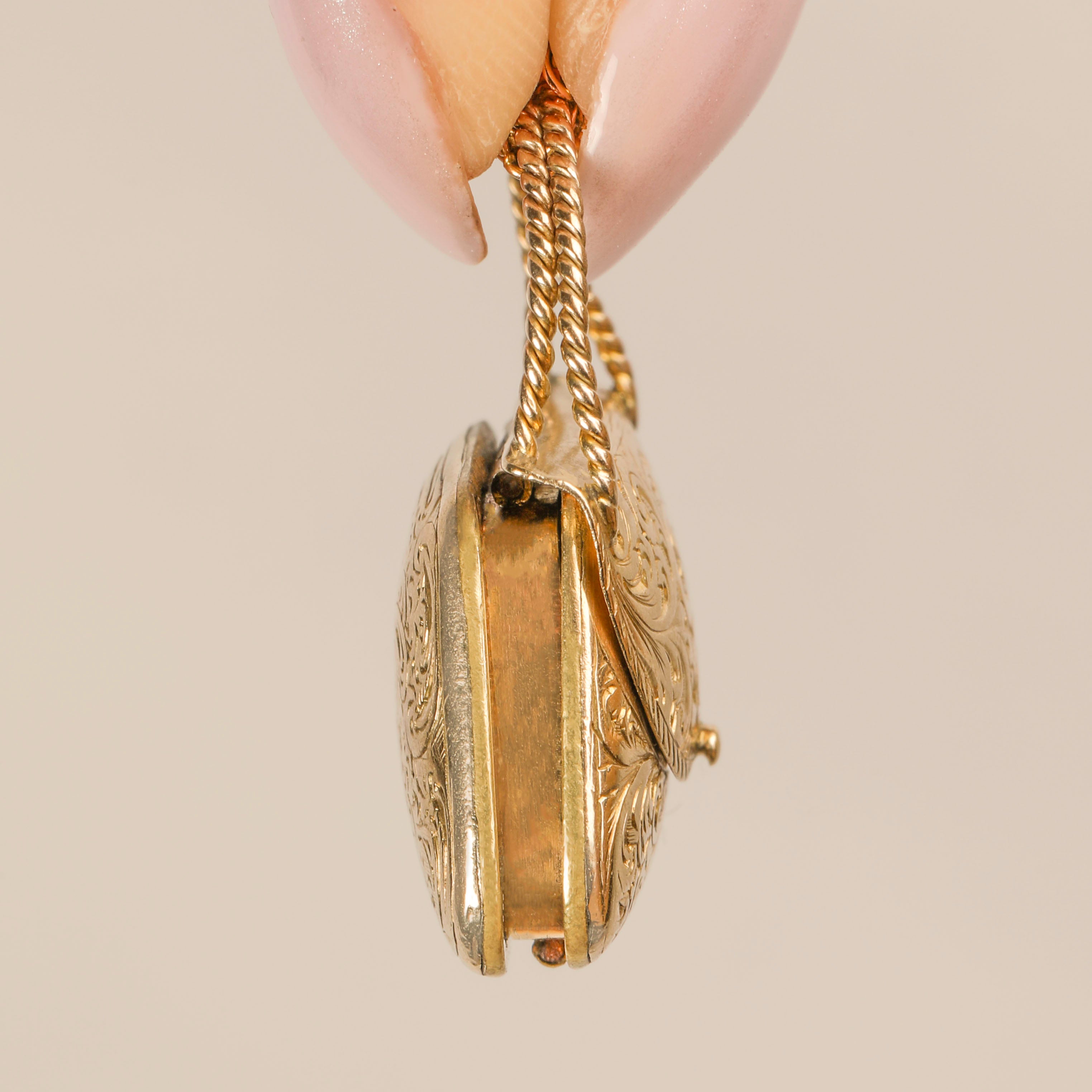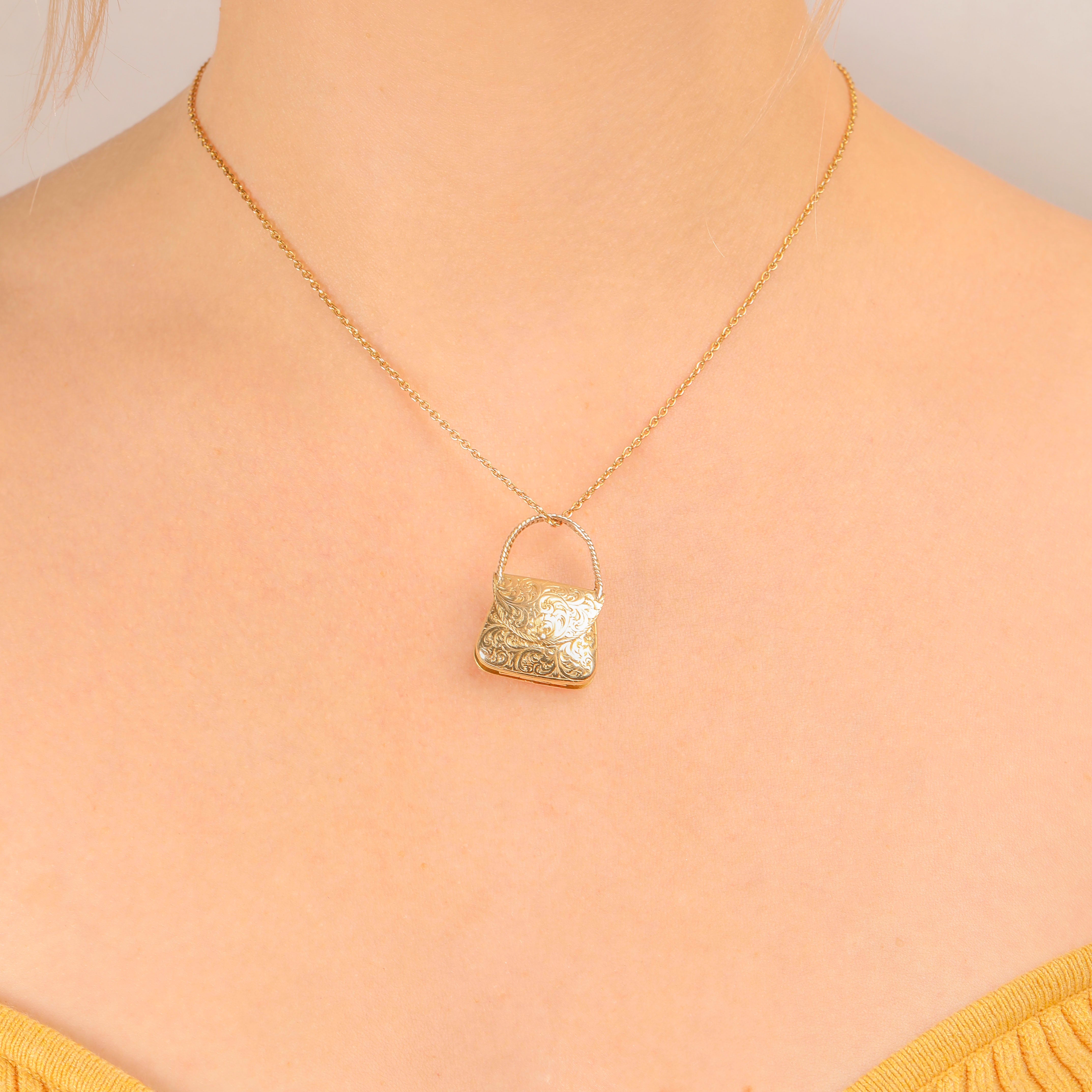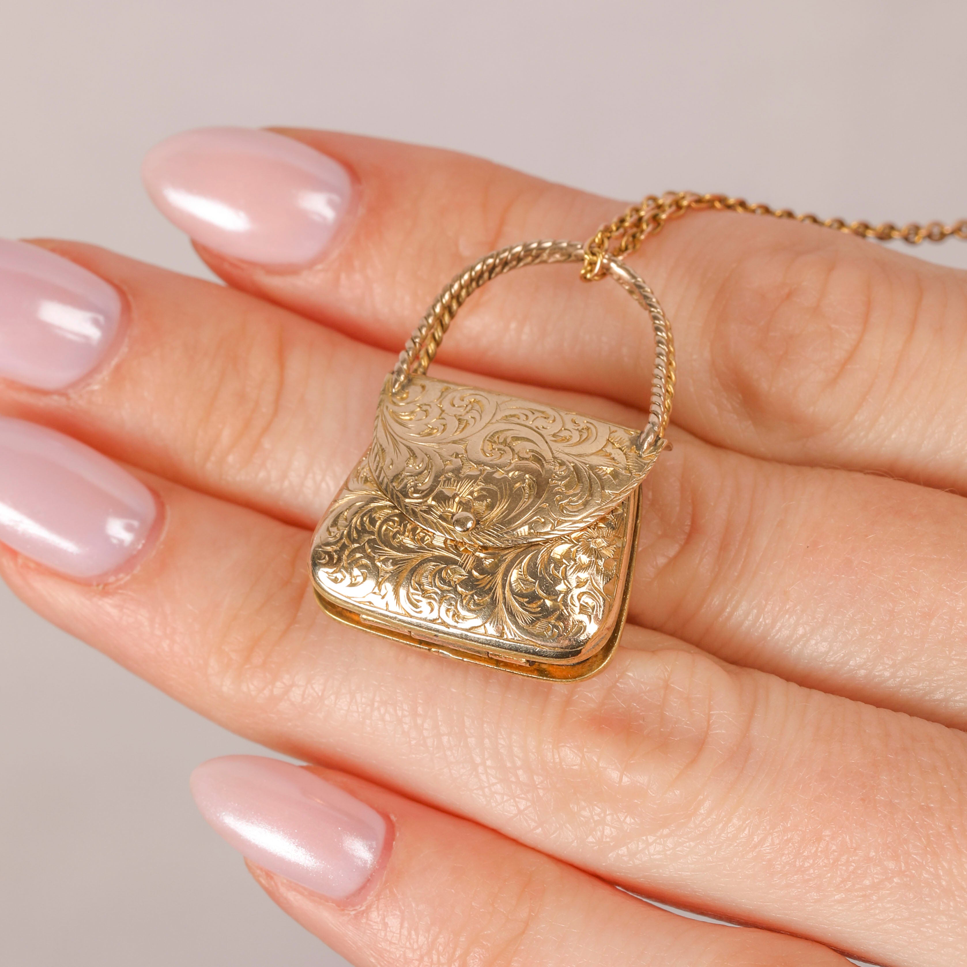 VERY GOOD-EXCELLENT. This Georgian 9ct Gold engraved handbag locket pendant is in wonderful condition! The handbag itself is well formed with the fold of the bag firmly clicking into place. With her engravings crisp form front to back, the slight discolouration and subtle scratch marks to the inside can be forgiven. With securely soldered handles, this opulent handbag can be worn in confidence!