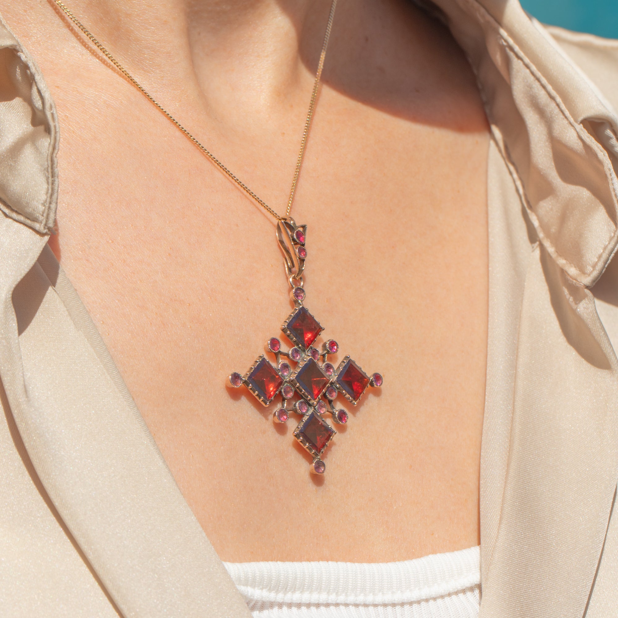 Comprised of eighteen juicy flat-cut sanguine Garnets, this antique pendant is an exemplar of Georgian era craftsmanship. Crafted into a striking cross, her square and round flat-cut Garnets radiate a gorgeous warmth, each displayed within 9ct Gold piecrust settings in classic Georgian style.