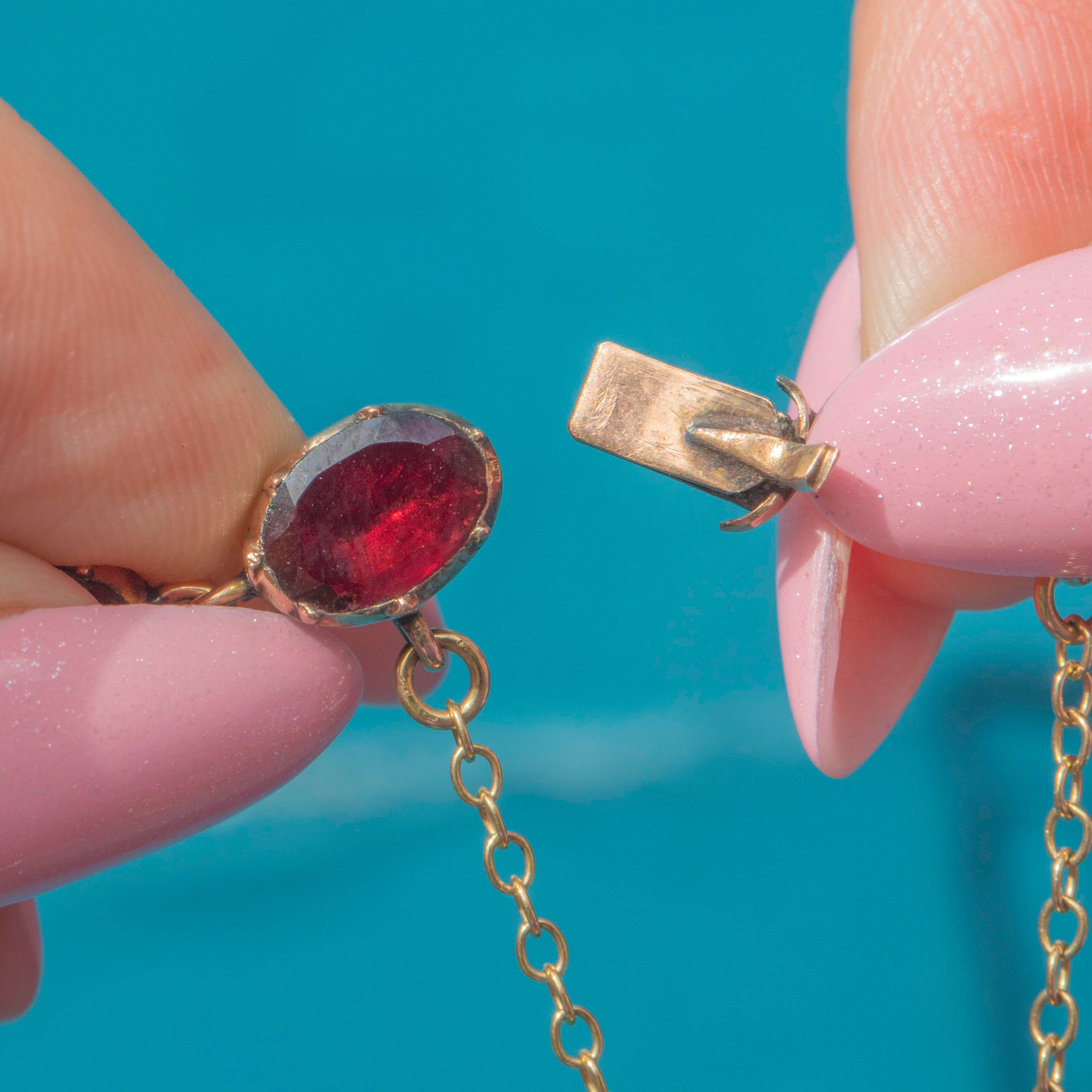 Each foil-backed Garnet has been hand-set in solid 9ct Gold piecrust settings, a typical hallmark of early 1800's craftsmanship.