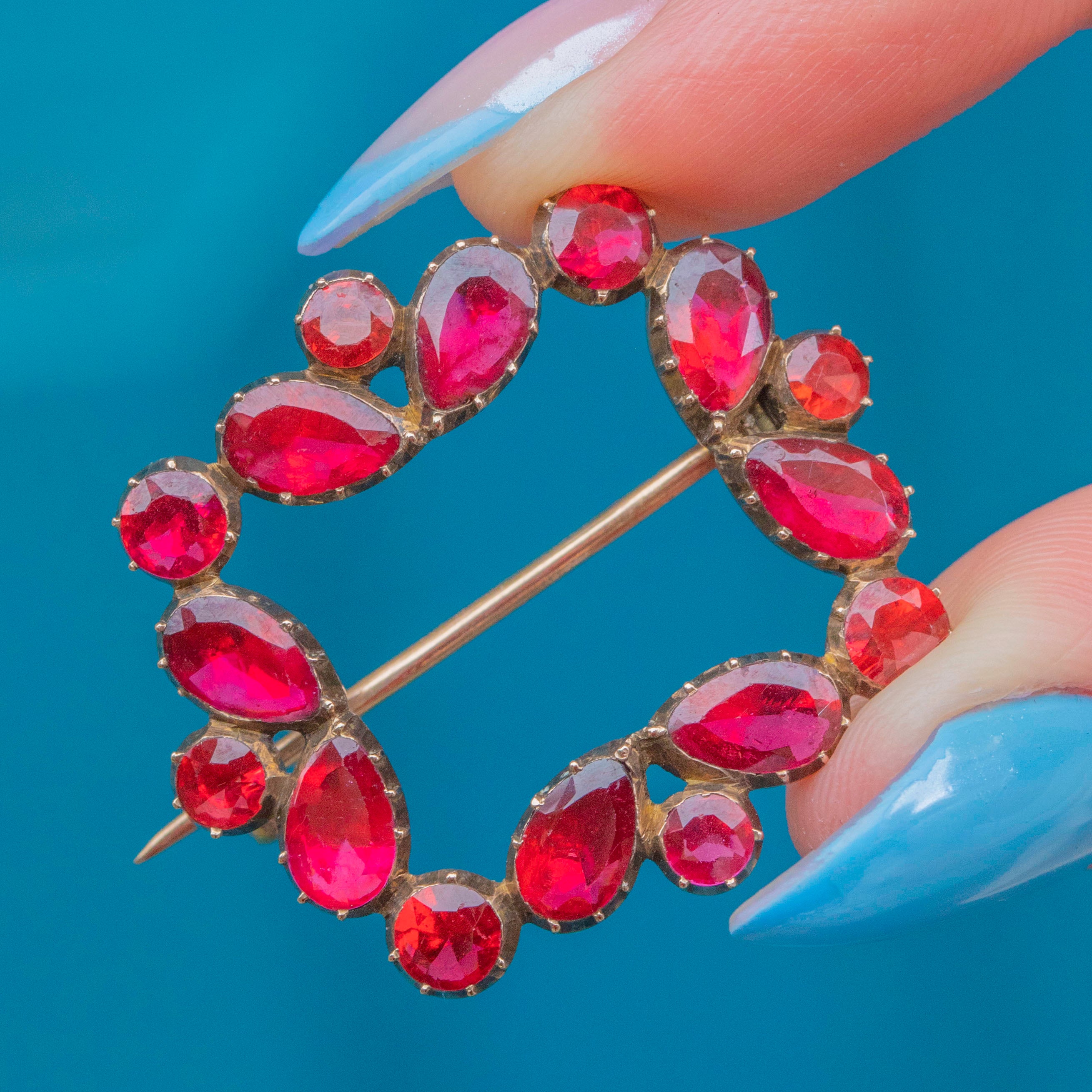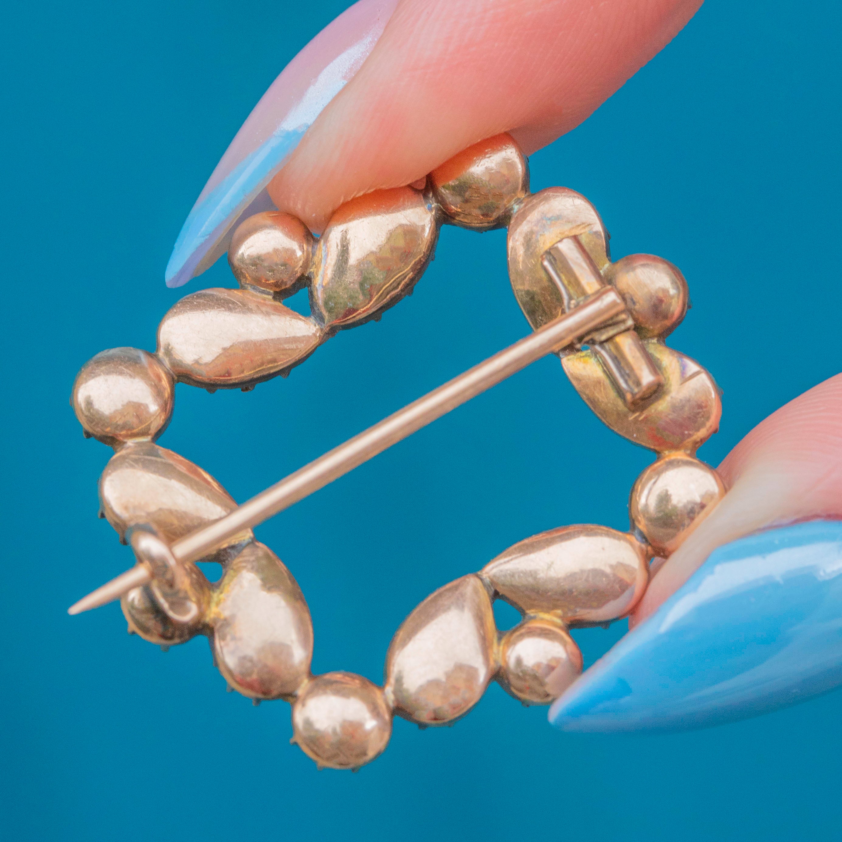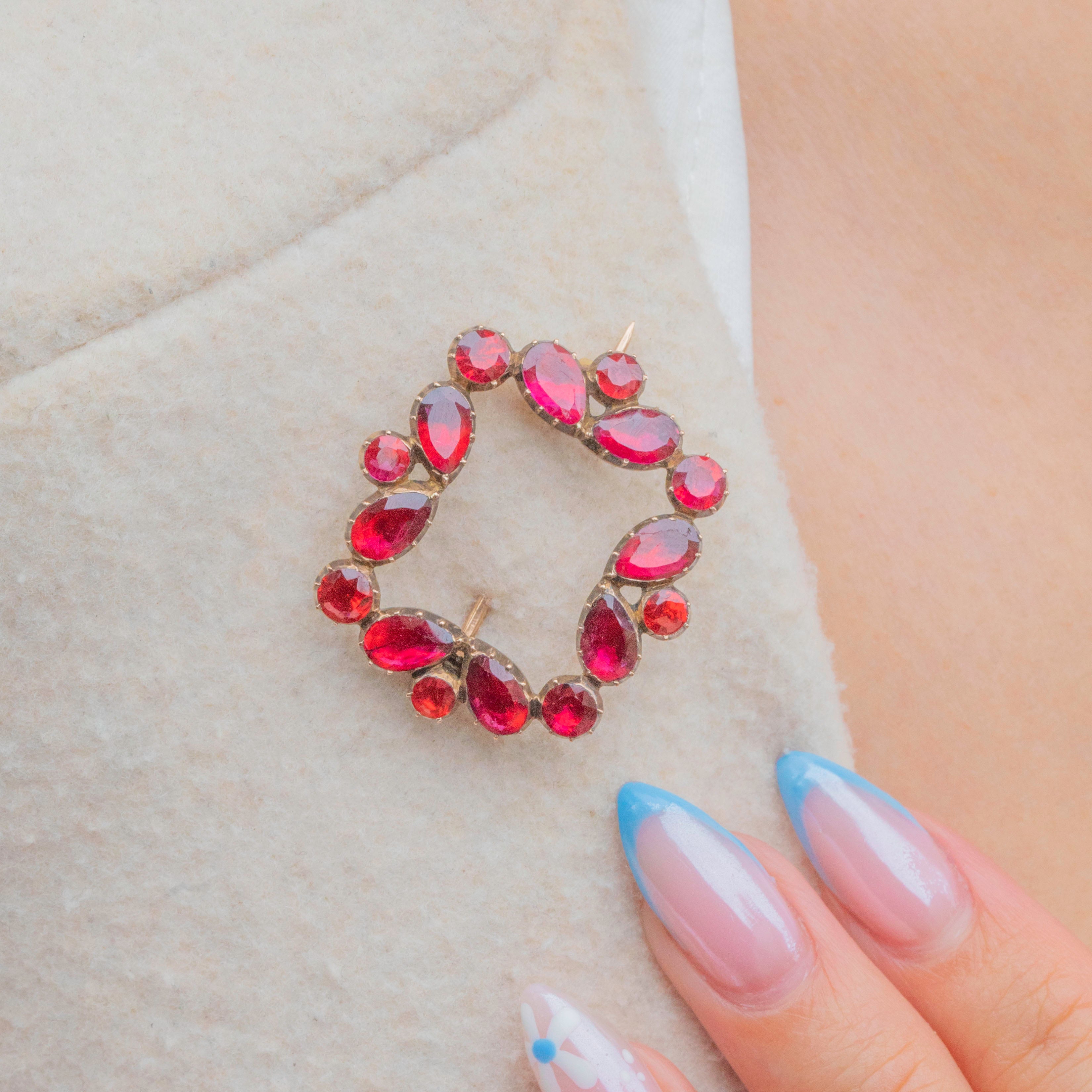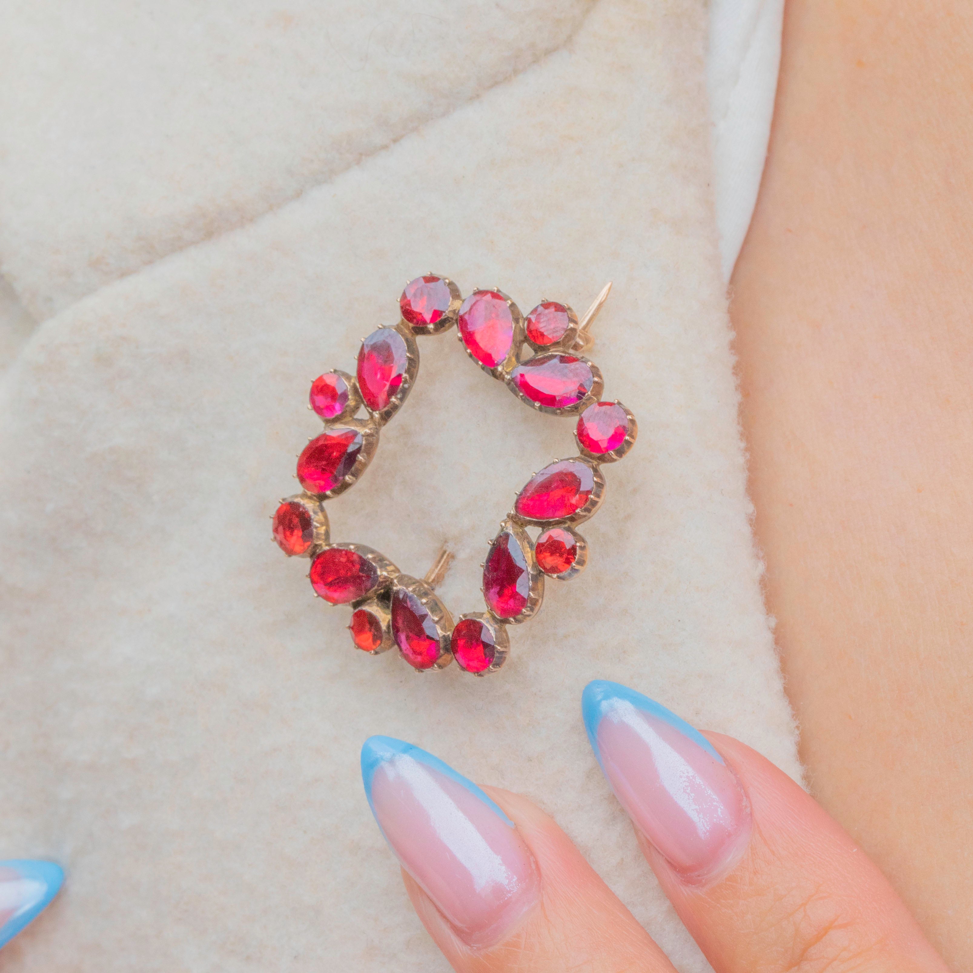This Georgian Garnet brooch perfectly captures the romantic designs of early 19th-century jewellery! Each delicious flat-cut Garnet is displayed within classically Georgian piecrust settings, crafted from solid 9ct Gold for a luxurious finish.