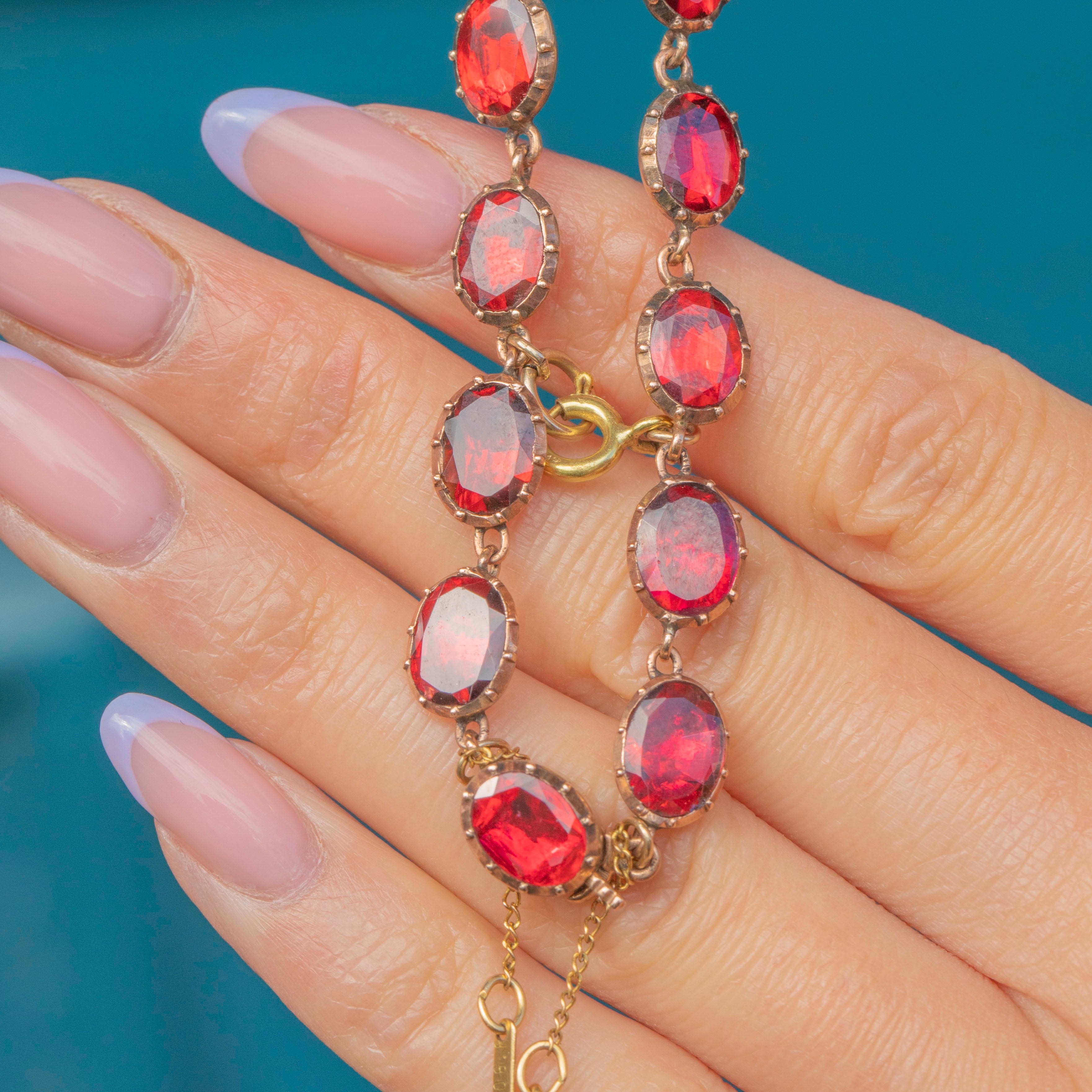 Radiating regency era glamour, this Georgian 9ct Gold flat-cut Garnet riviere necklace is a fabulous piece! Boasting 34 juicy foiled-flat cut Garnets, akin to glistening pools of sangria, this riviere necklace cascades across your décolletage with an undeniable elegance.