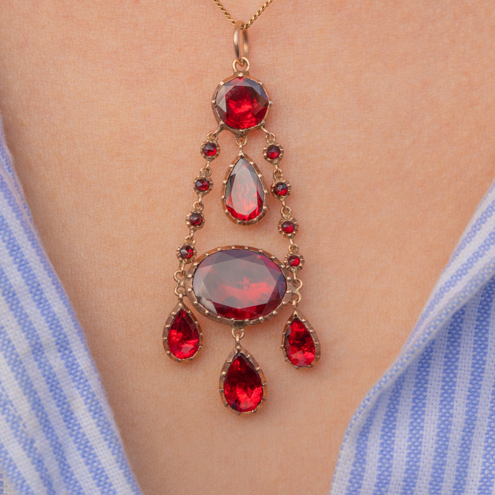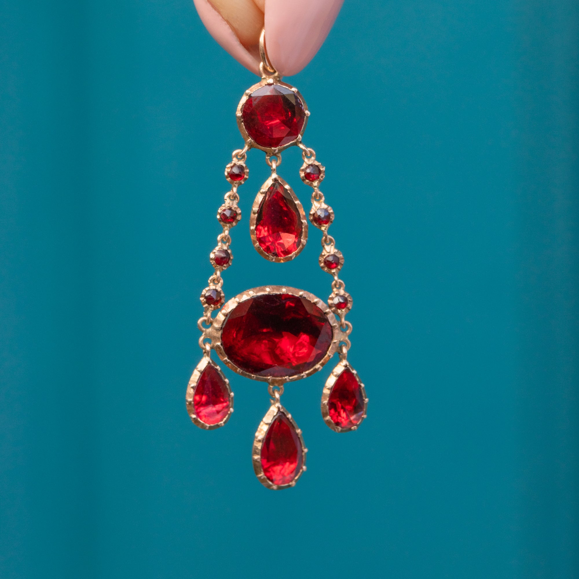 EXCELLENT. We are pleased to present this Georgian 9ct Gold foiled Garnet drop pendant in excellent condition. Her Garnets are radiant, glimmering in the light, and free from scratches or chips. The Gold is luminous and the classically crimped Geogrian settings are defined and hold the Garnets securely. She is truly a must-have!