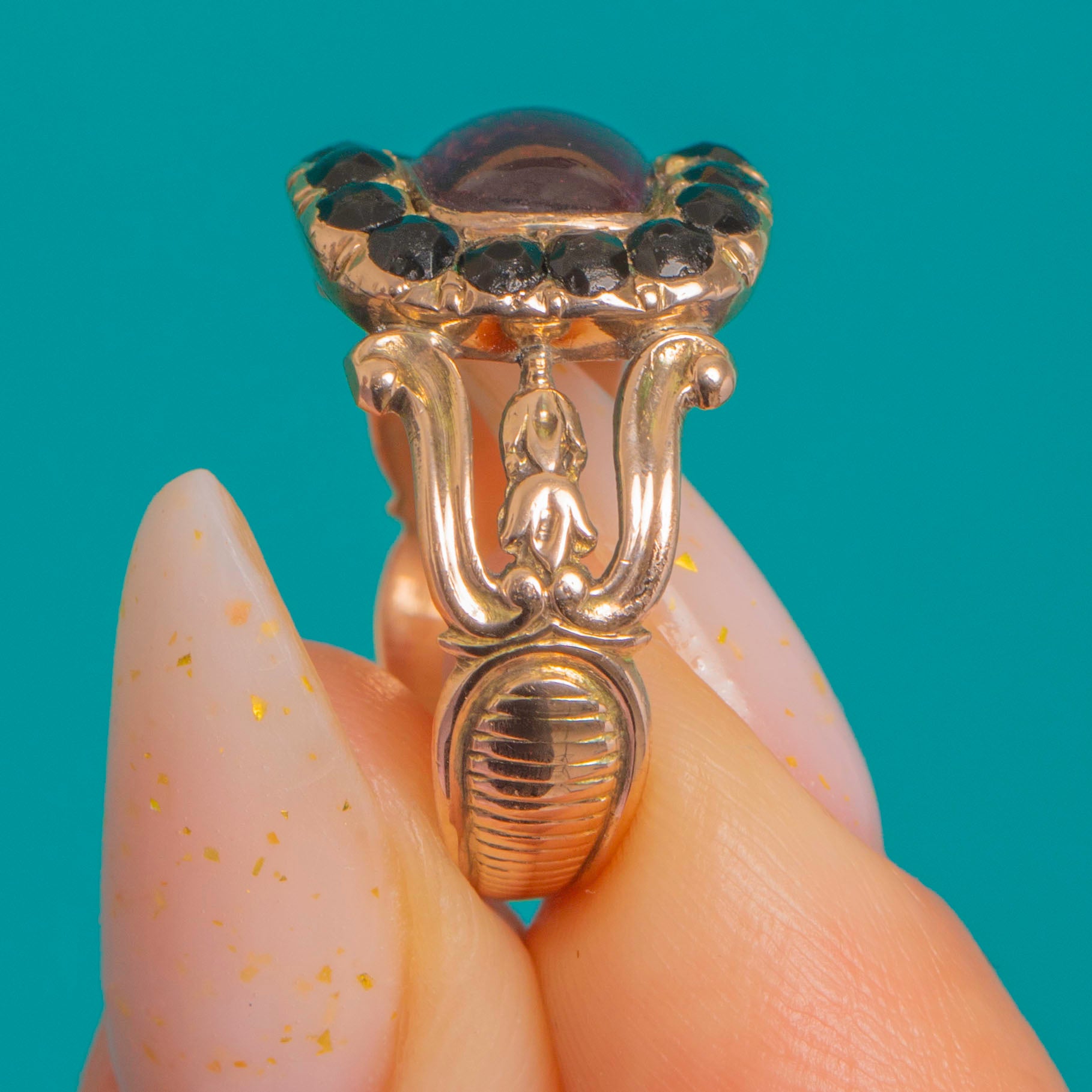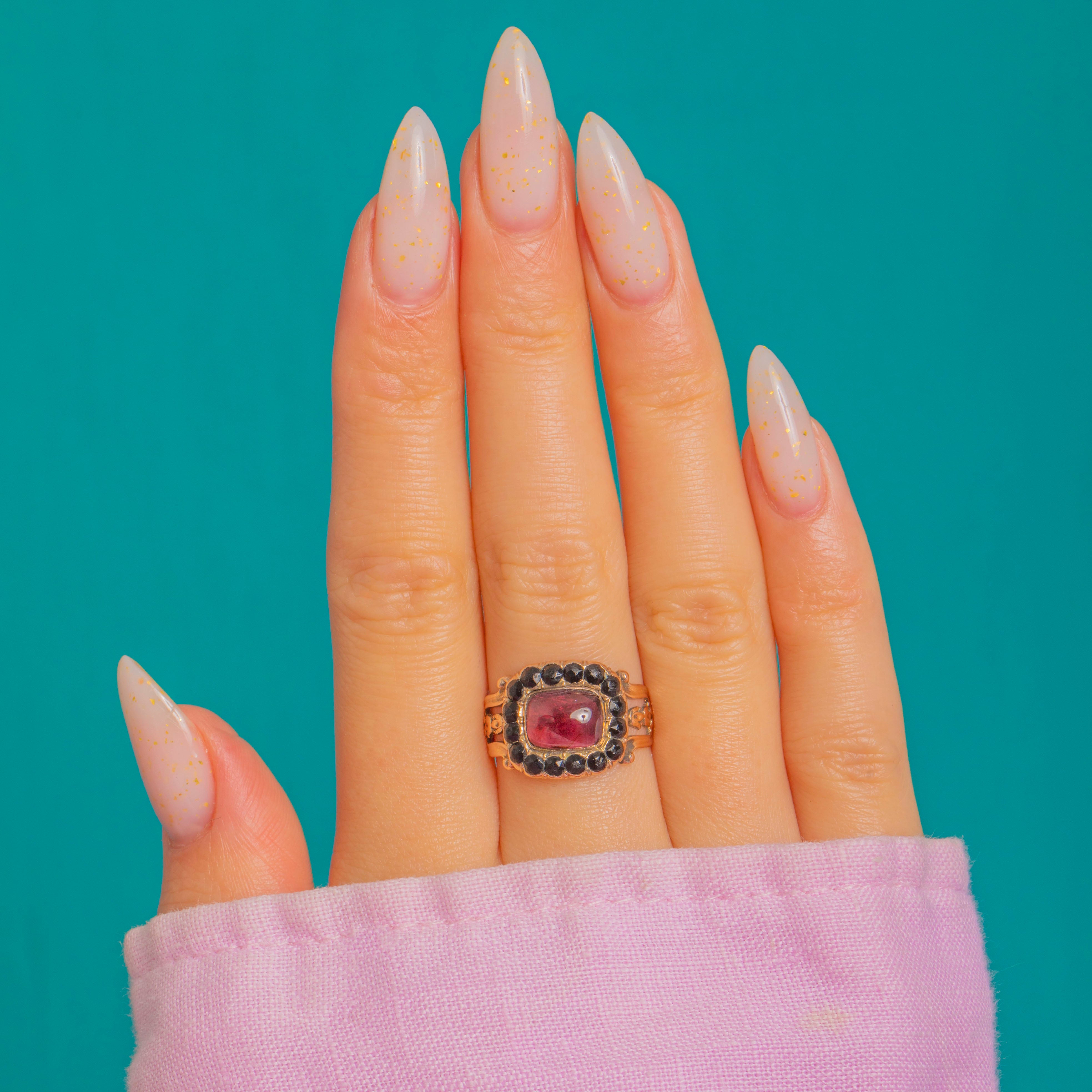 Sublime in its Regency romance, this Georgian mourning ring pairs a deep crimson Garnet cabochon with a halo of inky French Jet, all set in warm 9ct Gold. The cushion-shaped cluster and red-and-black palette are timeless markers of early 19th-century sentiment, rendered with hand-crafted charm.