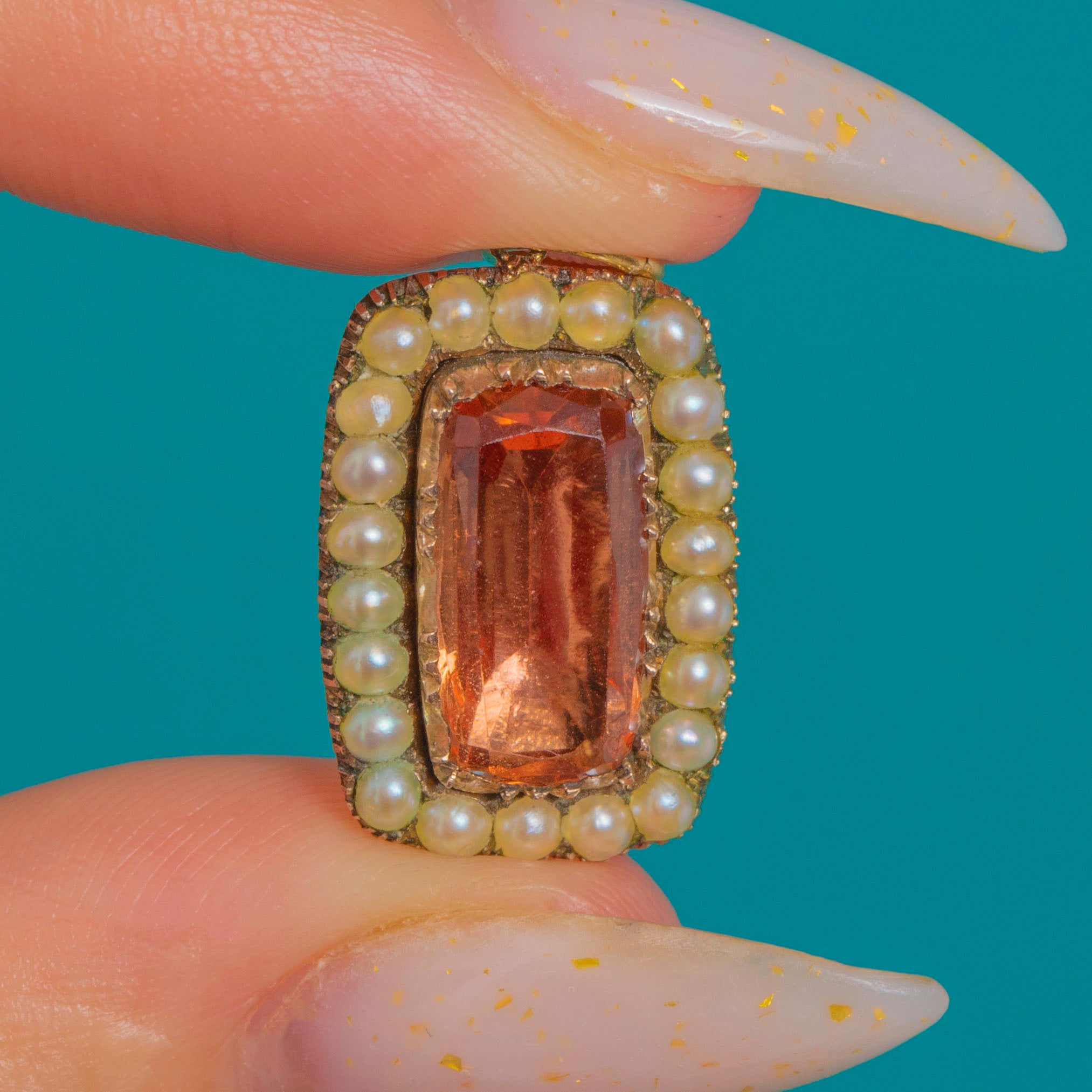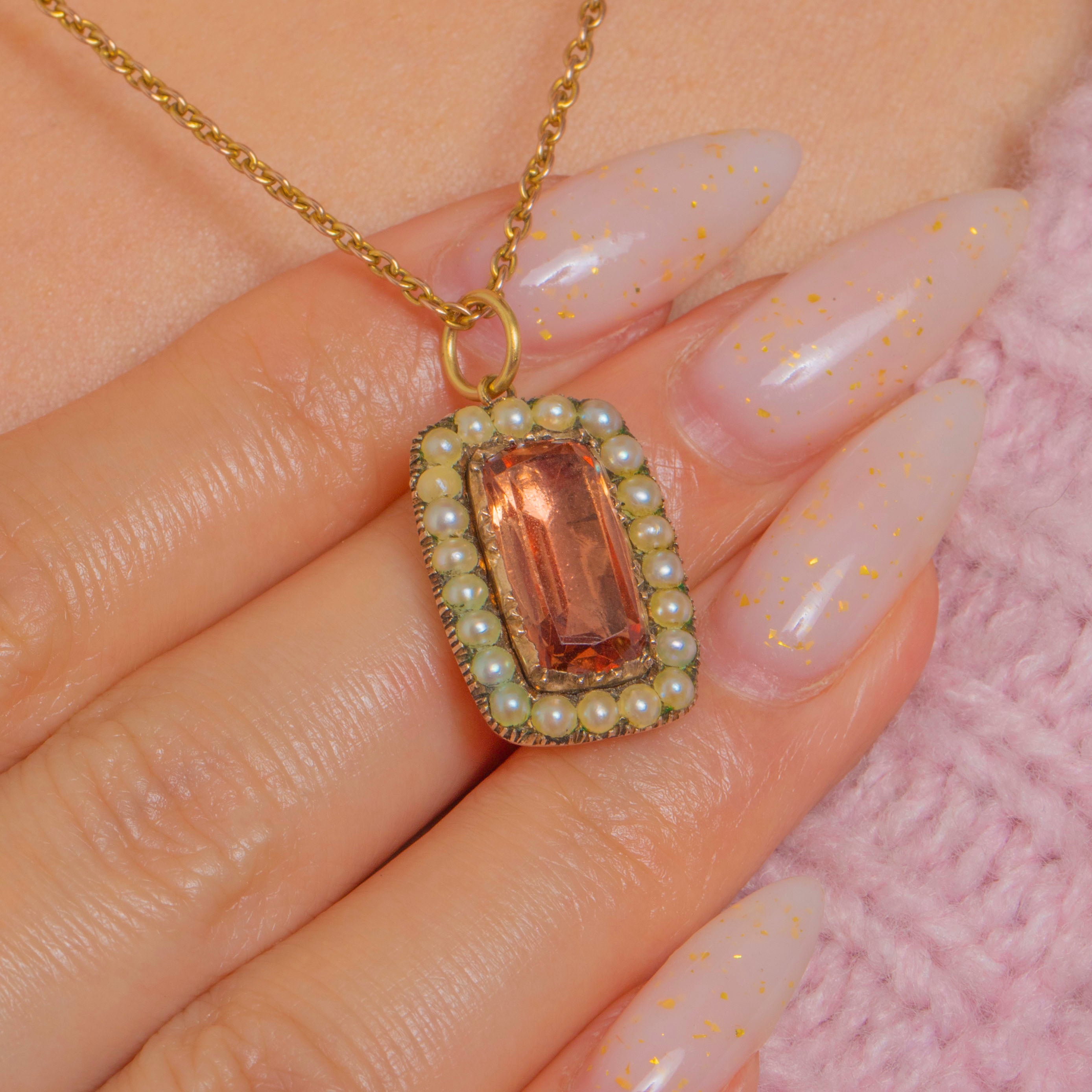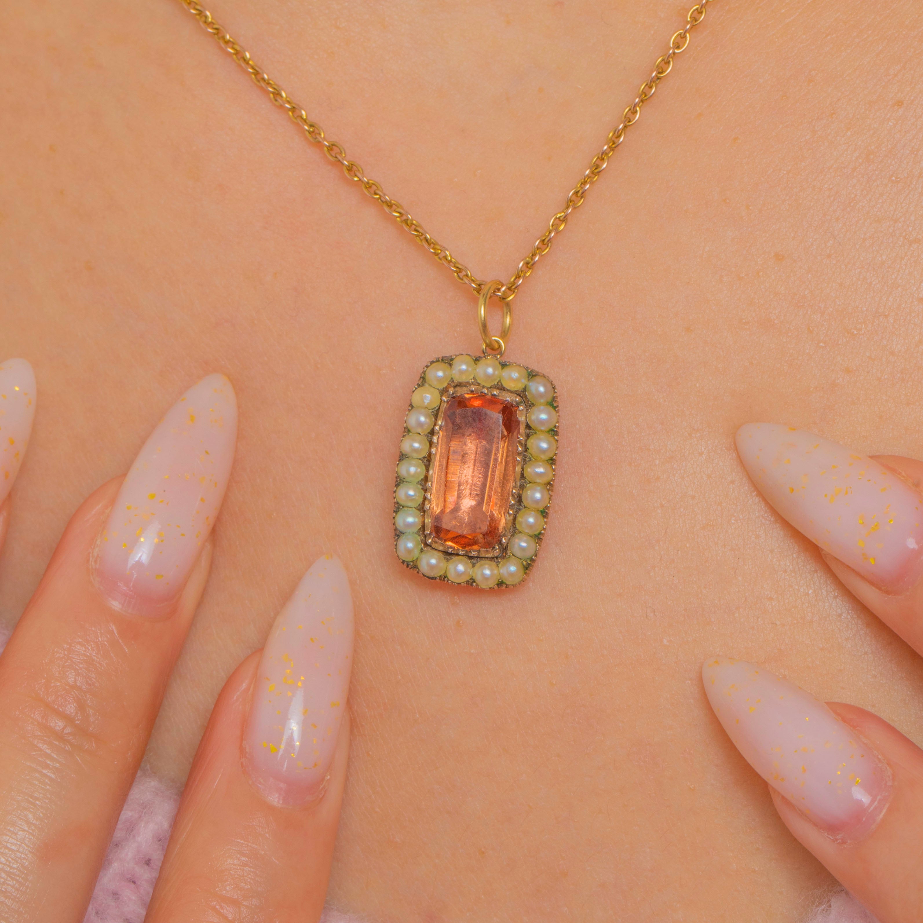 A delicate Georgian treasure, this 9ct Gold pendant centres on a long rectangular Imperial Topaz glowing with warm peachy-orange hues. The stone is framed by a refined halo of creamy Seed Pearls, the whole composition brought together with a hand-finished serrated collet and fine milgrain detailing for that sought-after period charm.