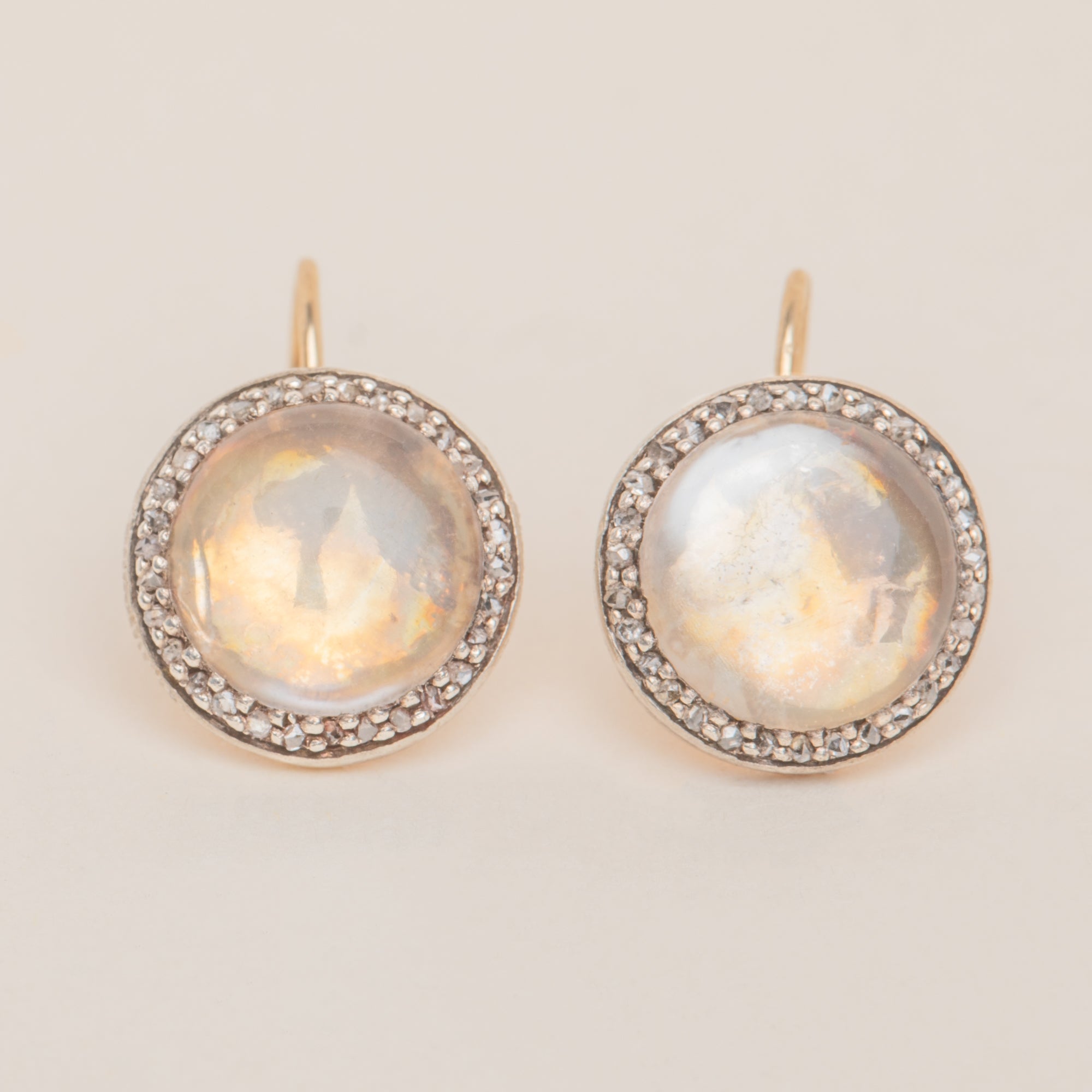 MATERIALS: Tests as 9ct Gold setting with 15ct Gold hooks, Moonstone, Rose-Cut Diamonds.