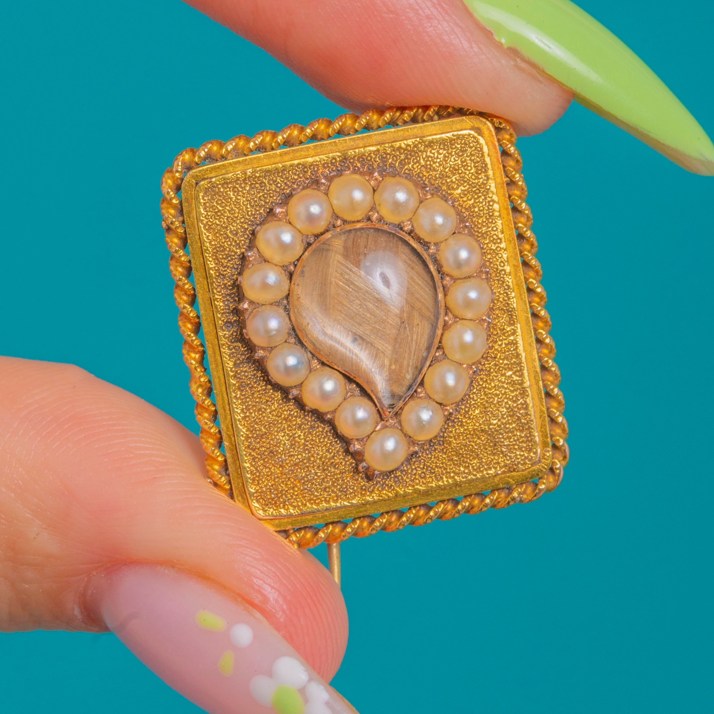 A tender jewel of remembrance from the Georgian era, this 9ct Gold mourning brooch is composed around a graceful tear motif. A halo of creamy Seed Pearls encircles a meticulously woven panel of hair within a raised, domed compartment, its surface softly gleaming against a richly textured Gold ground.