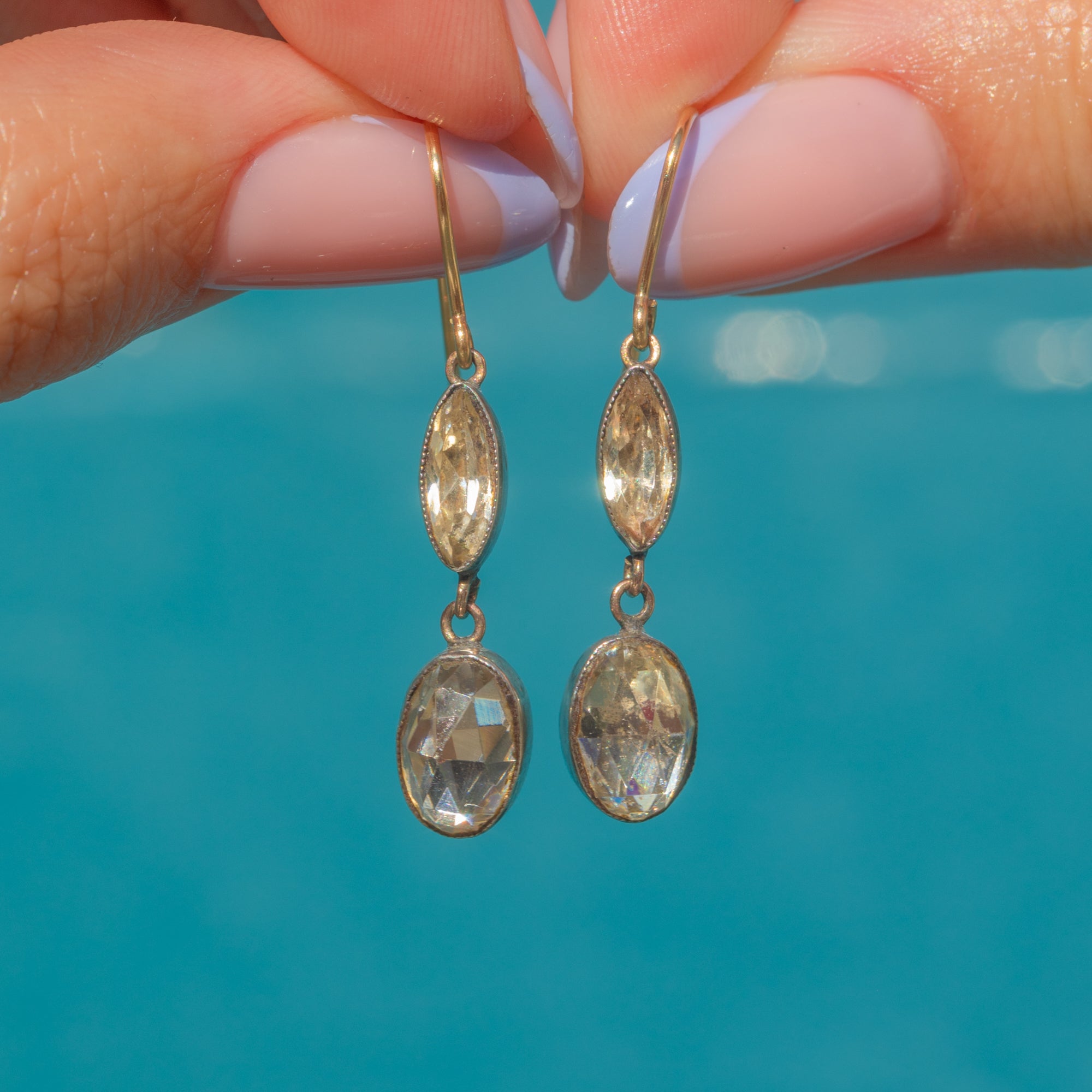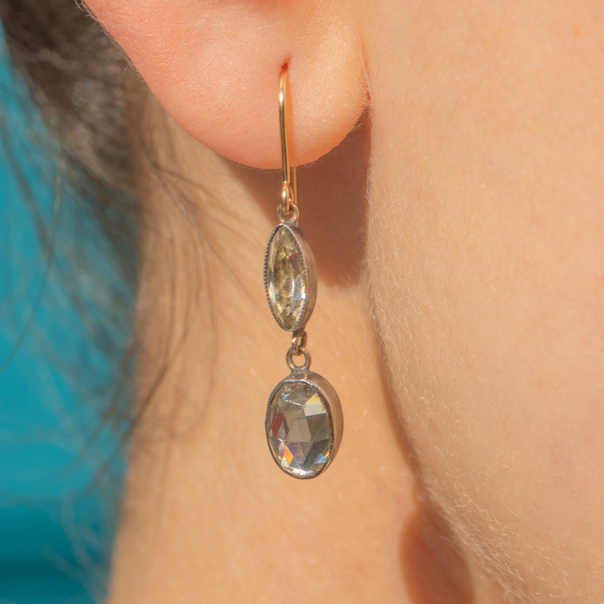 A beautiful pair of Georgian 9ct Gold rose-cut Diamond Paste earrings, c.1820, crafted from a classic combination of Silver and 9ct Gold. Each earring is set with shimmering rose-cut Diamond Paste stones—meticulously hand-faceted to capture the soft, candlelit glow beloved in the early 19th century.