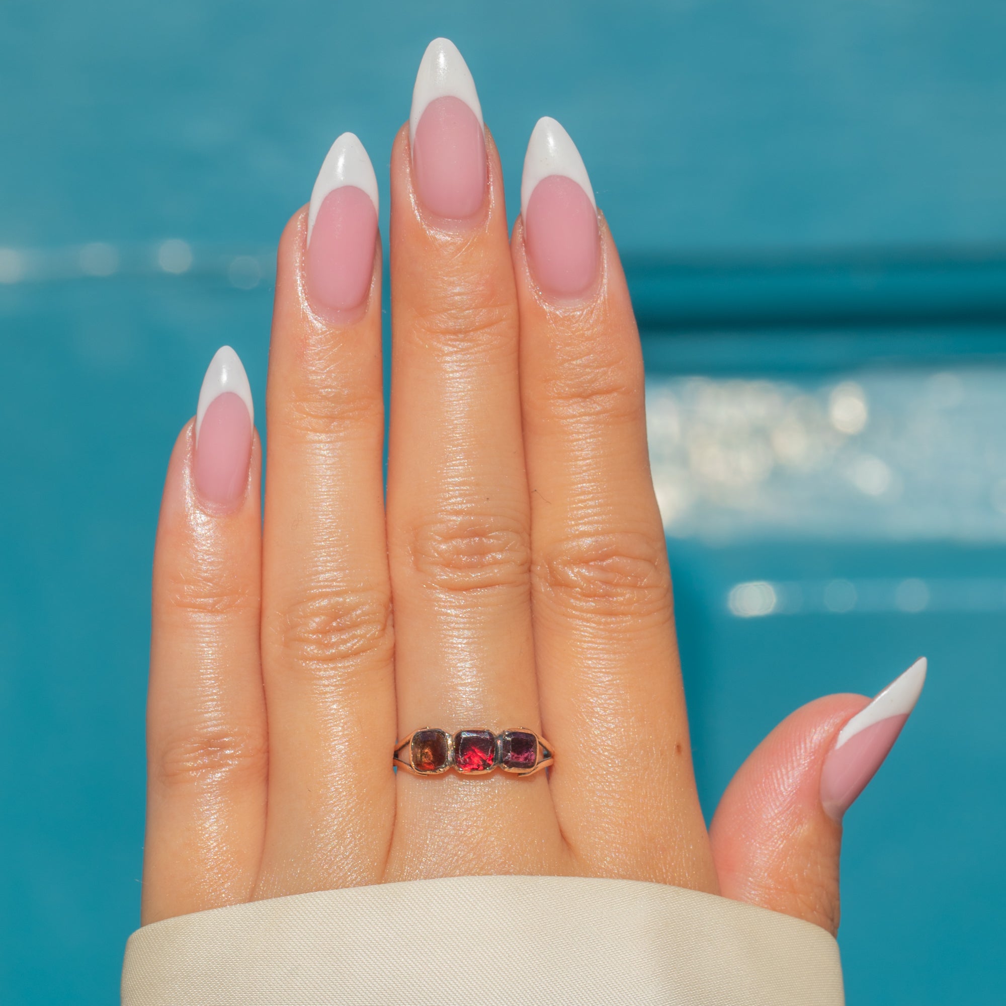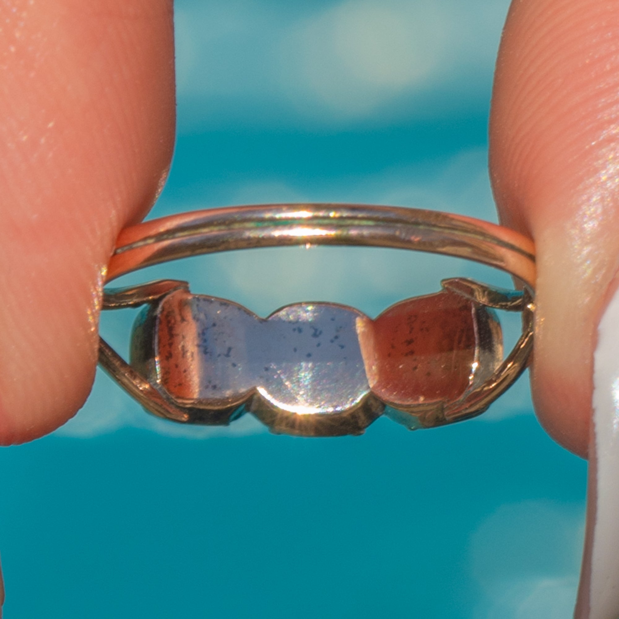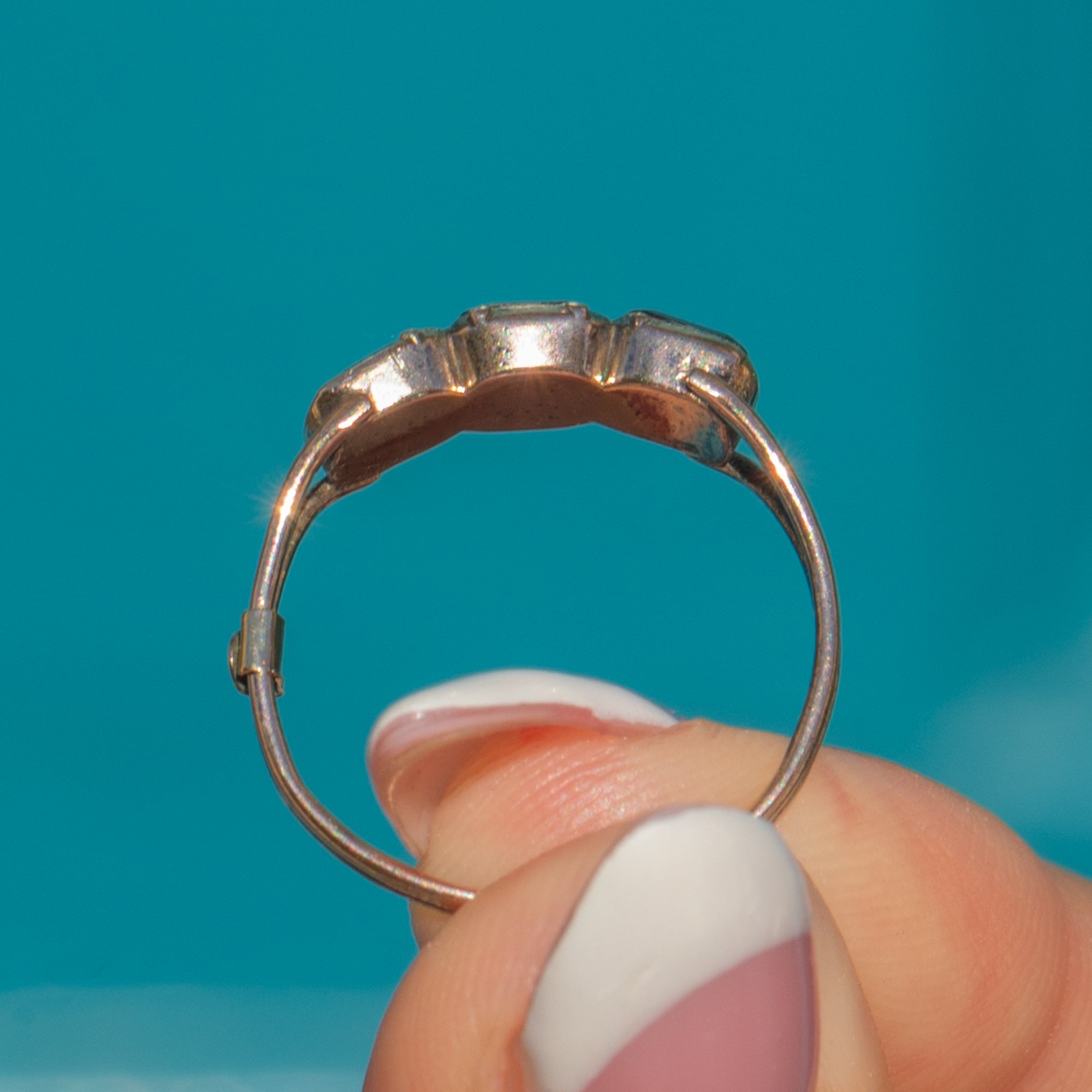 This Georgian trilogy ring is a rare survival from the early 19th century, set with three dark red table-cut Garnets. Crafted in 9ct Gold, the square-cut Garnets have flat tops and closed-backed settings typical of the period’s style. Trilogy rings symbolised past, present, and future, making this a piece imbued with sentiment as well as history.