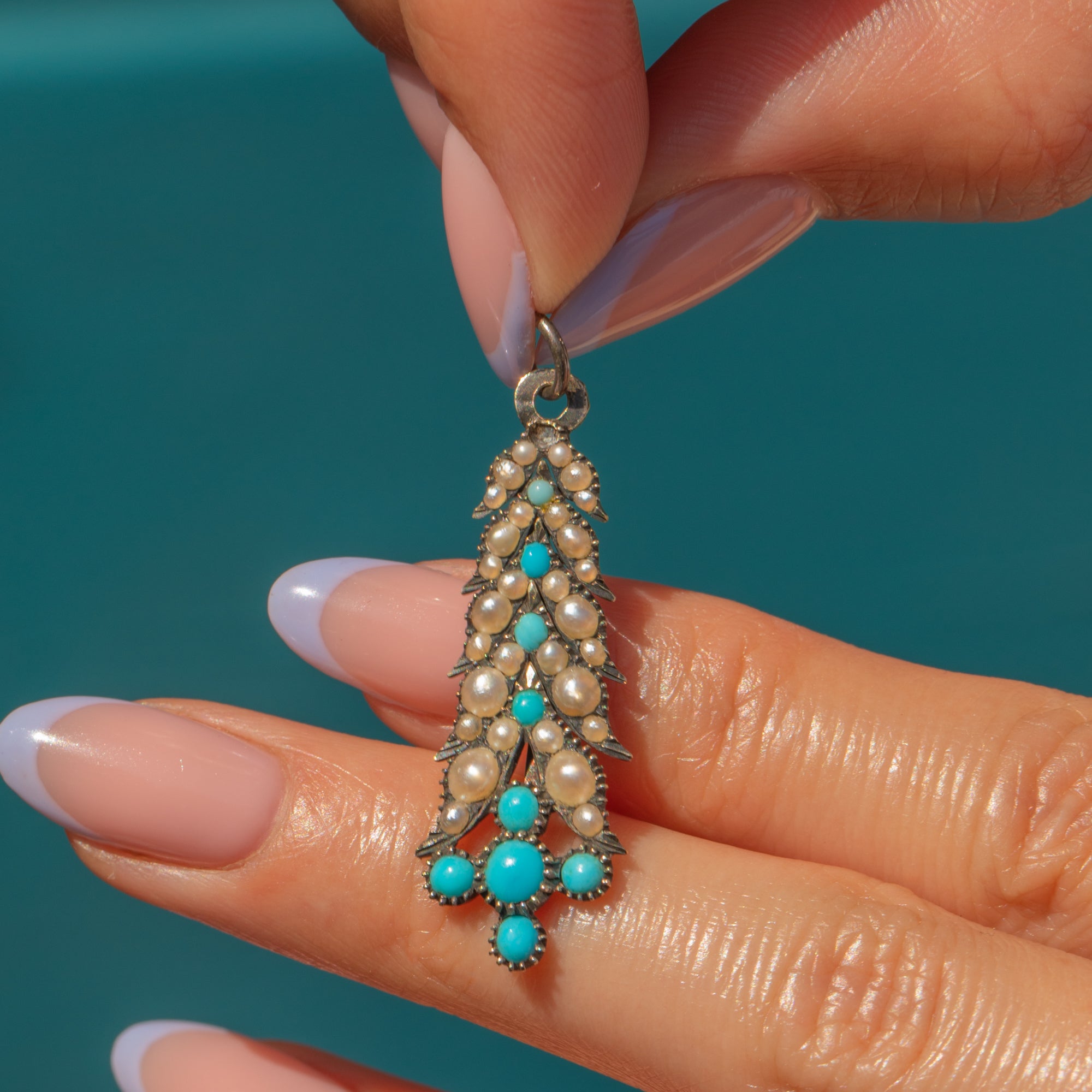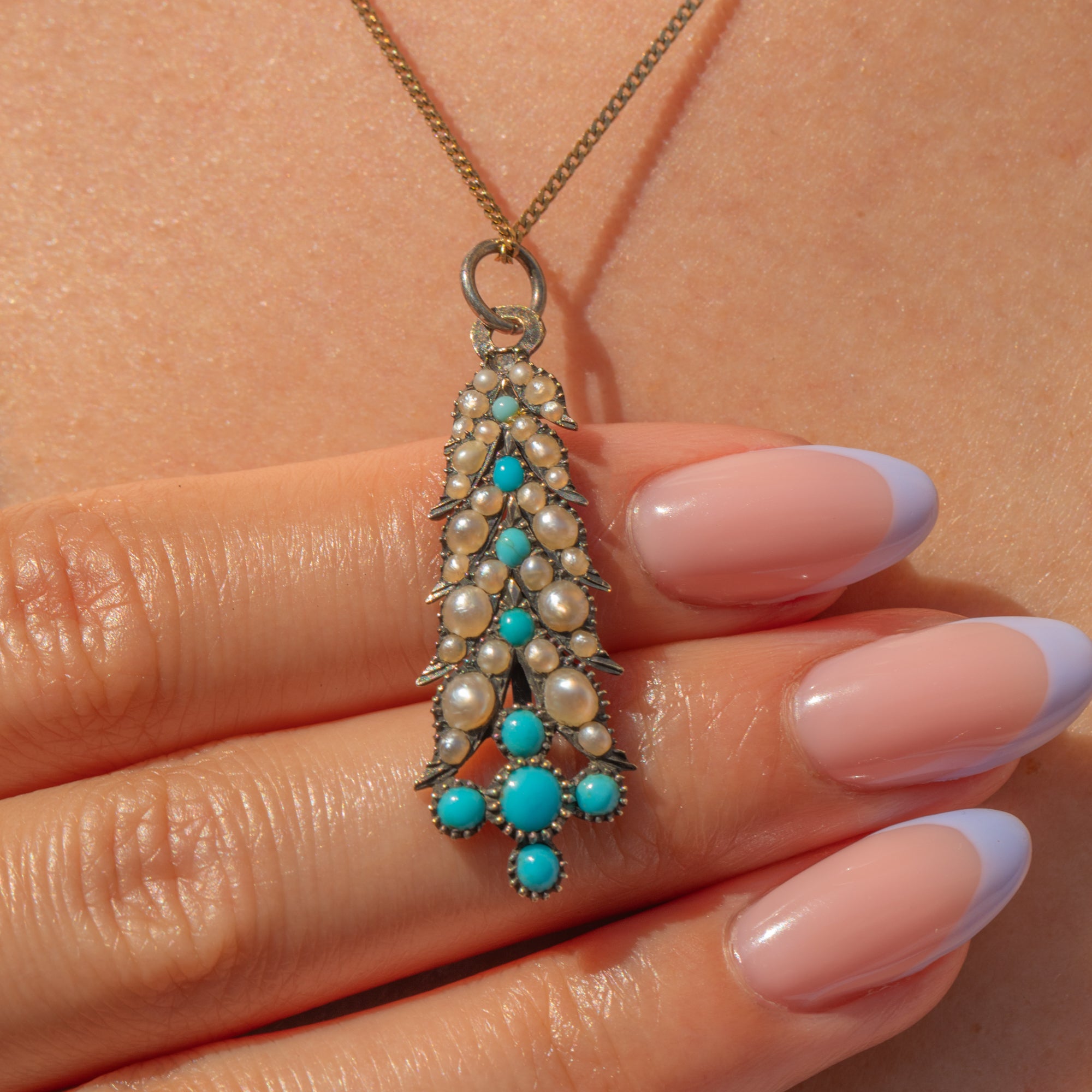 Add a pop of colour to your décolletage with this Turquoise and Pearl 9ct Gold drop pendant!