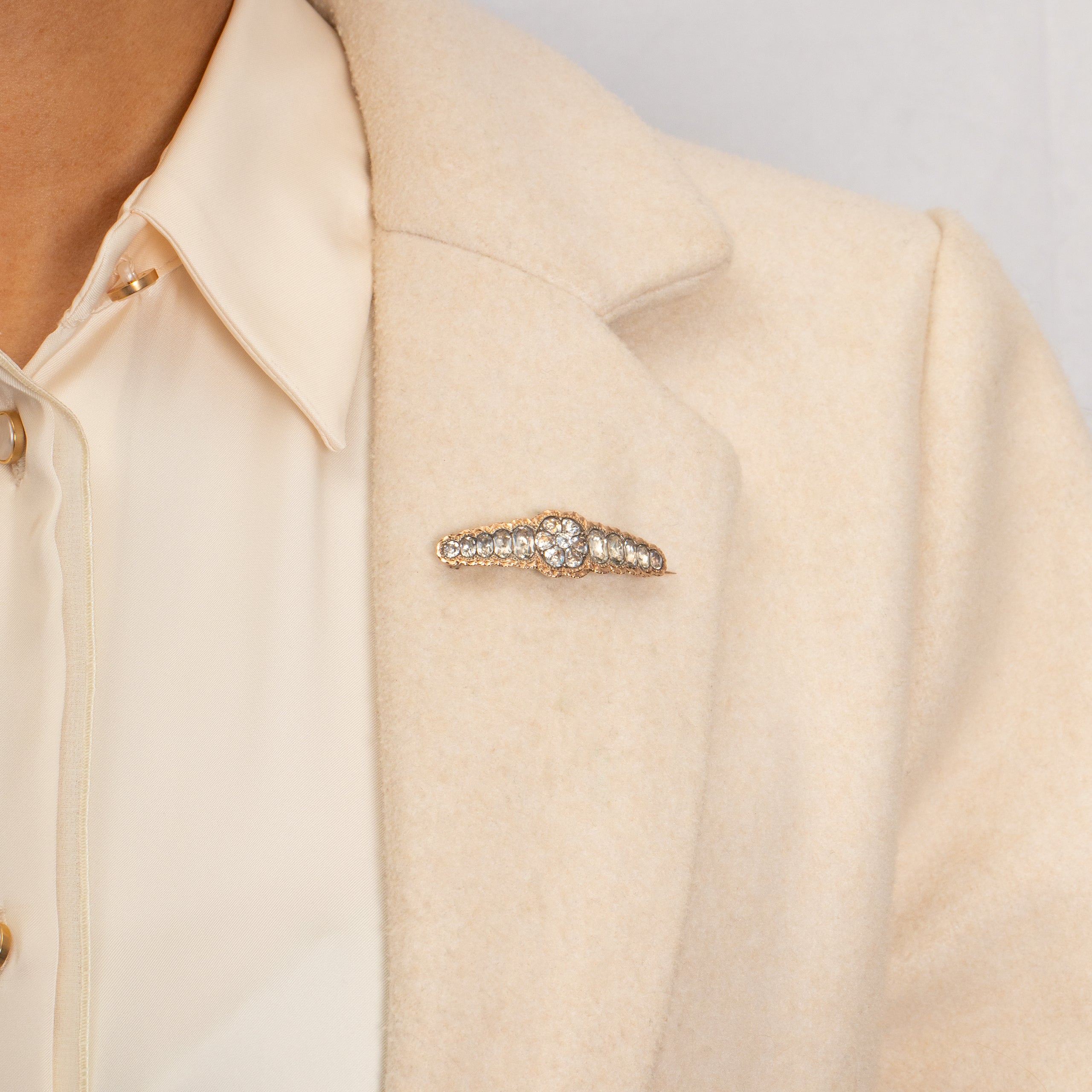 EXCELLENT. This Georgian black dot Paste flower brooch is offered in excellent condition. The black dot Paste have a beautiful scintillation with crisp facets that are free from chips or abrasions, all securely held within their settings. The Gold adds a subtle buttery hue and the details are free from signs of wear. There is some minor wear on the back of the brooch, commensurate with age, but this cannot be seen when worn. The brooch fitting is in perfect working order allowing you to wear this phenomenal piece confidently.