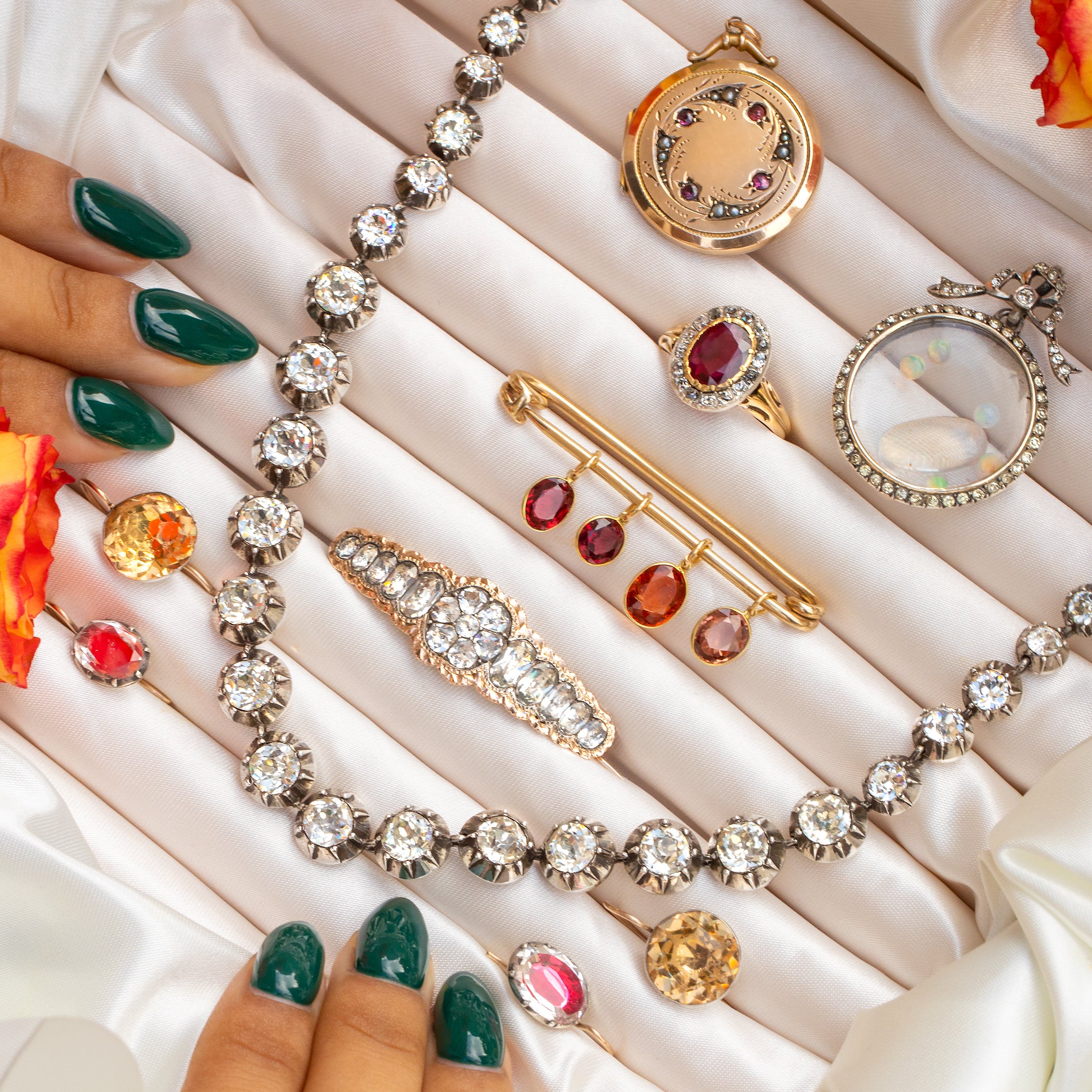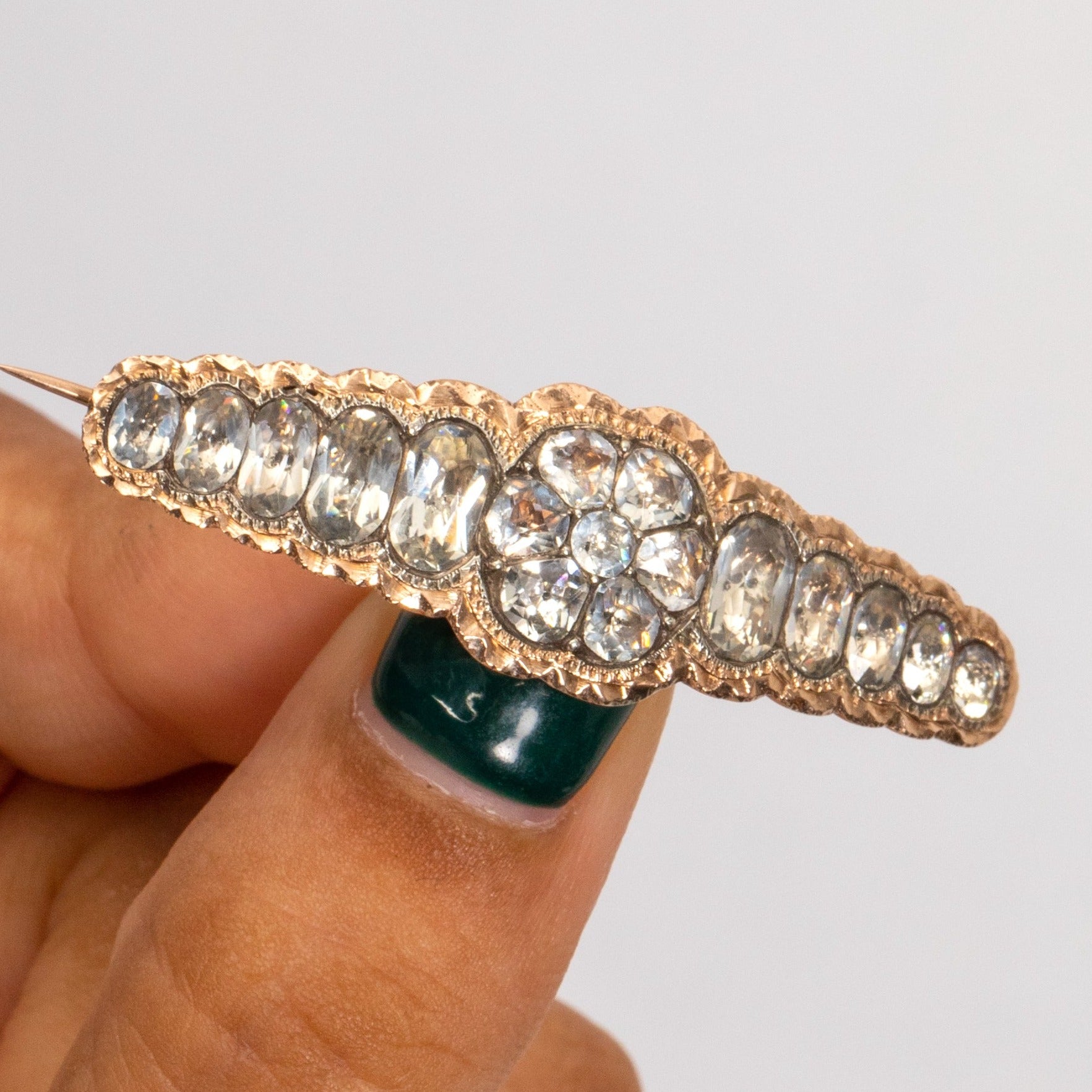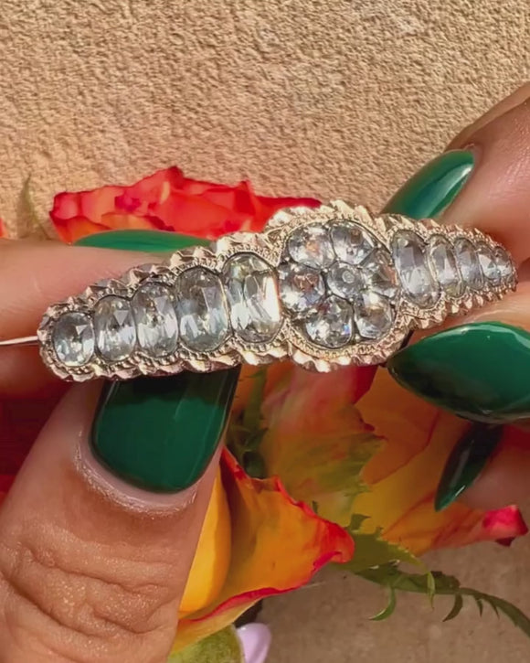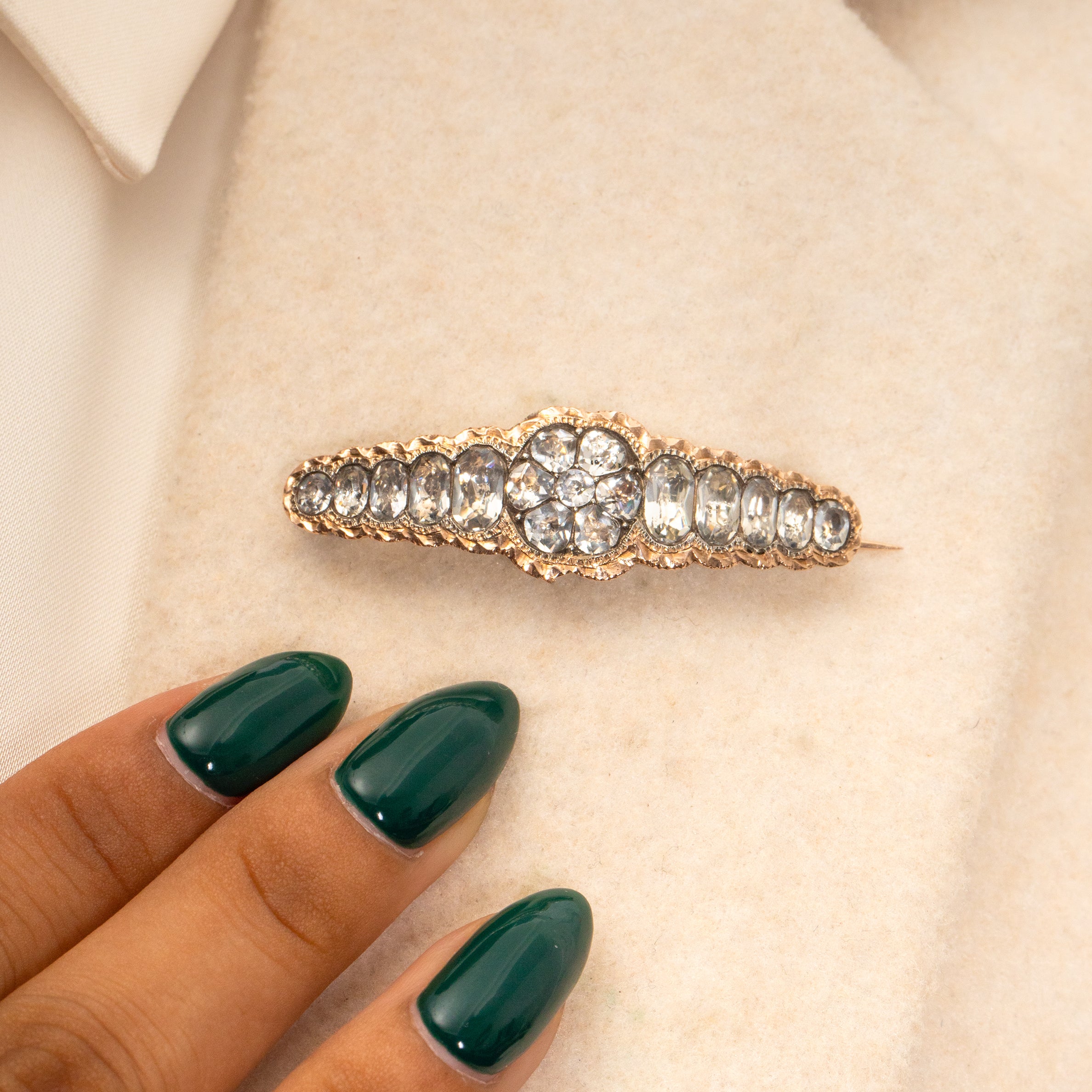 This Georgian black dot Paste flower brooch is simply spellbinding! Inlaid with glittering Diamond Paste, this piece captures everything we love about Georgian-era jewellery. This exquisite brooch features a captivating floral shape at its centre, meticulously crafted from shimmering black dot Paste. The floral cluster is flanked by graduating Paste on either side, all set into decorative 9ct Gold details creating an eye-catching piece.