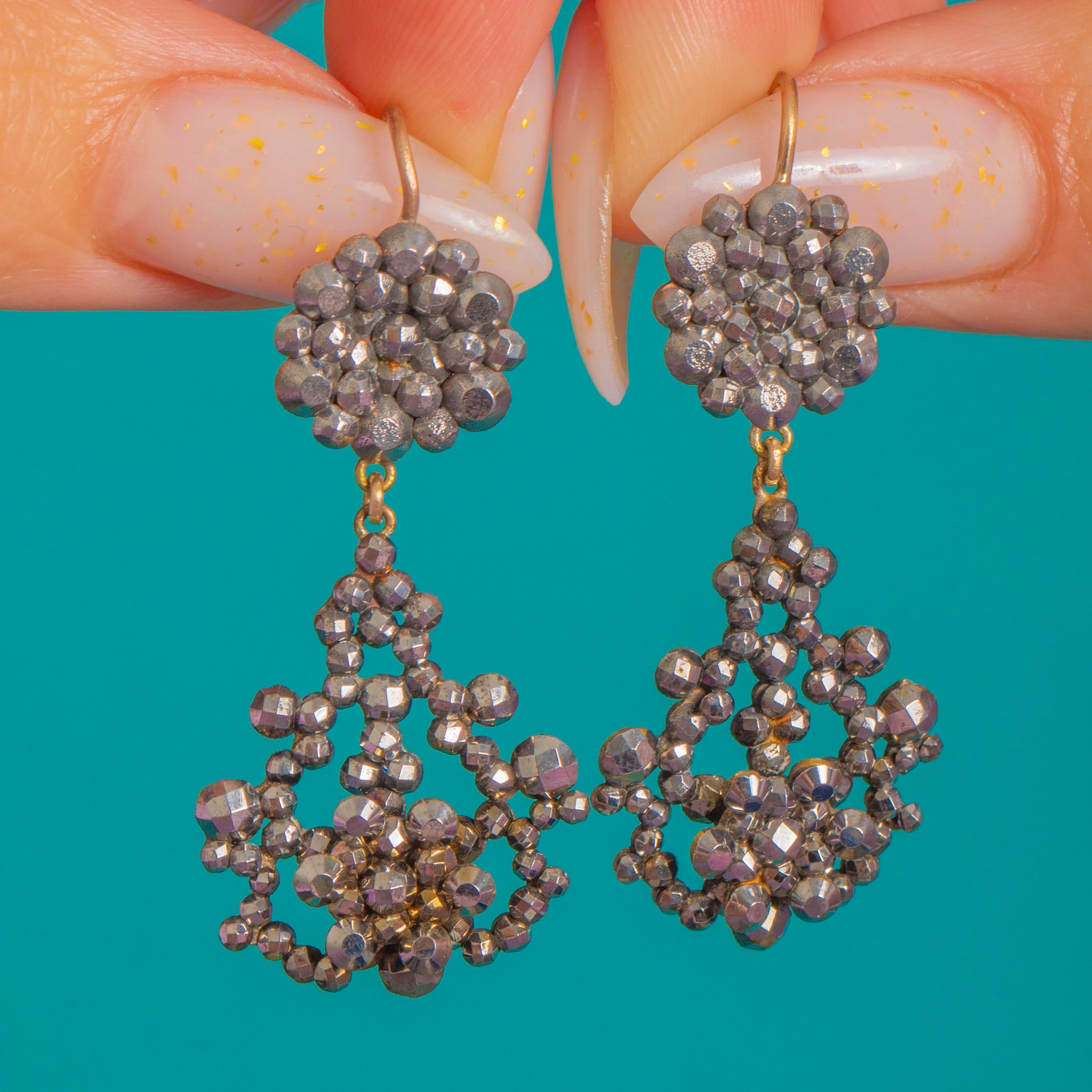 Beautifully articulated for fluid movement, these earrings catch the light at every turn. The contrast of dark, silvery-grey steel with gleaming 9ct Gold shepherd hooks feels both luxurious and authentically antique. A gentle, even patina enhances their character while the facets remain crisp and full of life—Georgian glamour at its most wearable.
