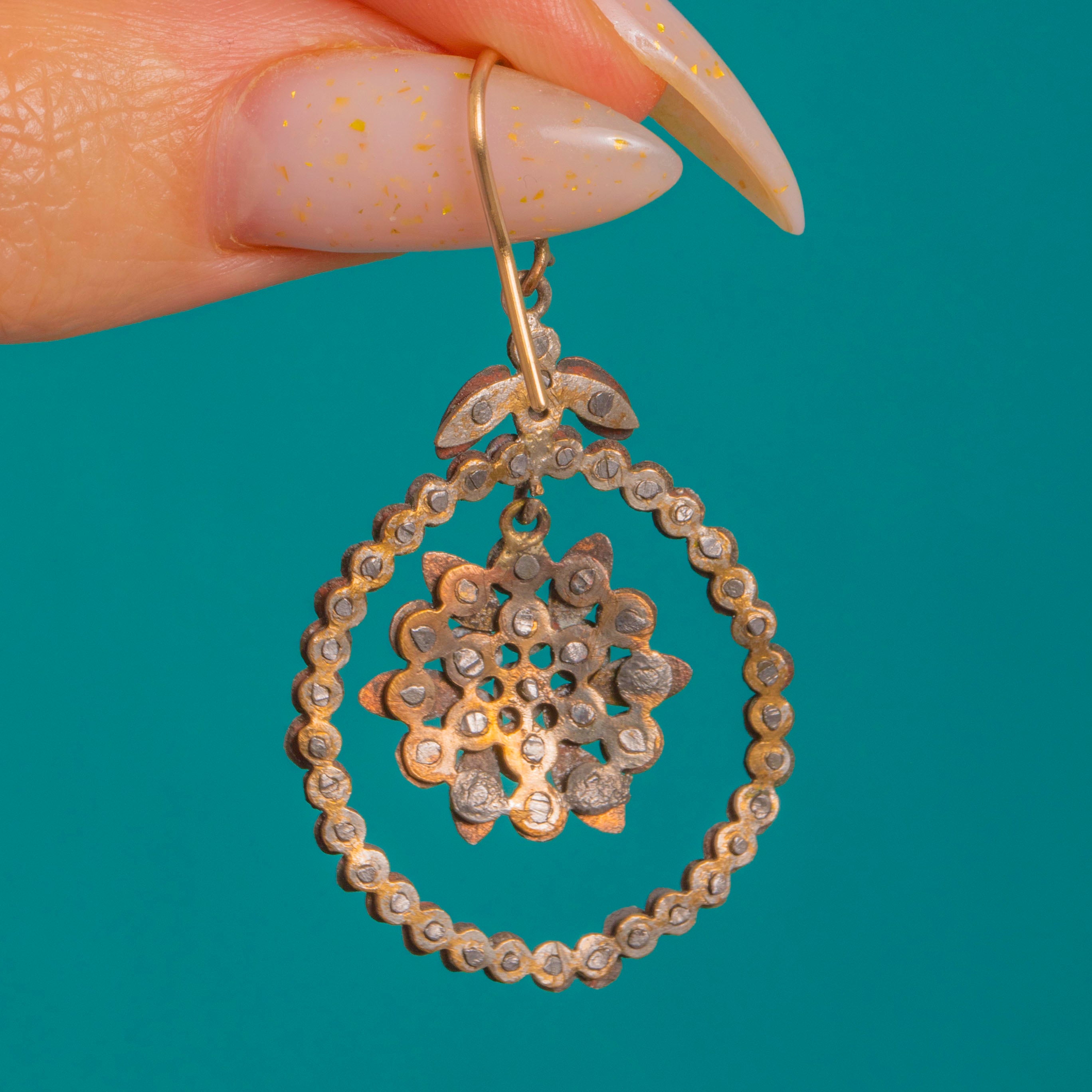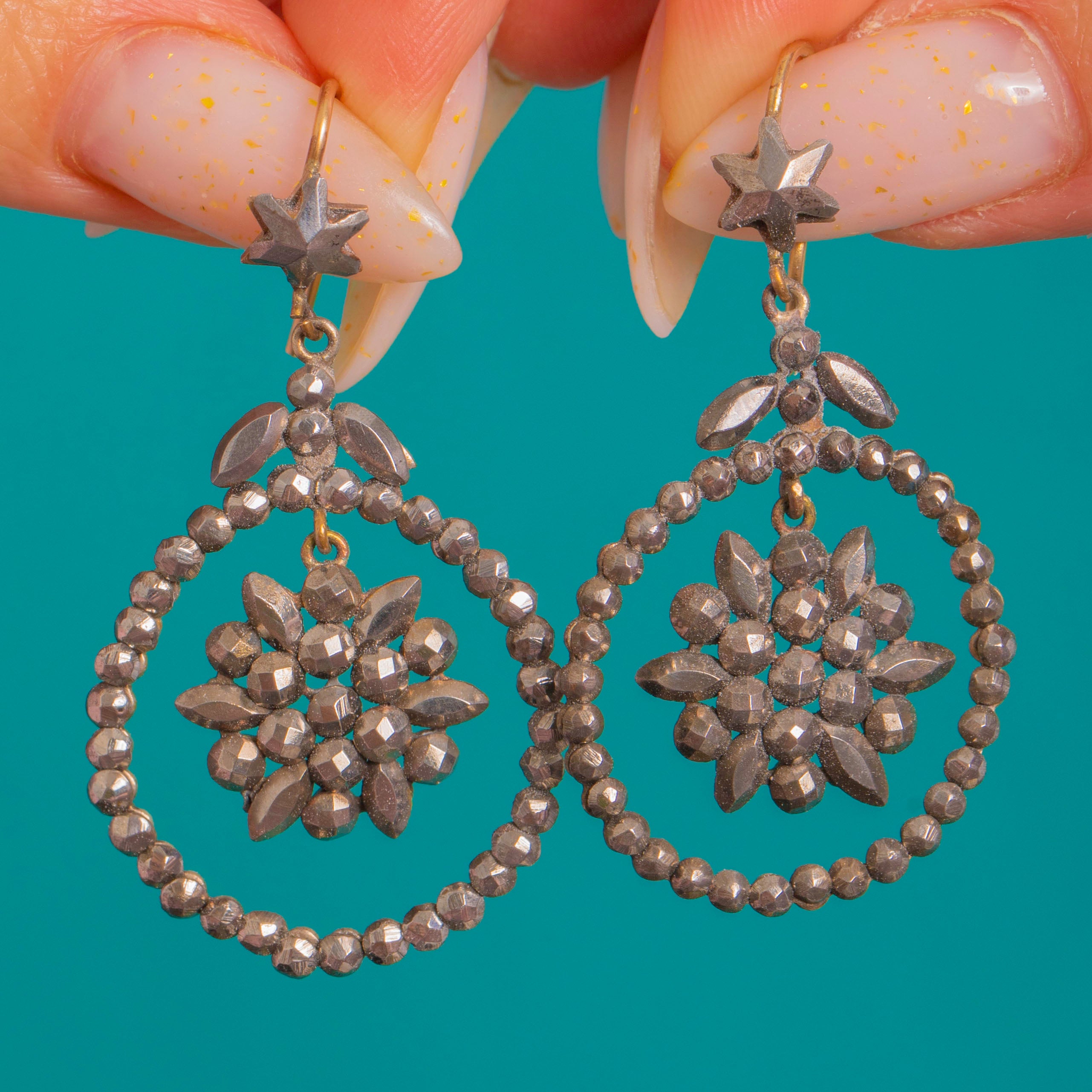 A matched pair of Georgian star‑topped drop earrings, c.1800, composed of articulated cut steel elements hung from 15ct Gold hooks. A small star motif crowns a foliate connector, leading to a beaded cut‑steel open hoop with a suspended central rosette of marquise and round cut steel petals.
