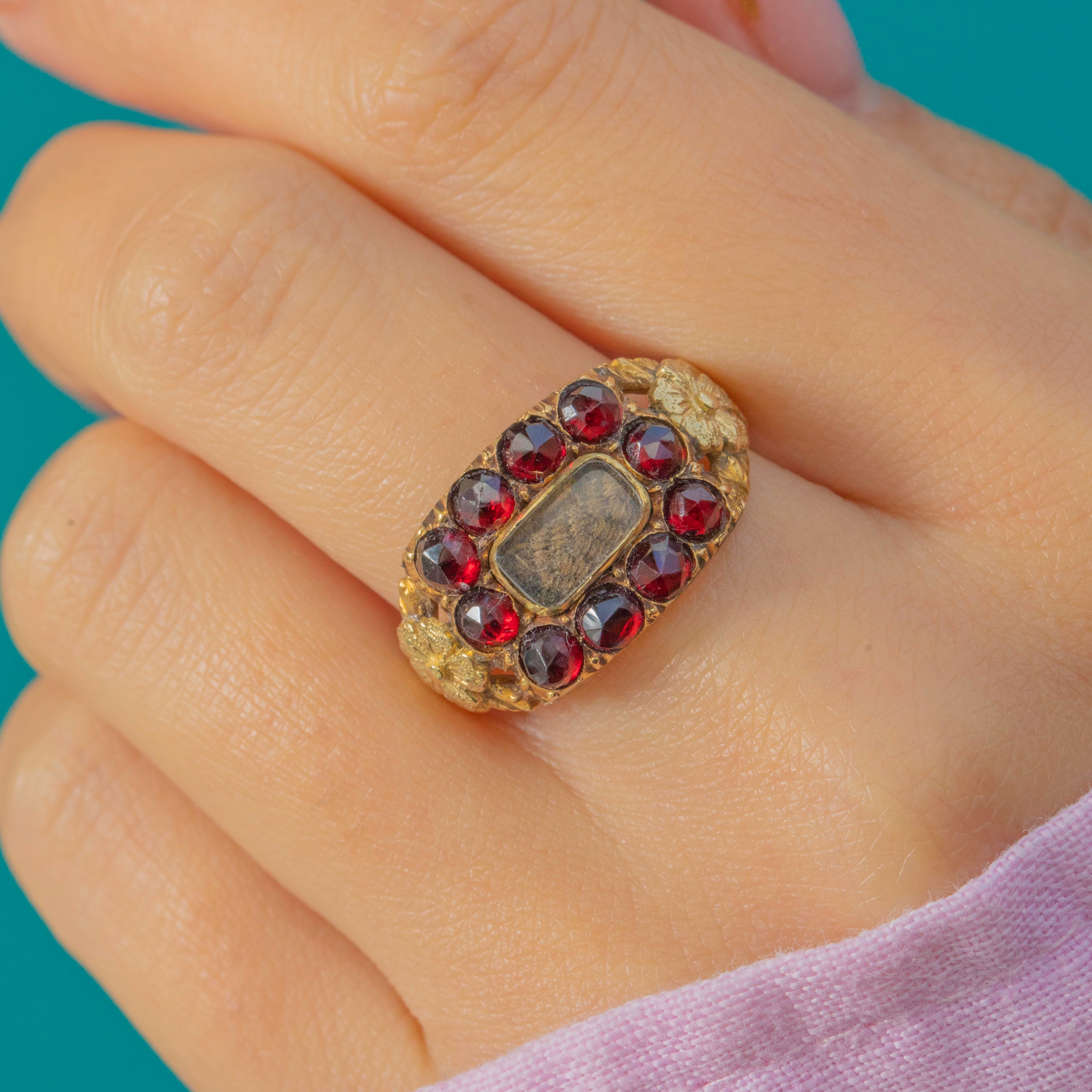 This remarkable Georgian mourning ring commemorates a married couple, Mrs Susannah Gosnell and Mr Sam Gosnell, who passed away just ten days apart in July 1827. Crafted in rich 18ct Gold, the ring is set with a deep red Garnet beneath a protective layer of Glass – a classic construction for high-status mourning jewellery of the period.