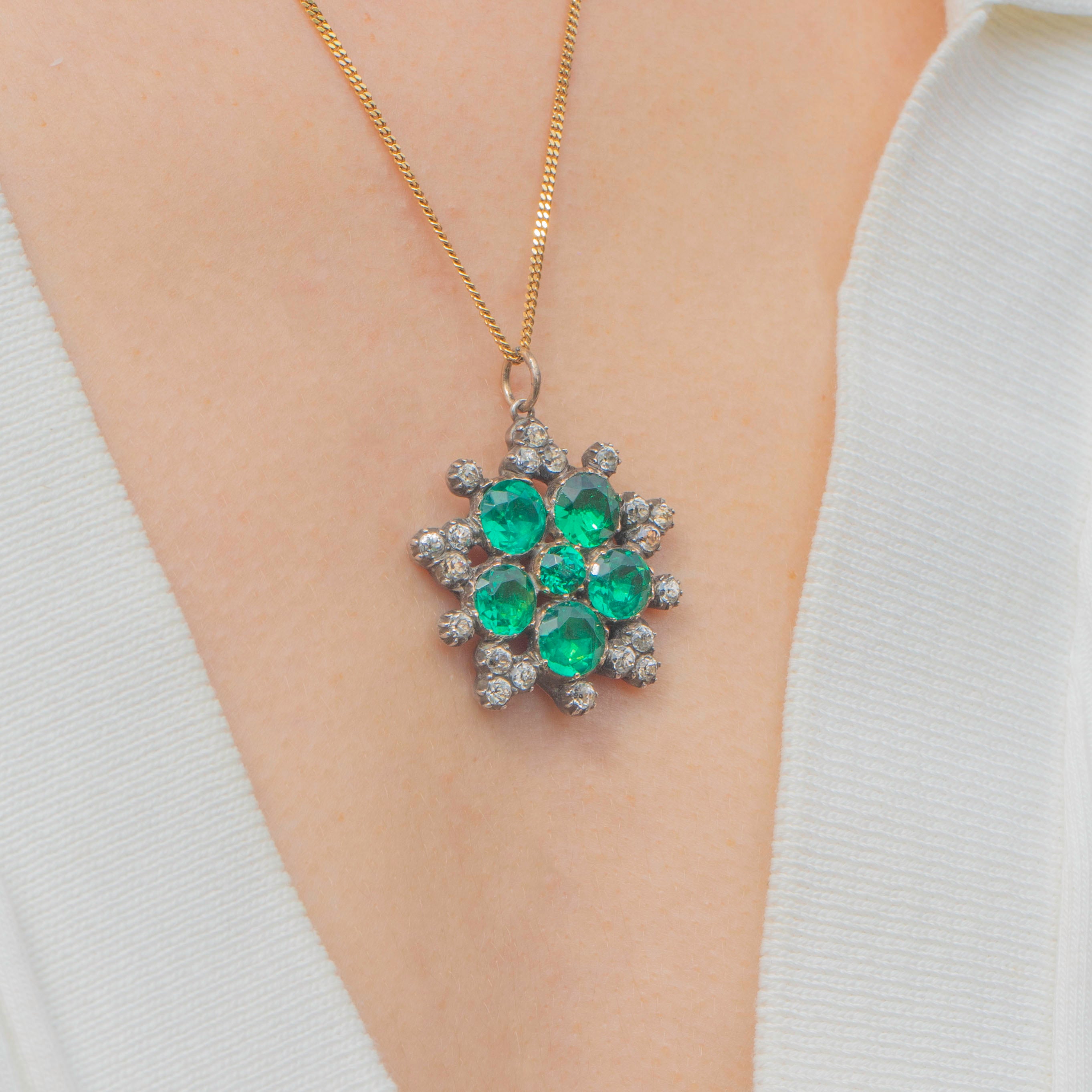 This Georgian green & black dot Paste cluster pendant will add a vibrant flourish to your décolletage! Finely crafted from solid Silver and backed with 9ct Gold, this Georgian pendant boasts a floral cluster of Emerald Paste in the centre bordered by bright Diamond Paste, all foiled crisply faceted to catch the light magnificently.