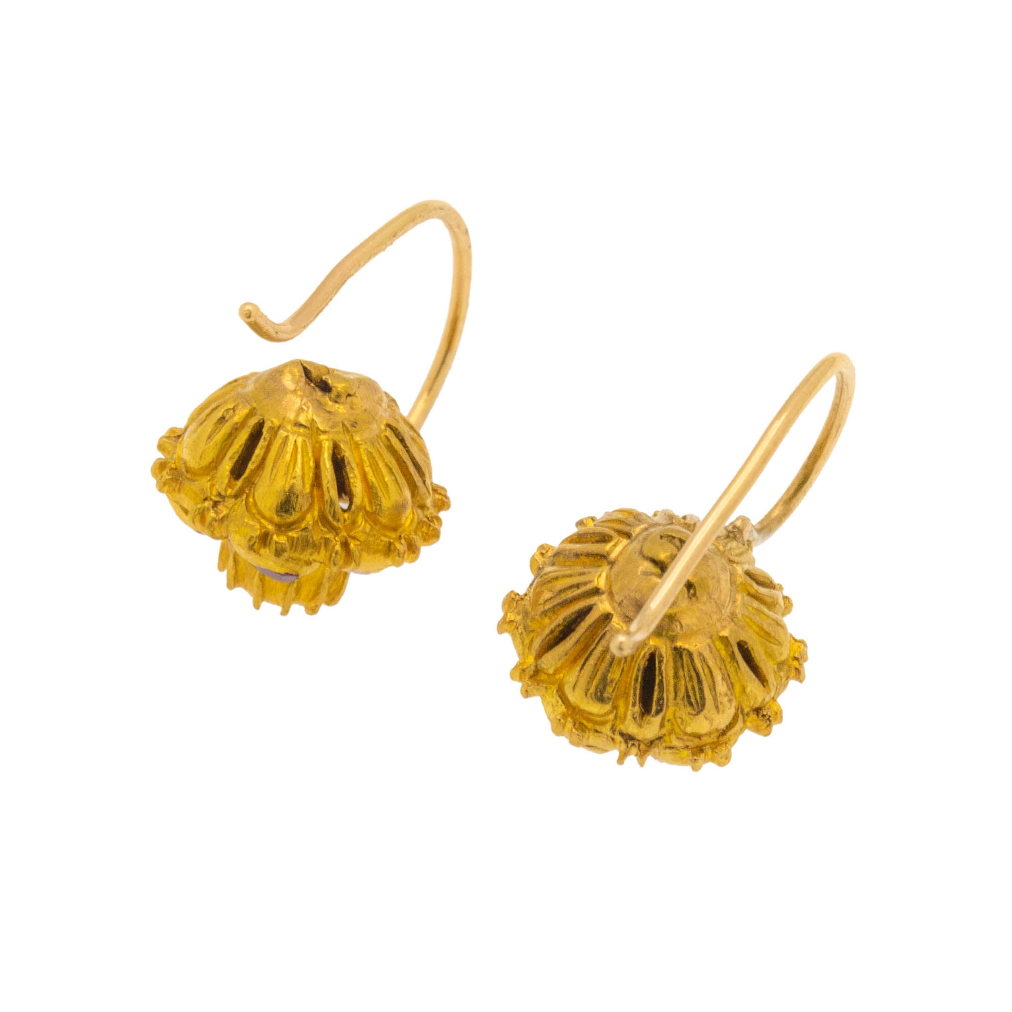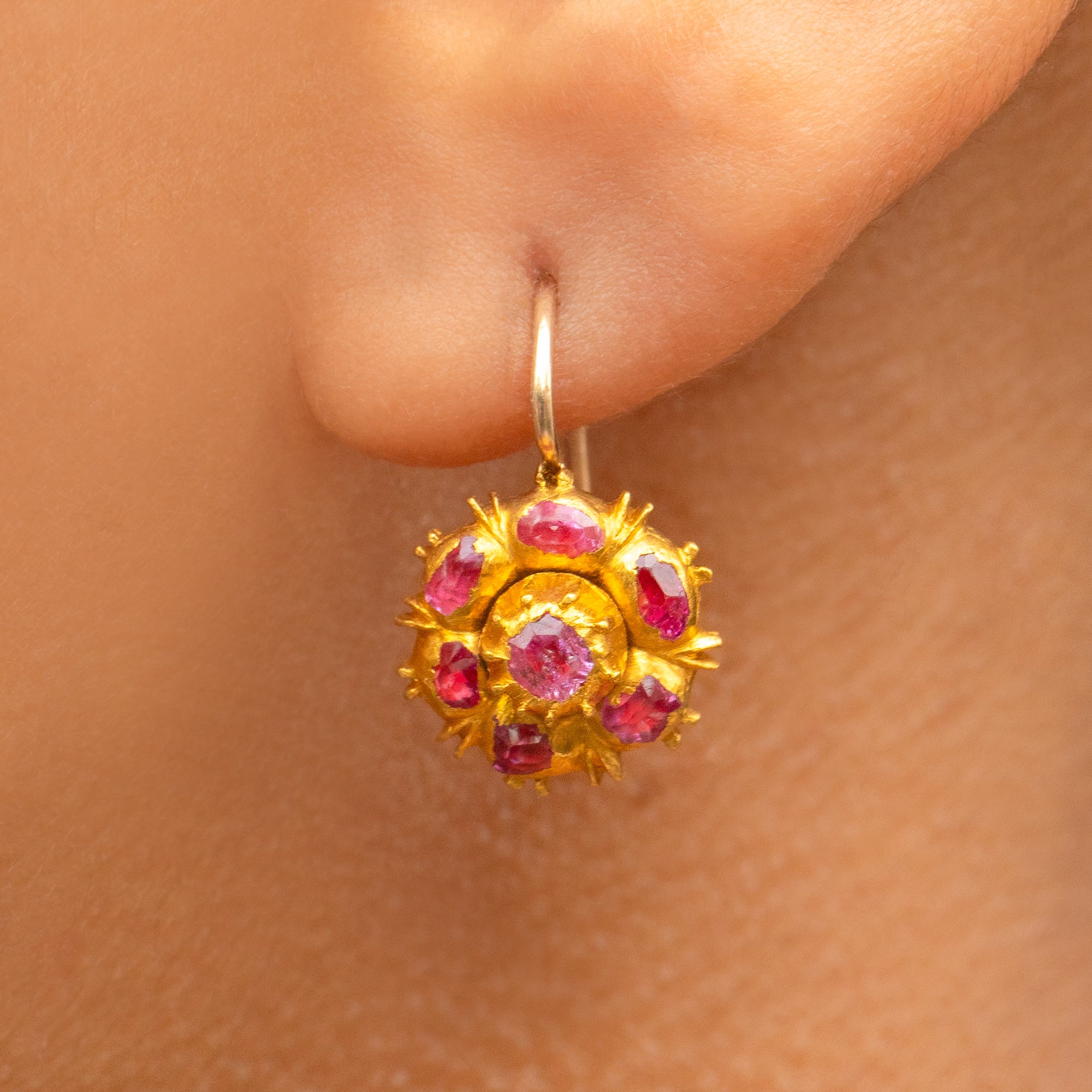 These Georgian Iberian 22ct Gold Ruby cluster earrings demand attention! The combination of saturated 22ct Gold and flickering fuchsia Rubies make for a mesmerising combination that will fall gracefully just below the lobes.