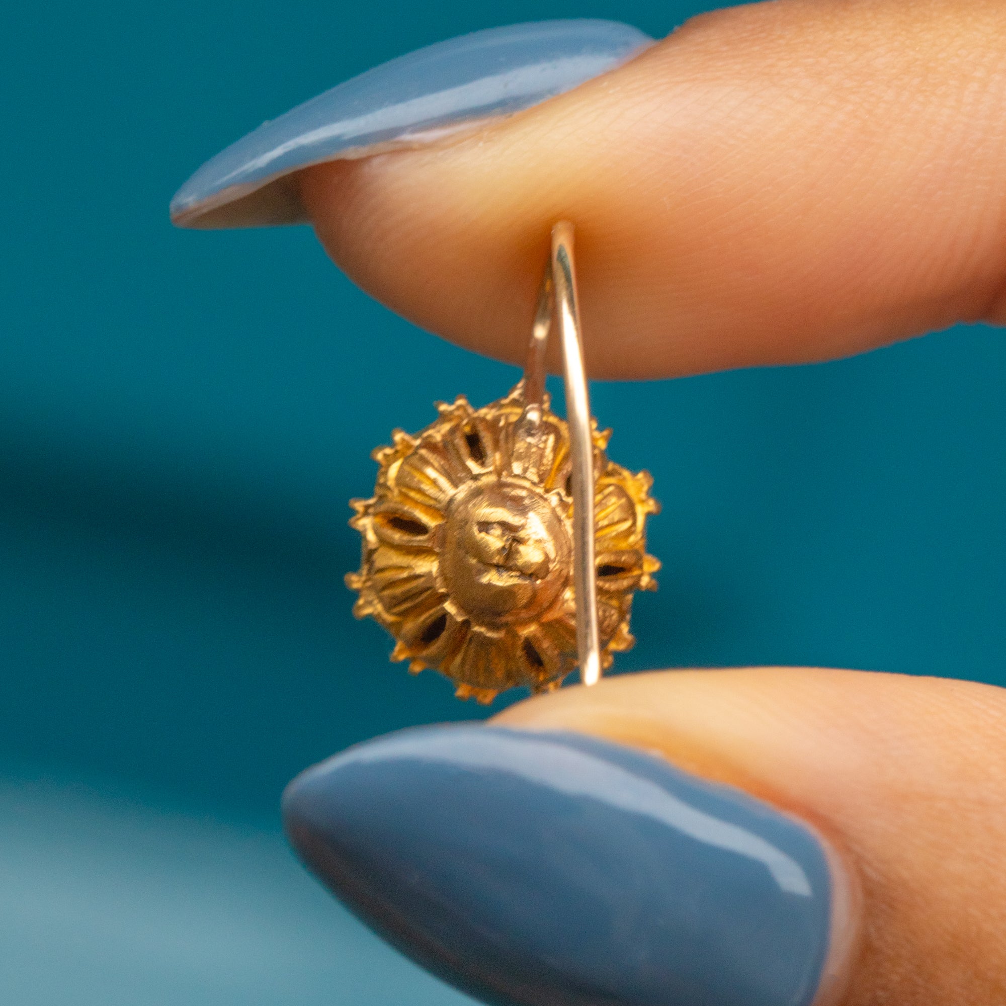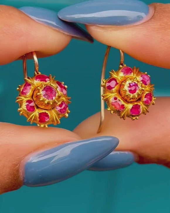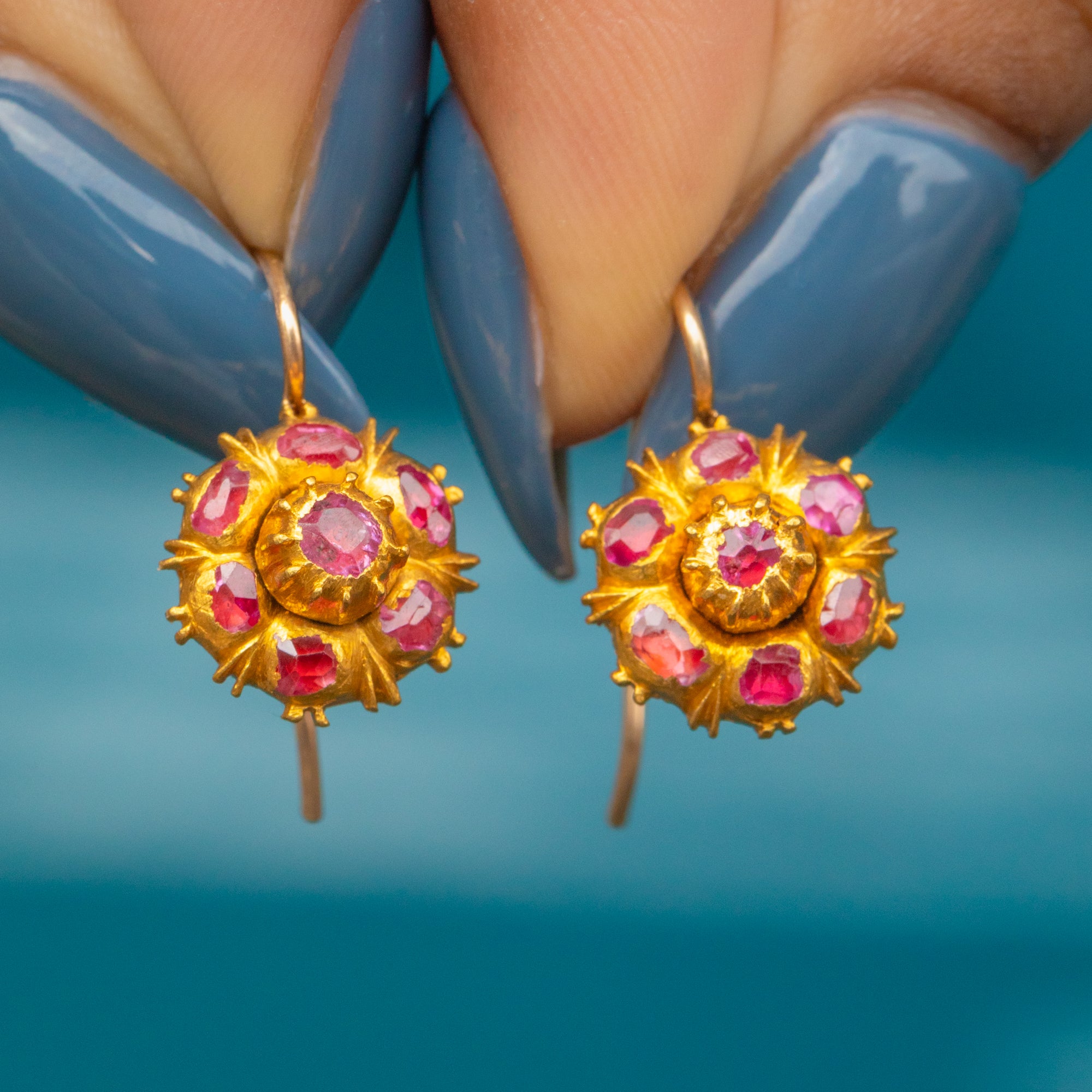 VERY GOOD-EXCELLENT. These Georgian Iberian 22ct Gold Ruby cluster earrings are in wonderful condition throughout! The Rubies are all present and securely set, their brilliant pink hue complemented perfectly by the saturated 22ct Gold. The Gold has retained a glorious shine and the details have remained crisp. There is slight remanence of a conversion on the centre of each domed back and the 9ct Gold hooks are likely a later addition (not by us!) but if you'd like us to replace them with 18ct hooks or studs please ask!