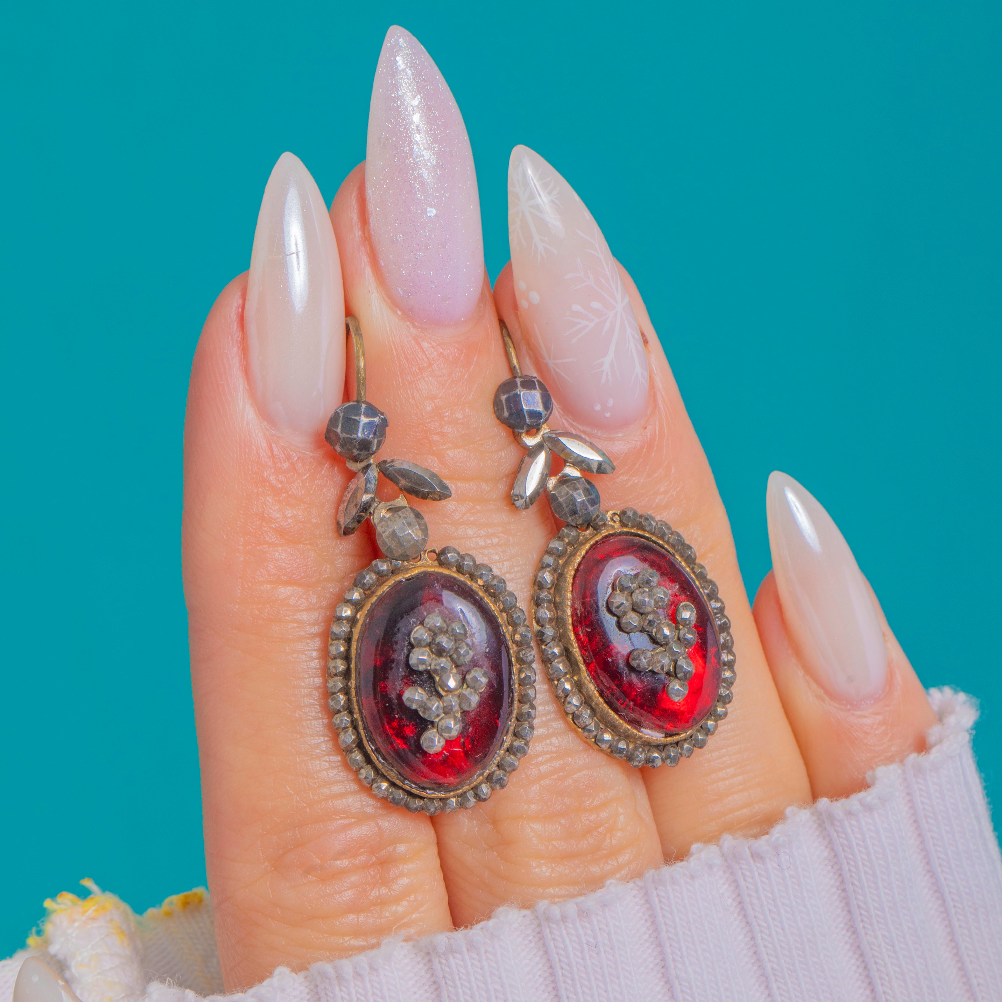 These Georgian Queen Anne earrings, c.1760, captivate with glowing deep-crimson Red Paste domes encircled by a scintillating halo of Cut Steel studs. The oval drops suspend from a delicate foliate surmount with a faceted bead, giving graceful articulation and lively sparkle.