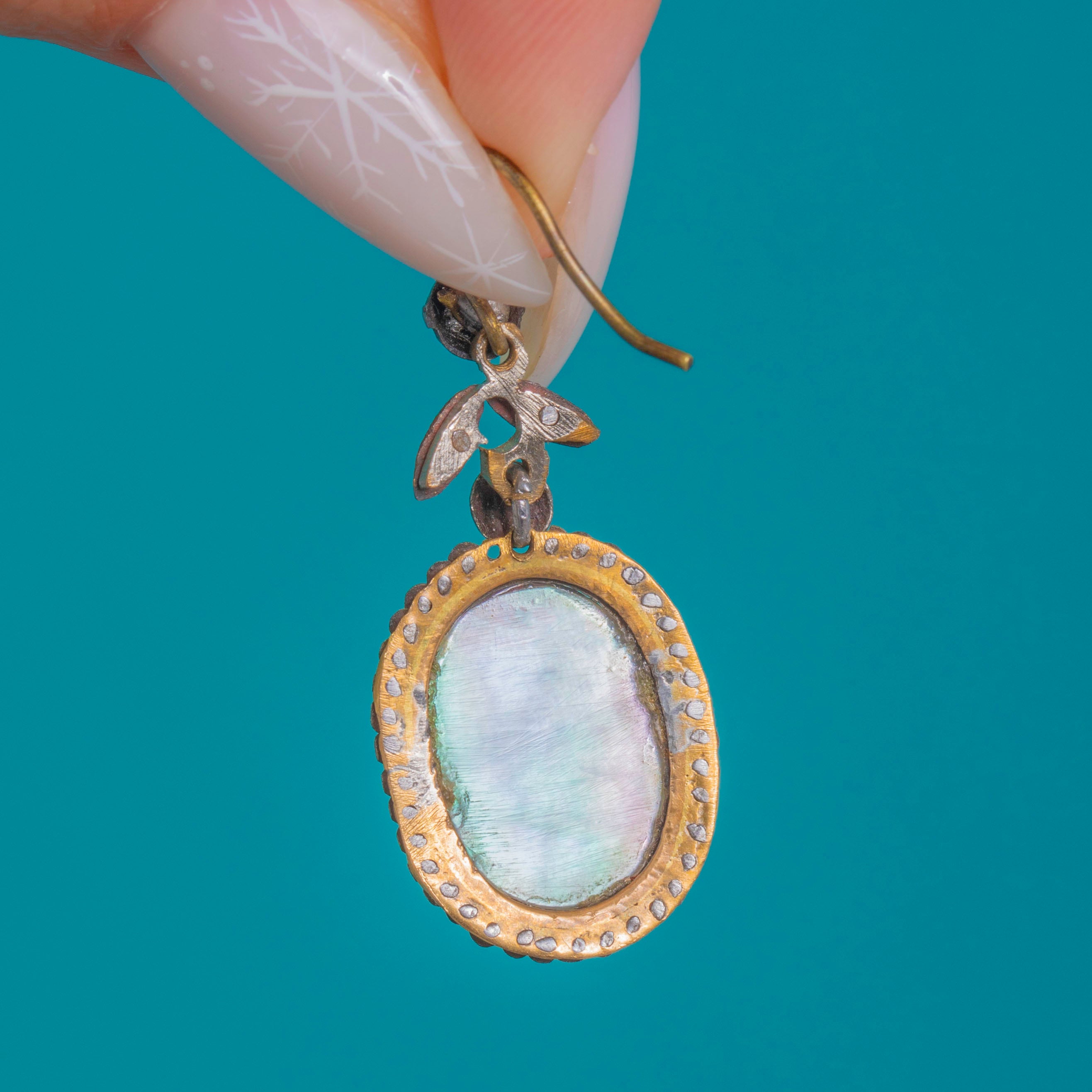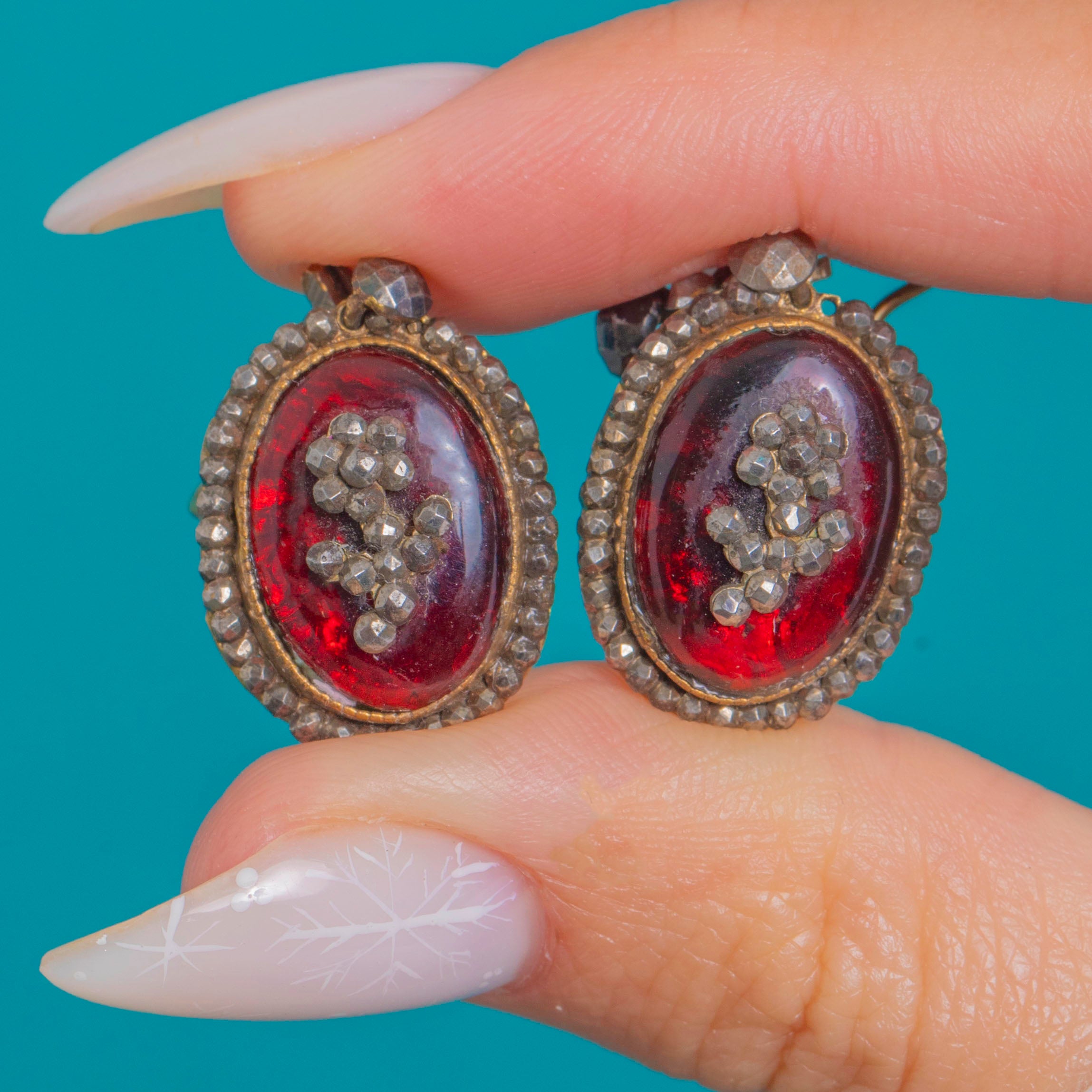 A beautifully aged mixed-metal palette and even patina speak to their period charm. Beneath the domed centers a small grey faceted cluster is visible, adding depth to the rich red. The reverse is finished with Mother of Pearl rears, and simple shepherd-hook fittings complete this romantic, ornate design.
