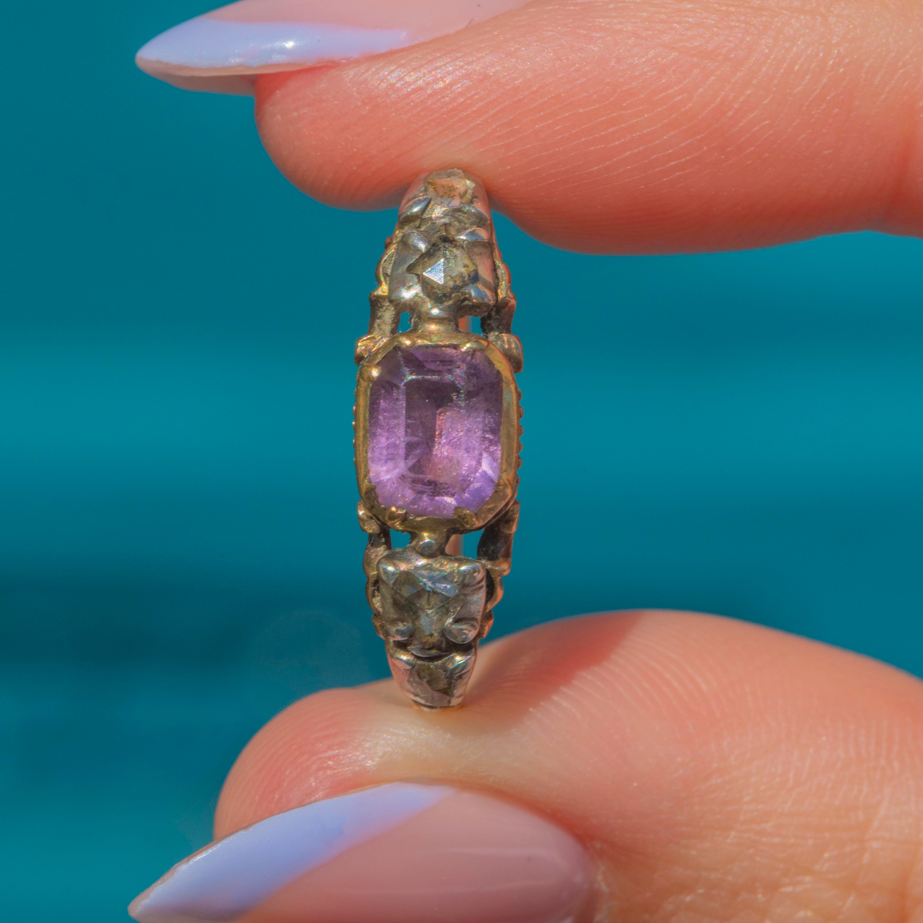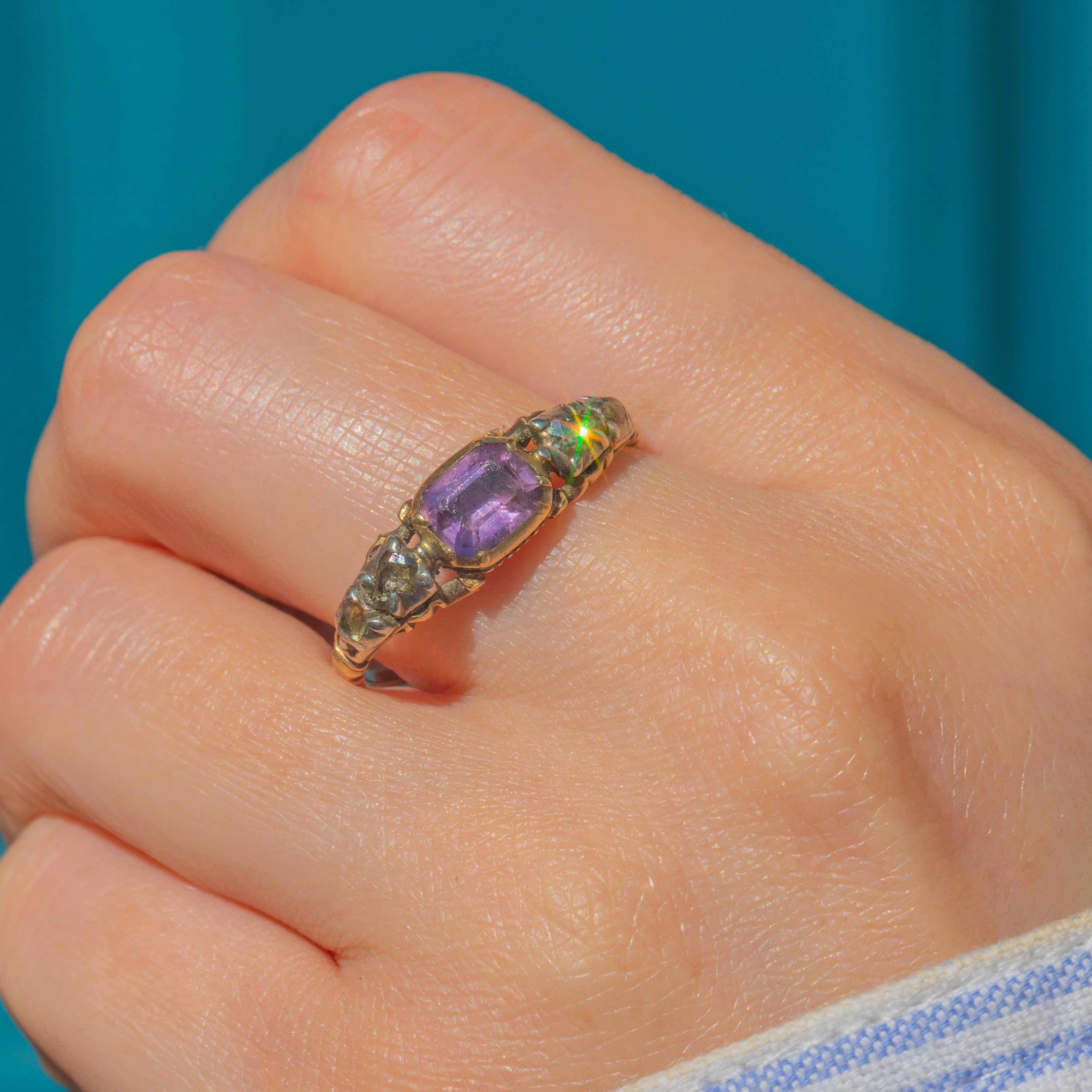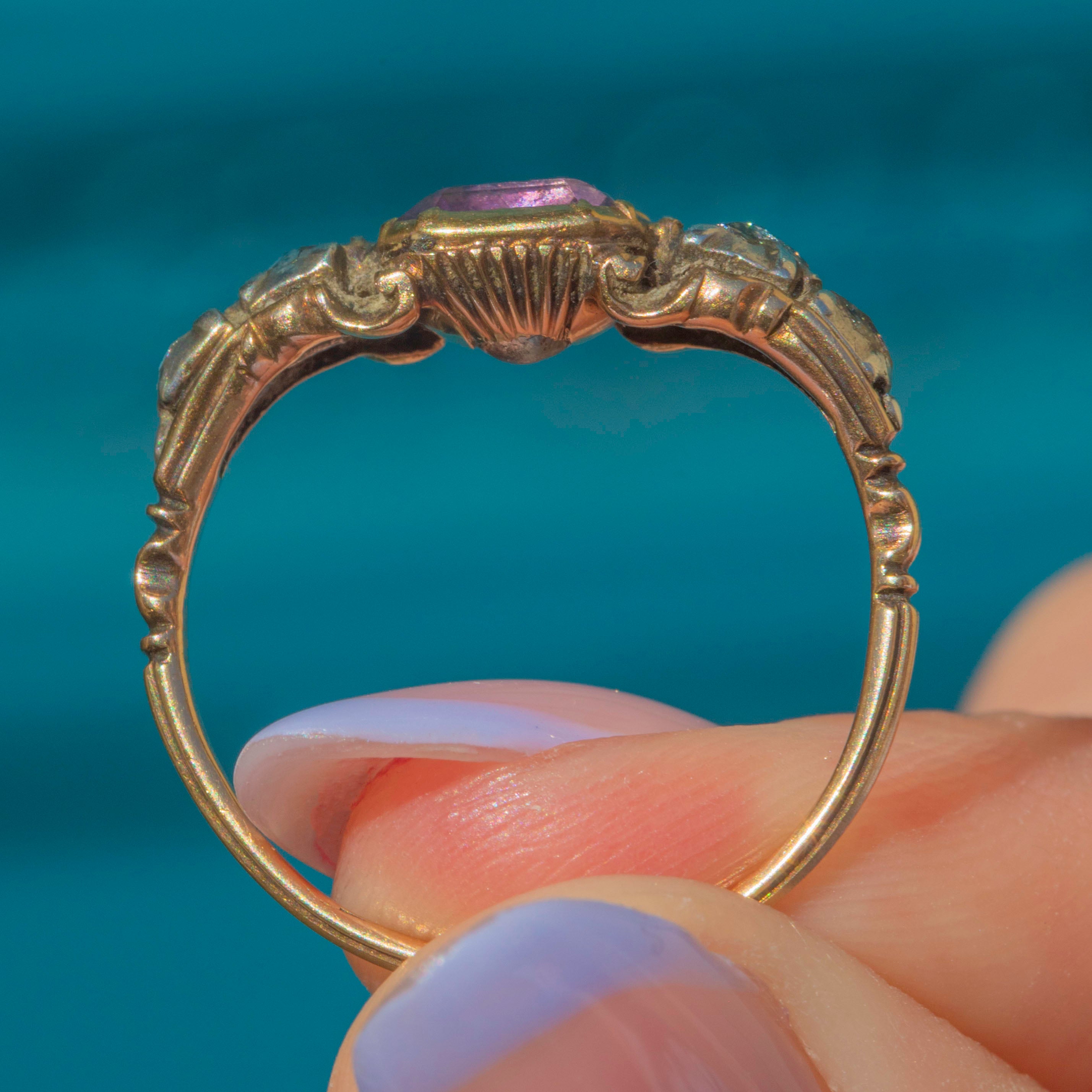 Crafted from rich 18ct Gold, she showcases a regal 0.75ct Amethyst, flanked by four scintillating rose-cut Diamonds. Dated to the 1790s, with stunning ribbed, or shell-like, grooves to the back of the setting and sought-after details such as the typical Rococo "c-curl" flourishes to the shoulders... this enchanting piece also features the most romantic inscription 'Secret & Faithful', secretly placed inside the band!