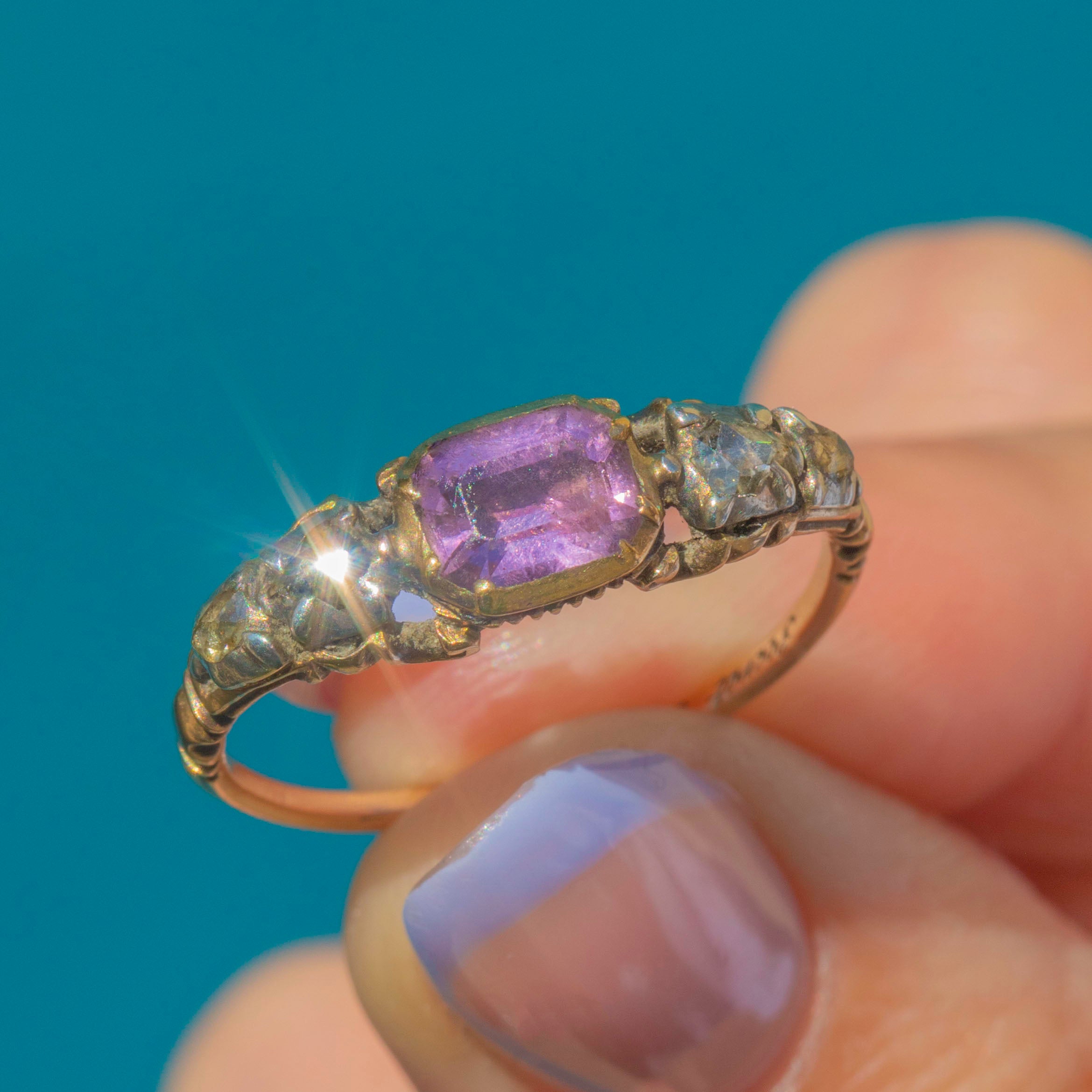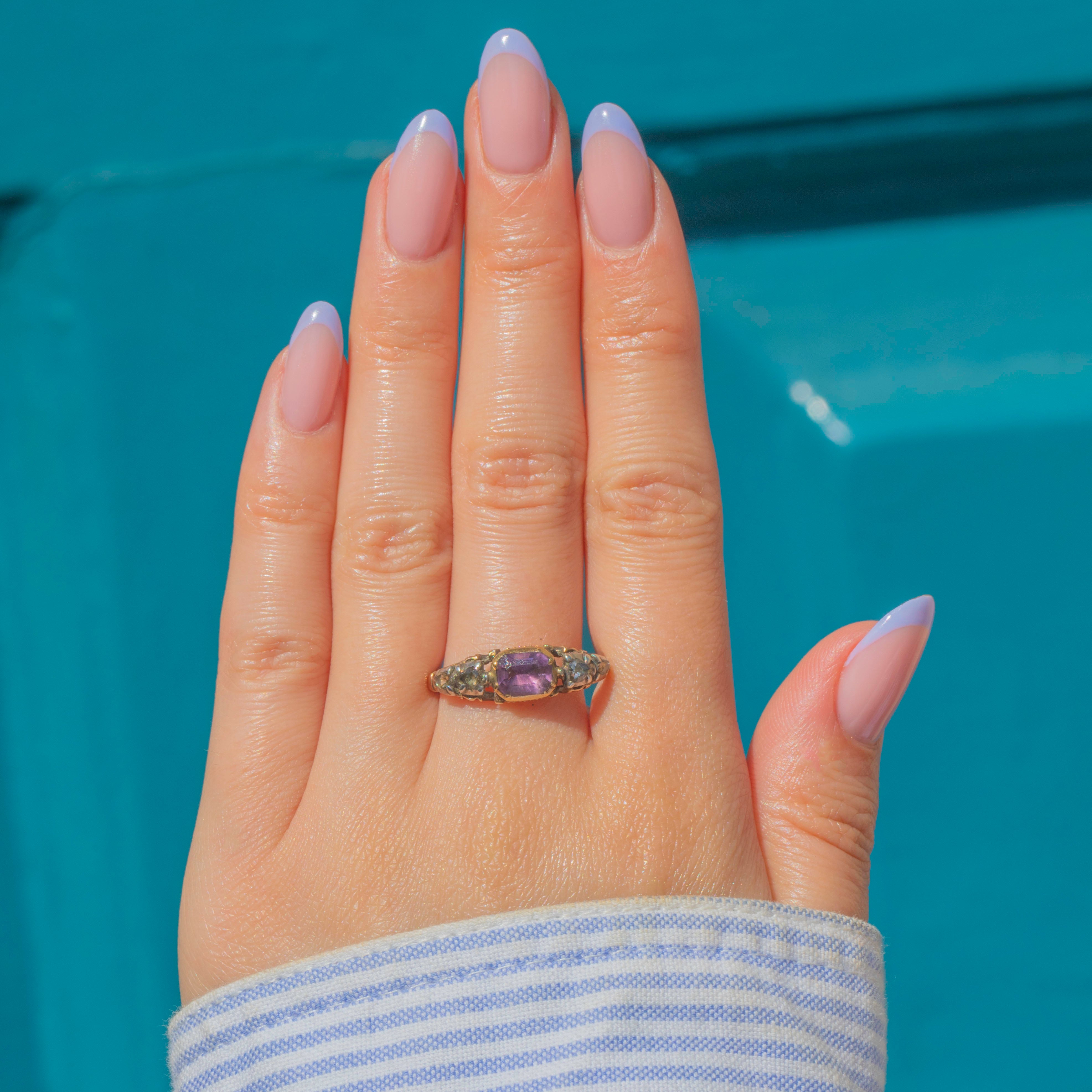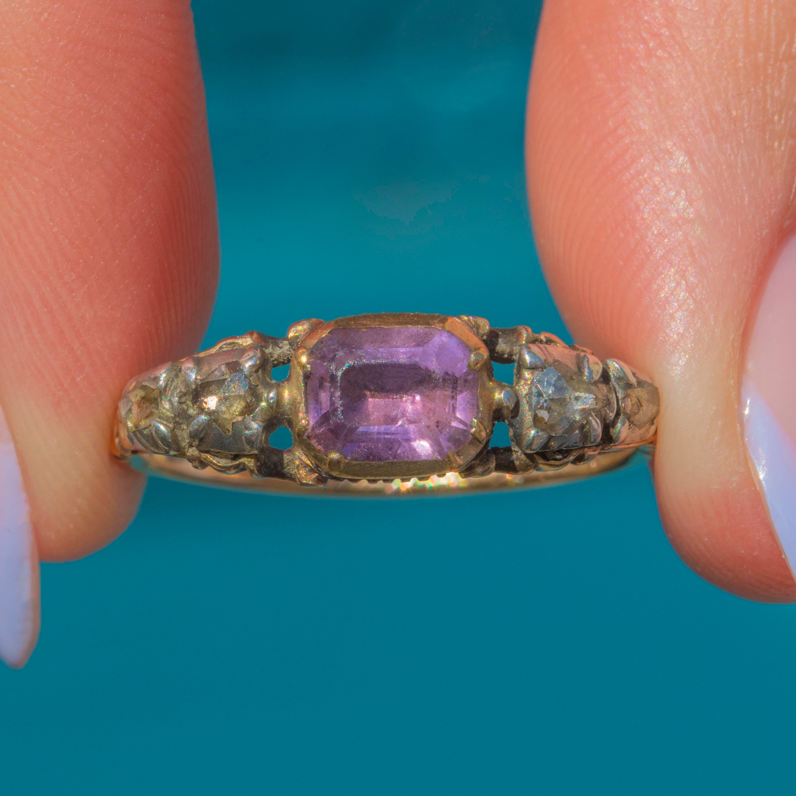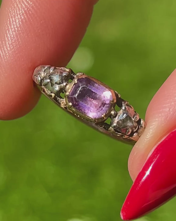 Crafted from rich 18ct Gold, she showcases a regal 0.75ct Amethyst, flanked by four scintillating rose-cut Diamonds. Dated to the 1790s, with stunning ribbed, or shell-like, grooves to the back of the setting and sought-after details such as the typical Rococo "c-curl" flourishes to the shoulders... this enchanting piece also features the most romantic inscription 'Secret & Faithful', secretly placed inside the band!