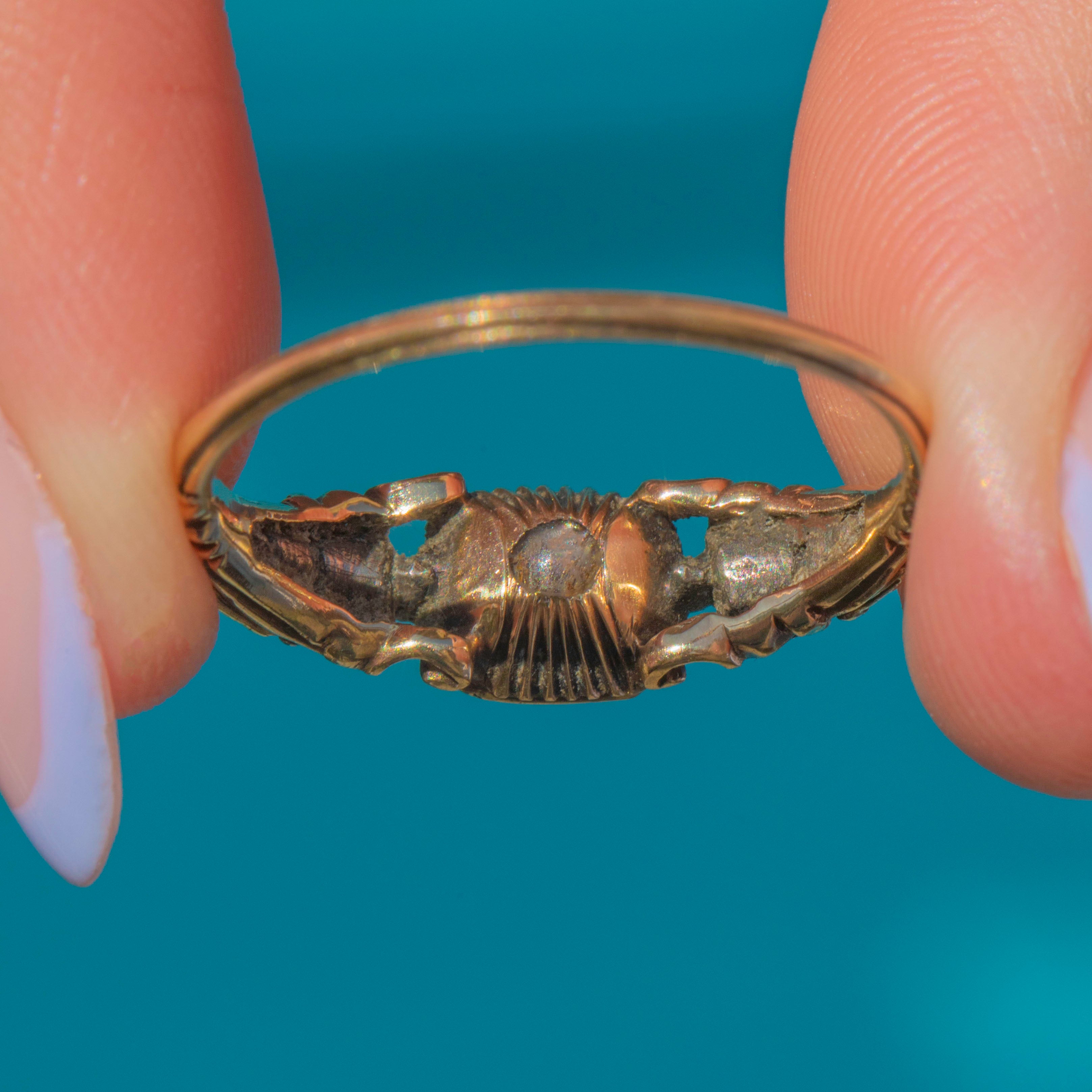 What sets this Georgian ring apart, however, is her rare Rock Crystal locket back, a highly sought-after and scarcely seen feature in early Georgian antique jewellery. A stunning example of Georgian Rococo elegance, this timeless ring combines beauty and historic allure and is a true must-have piece for any antique jewellery collector.