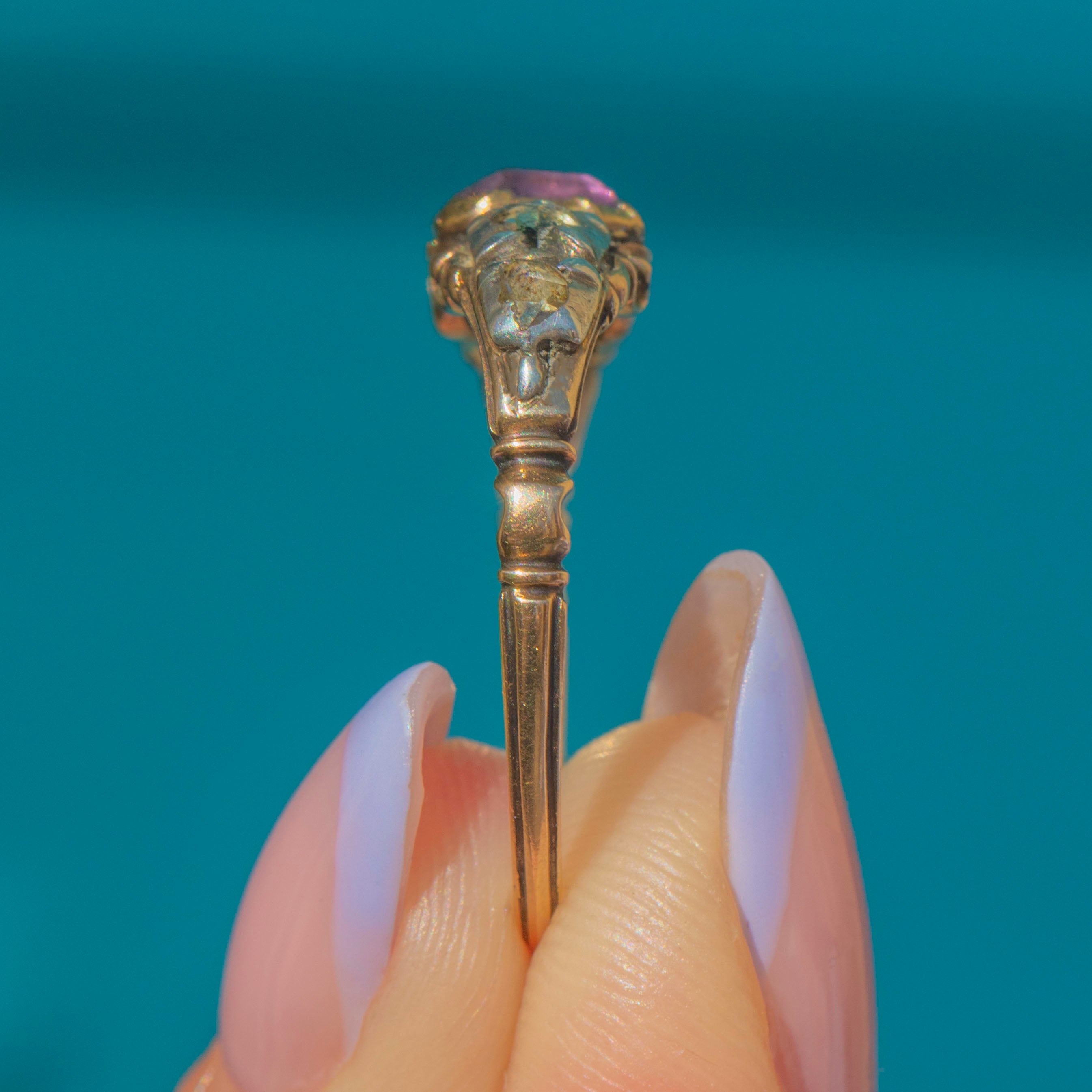 An exceptional treasure from the 18th century, this resplendent Georgian Rococo 18ct Gold Amethyst Diamond half hoop ring is among the rarest we’ve had the privilege to offer!