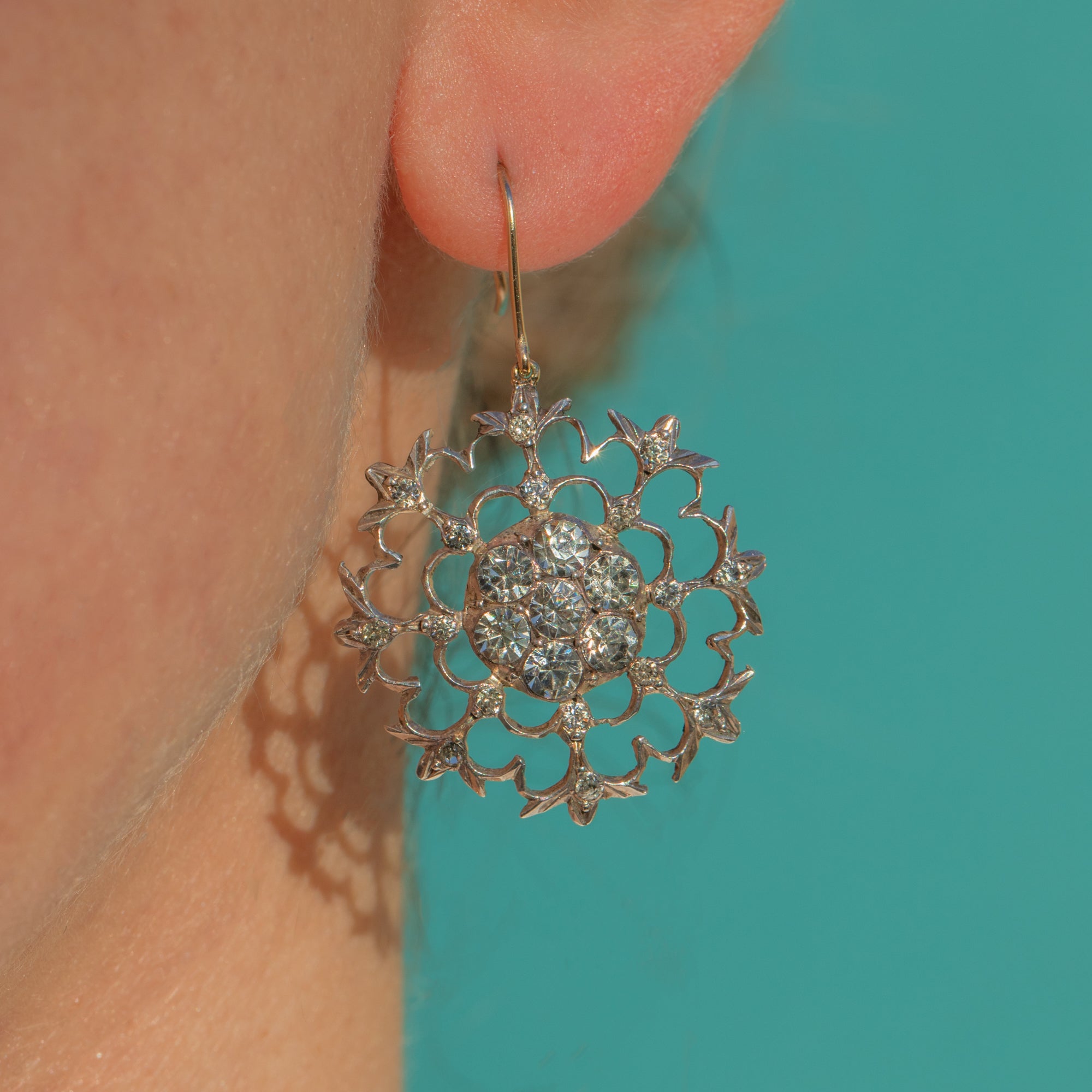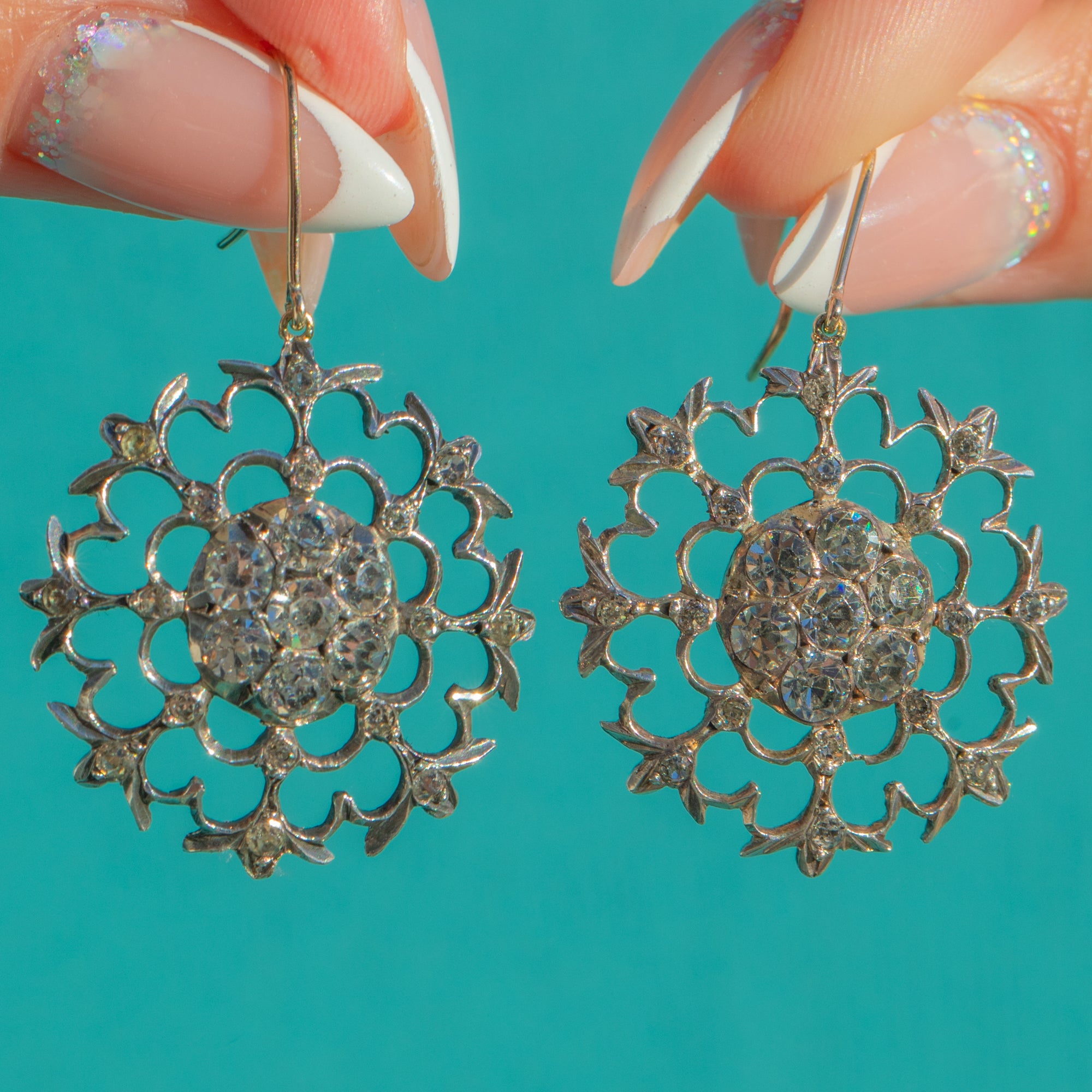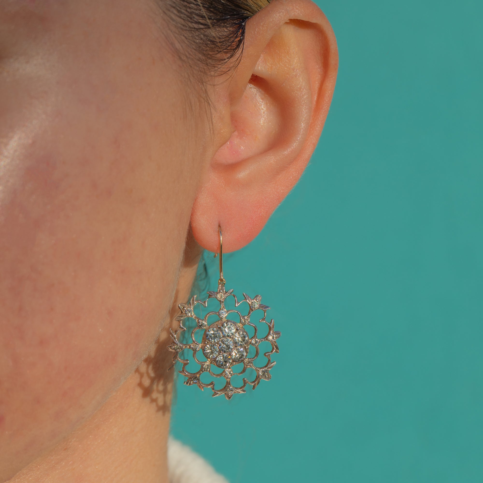 Articulated for graceful movement, the scalloped, petal-like spokes and fine bead settings give these earrings a refined, airy elegance. The subtle two-tone contrast of white Silver fronts and warm Gold hooks completes their timeless Georgian charm.