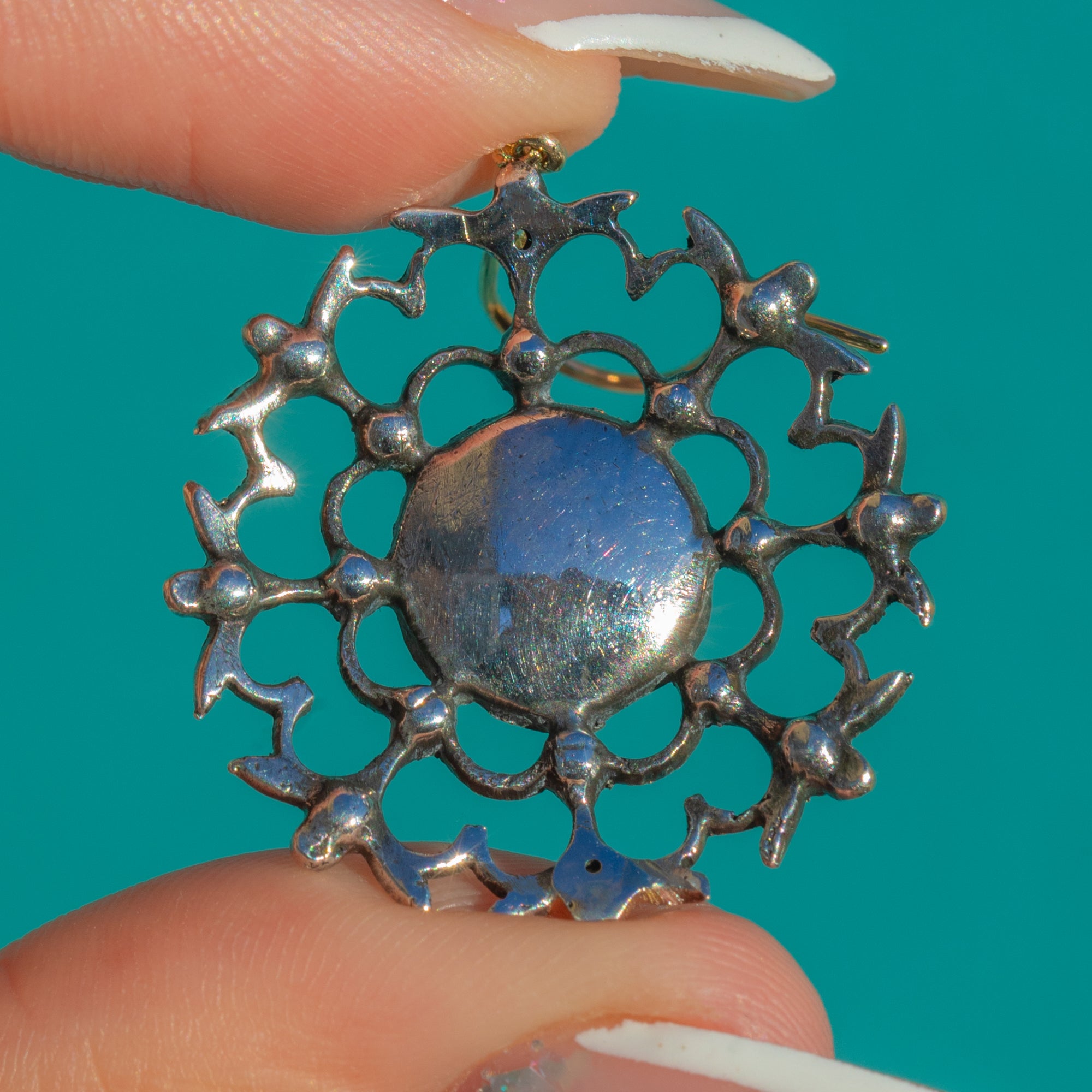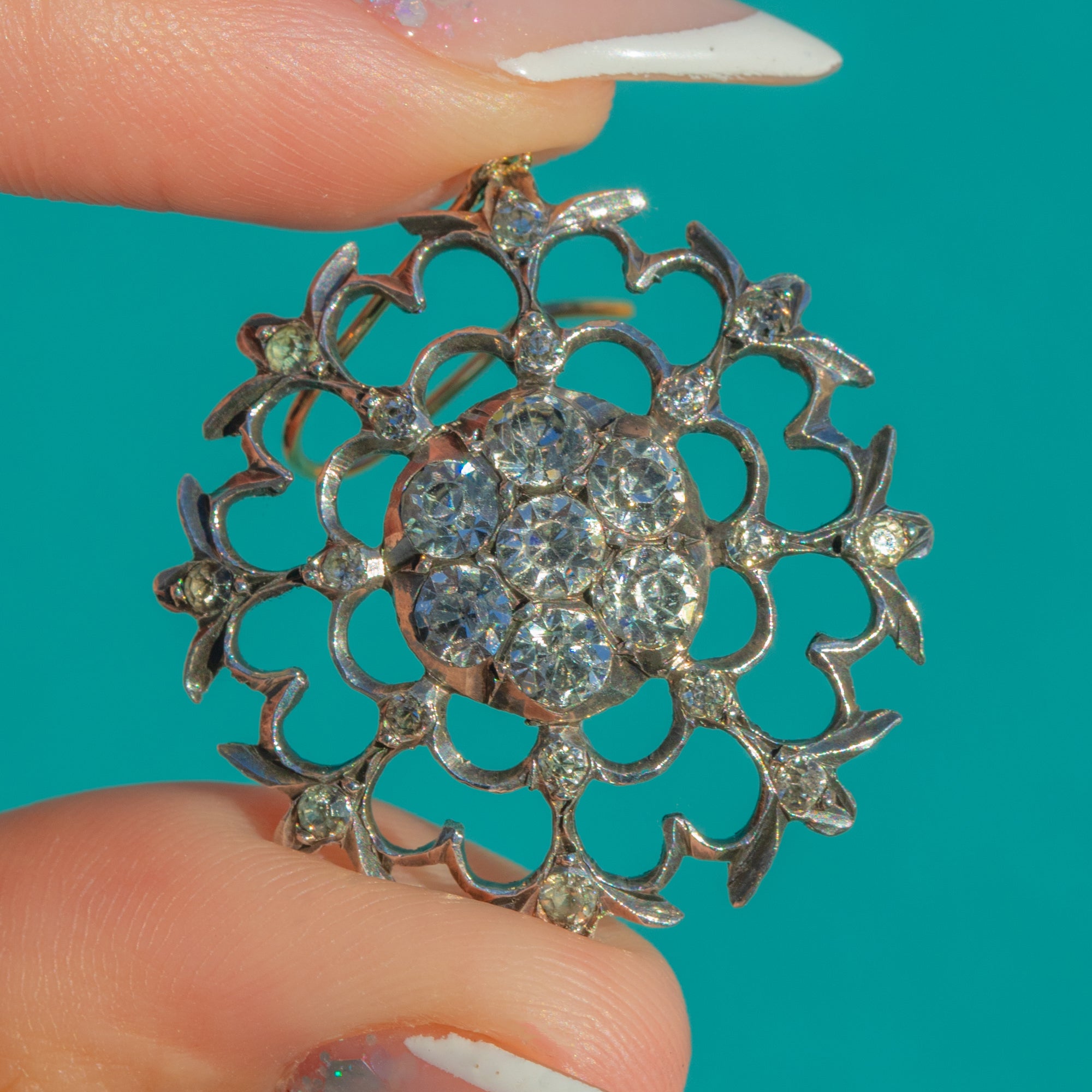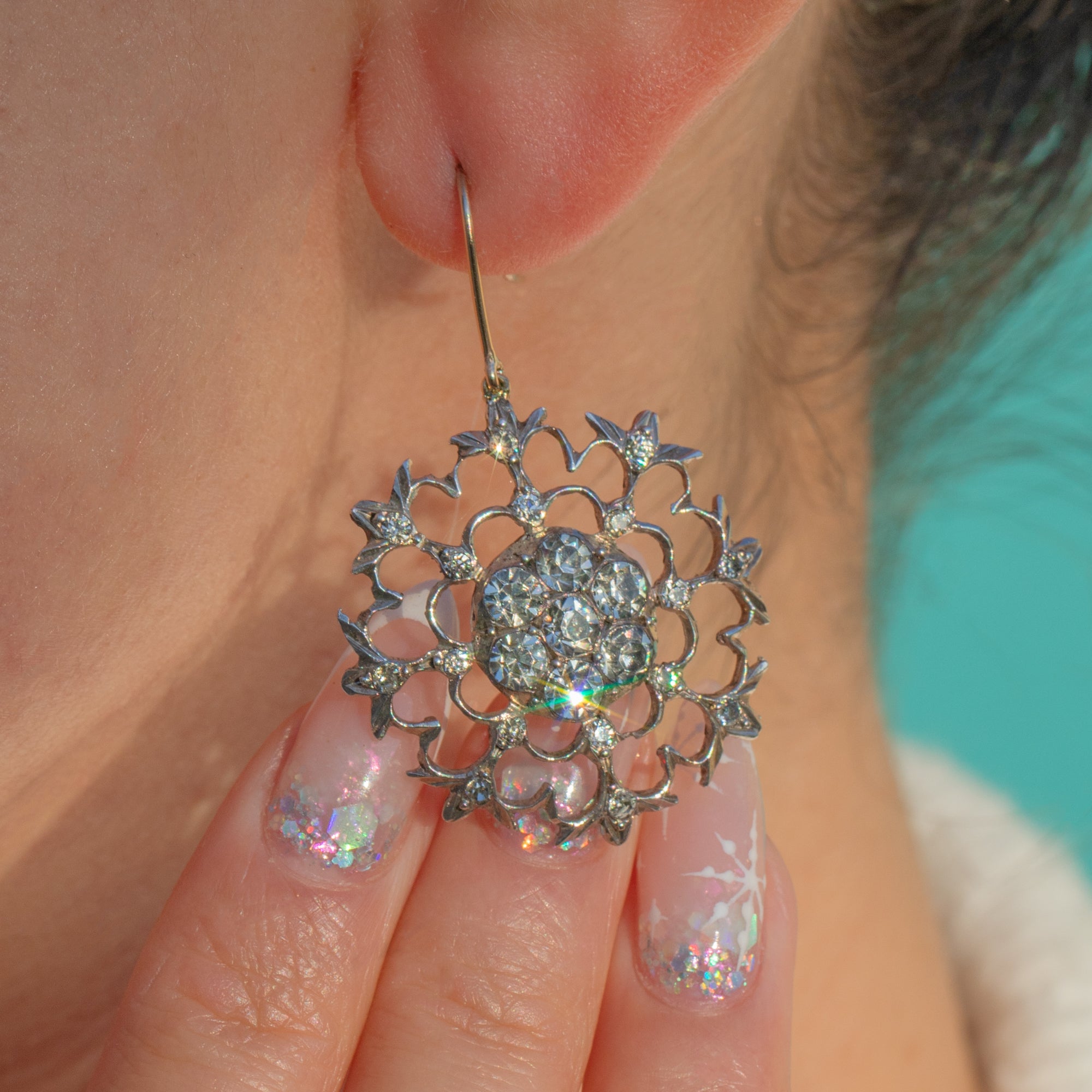 Articulated for graceful movement, the scalloped, petal-like spokes and fine bead settings give these earrings a refined, airy elegance. The subtle two-tone contrast of white Silver fronts and warm Gold hooks completes their timeless Georgian charm.