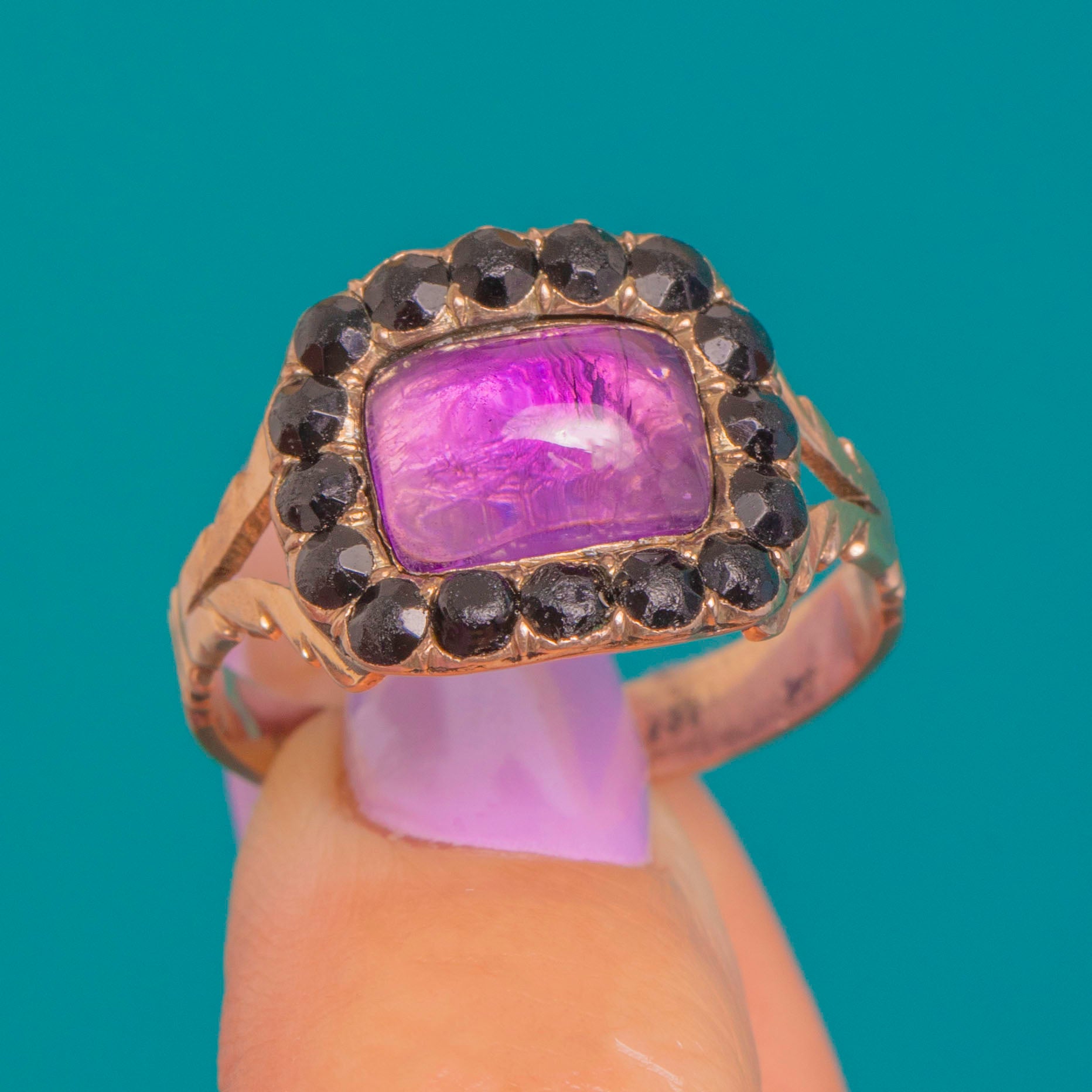 A soulful Georgian mourning ring centred by a luscious Sugarloaf Amethyst, encircled by a halo of inky French Jet. The hand-worked, closed-back settings, split and engraved shoulders and delicately pierced gallery create a refined silhouette with a romantic, antique presence, all in a warm 9ct Gold.