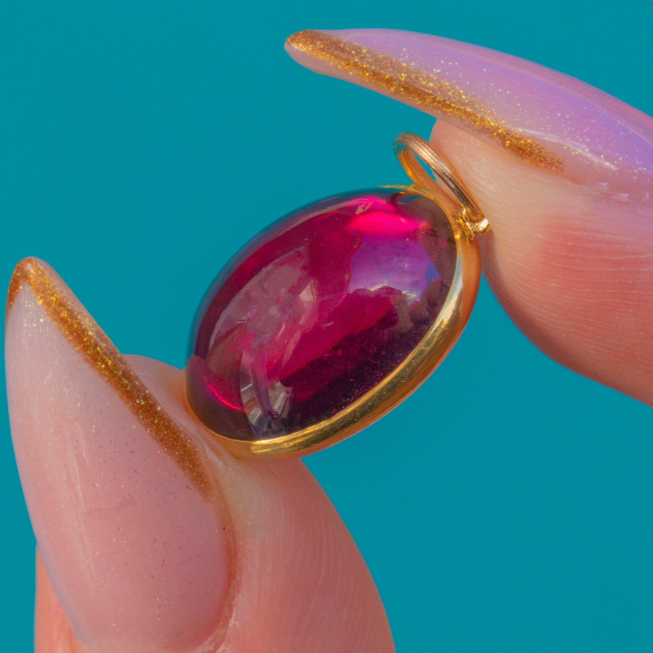 This vintage 9ct Gold charm features a glossy, beautifully domed Garnet cabochon glowing with rich berry-red tones. Smoothly polished with lovely internal depth, the stone brings warmth and colour while the neat bezel setting keeps the look clean, timeless and easy to style.