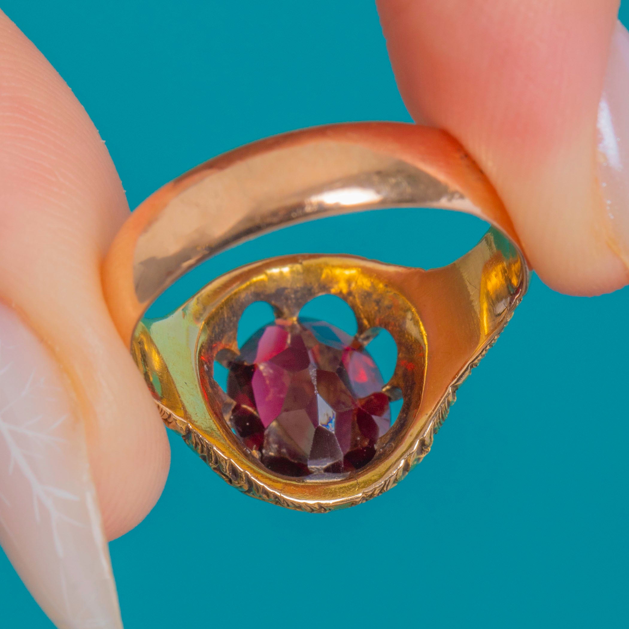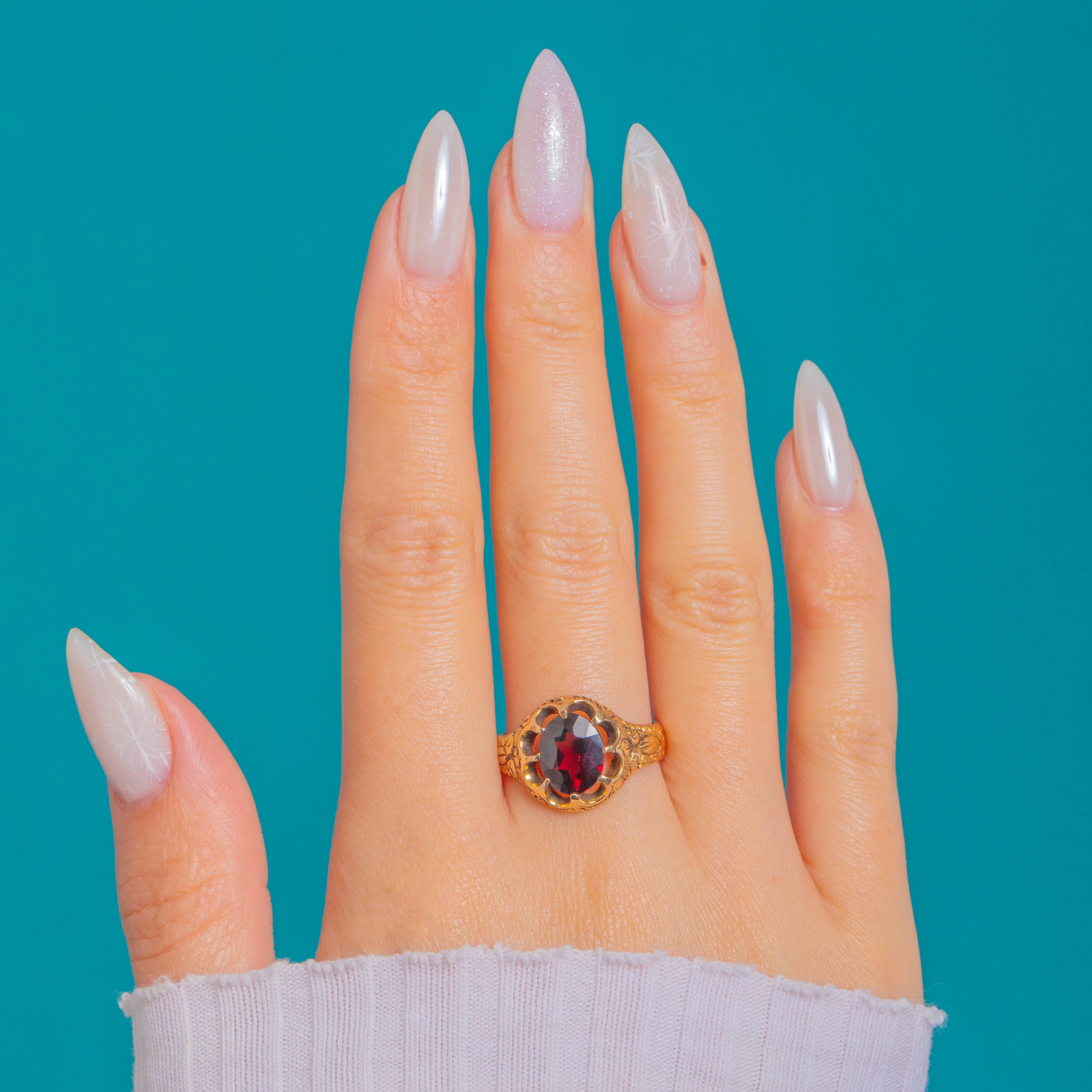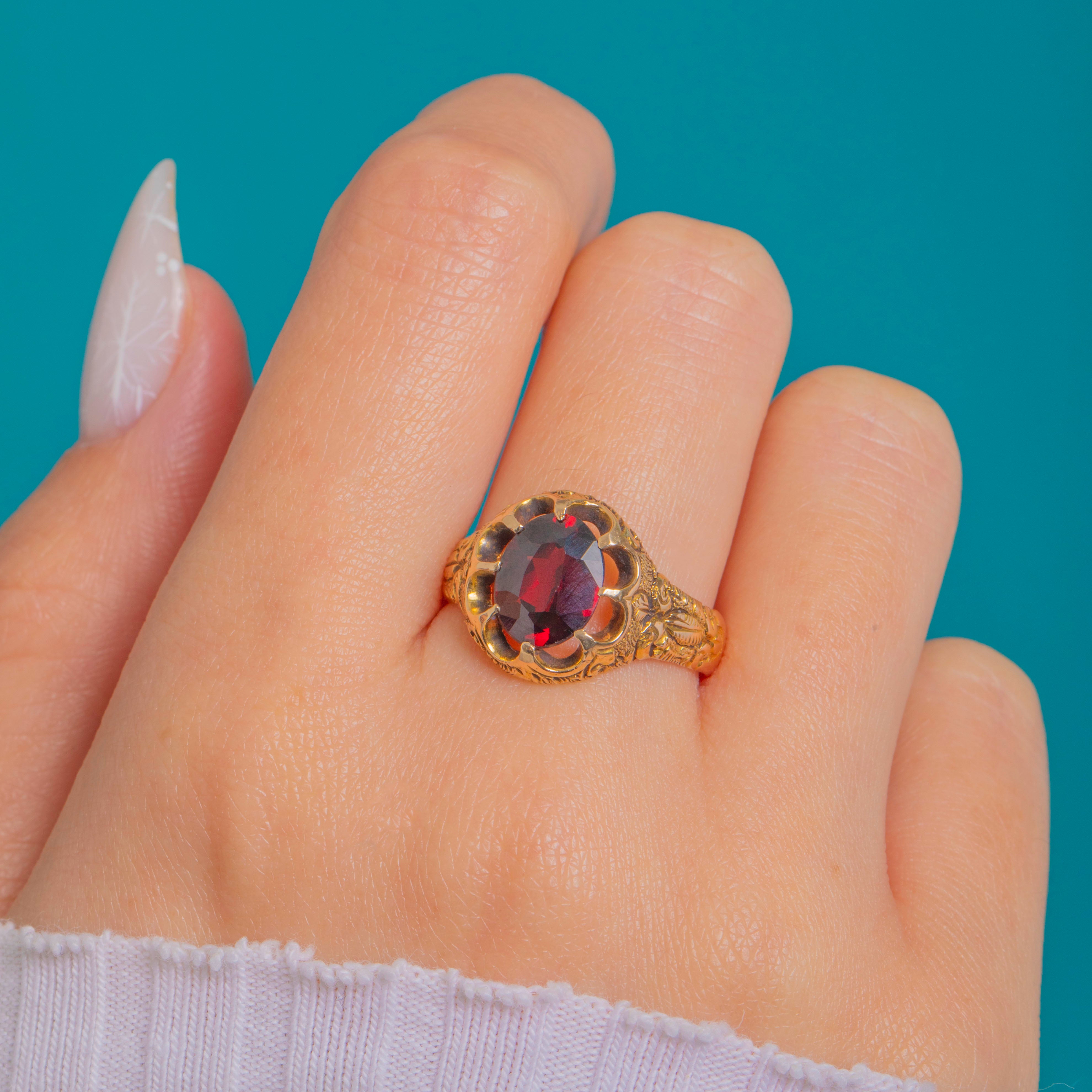 Opulent and romantic, this ornate antique 15ct Gold ring showcases a deep wine-red Garnet lifted high in a scalloped coronet "buttercup" setting. The stone’s rich hue glows beautifully in the open-back setting, while the tall profile creates a striking silhouette on the hand.