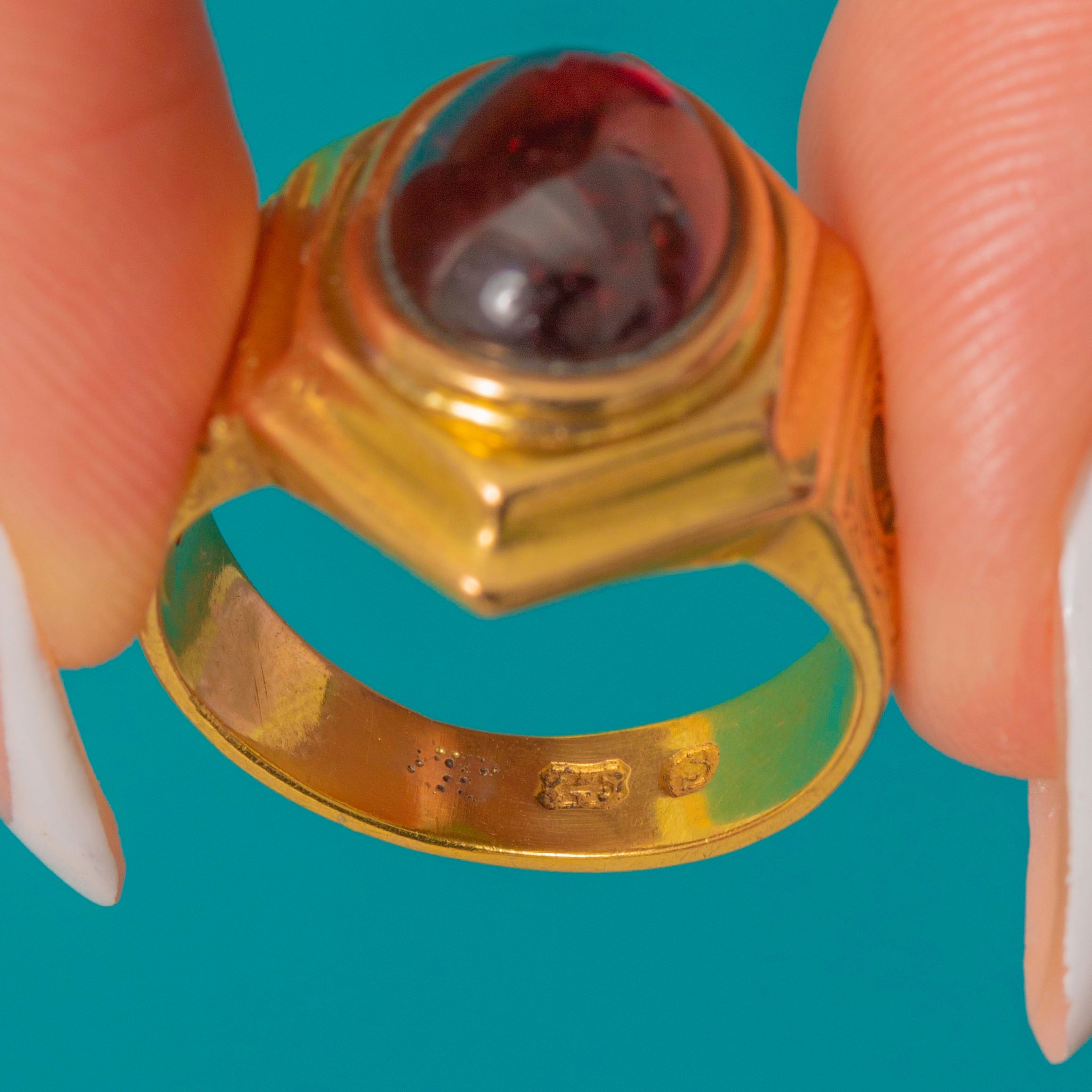 EXCELLENT: The Gold has an even saturation throughout, with no signs of repairs or the band having been previously resized. The Garnet is perfectly smooth and securely set, free from chips or scuffs. The wide ring band provides comfortable wear, and comes complete with a full set of hallmarks dating to 1867!