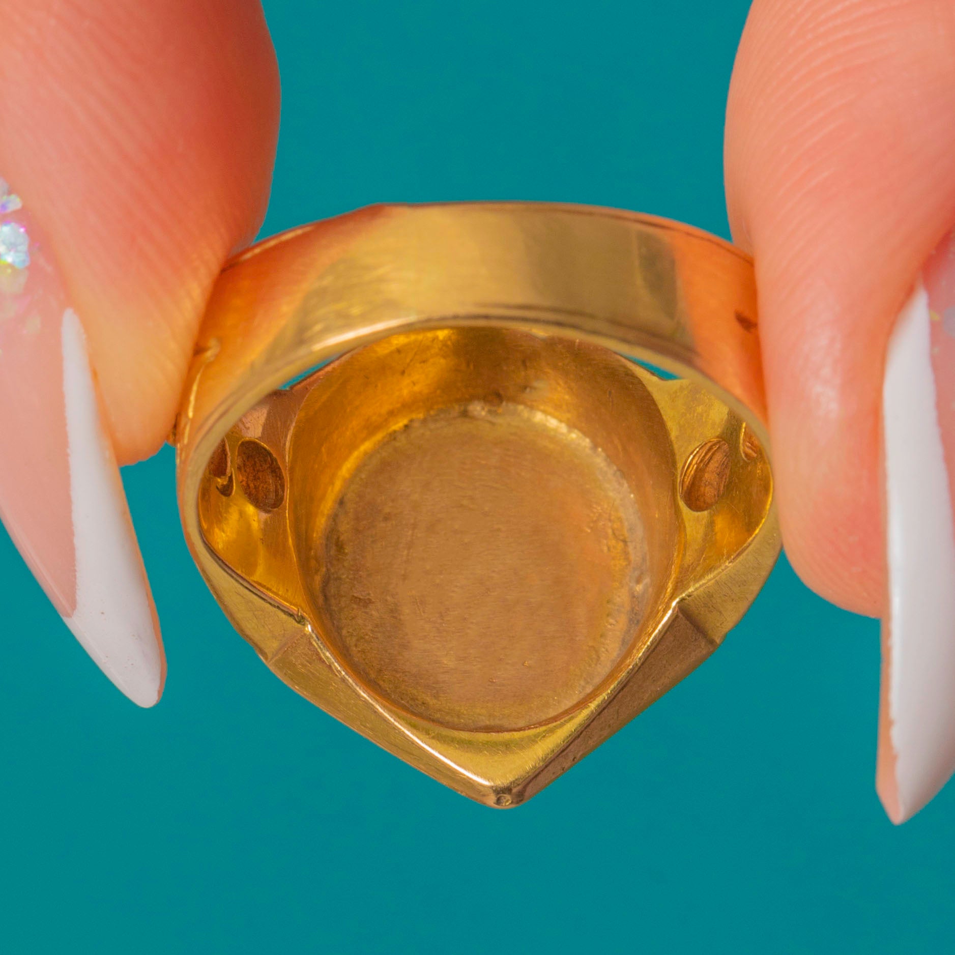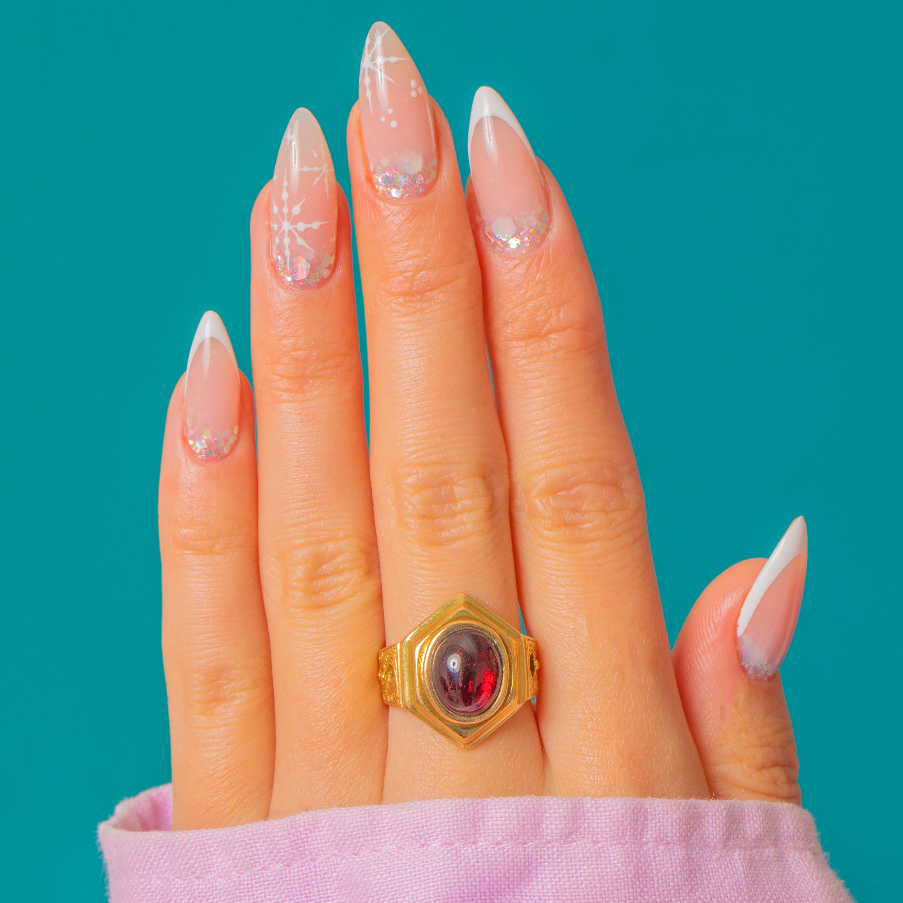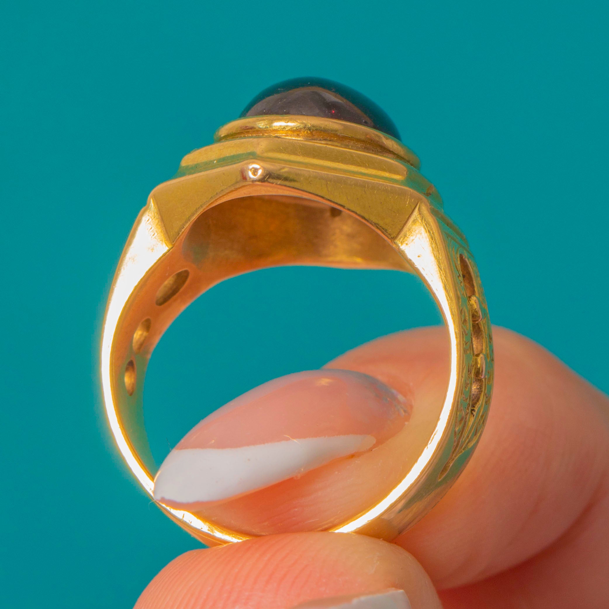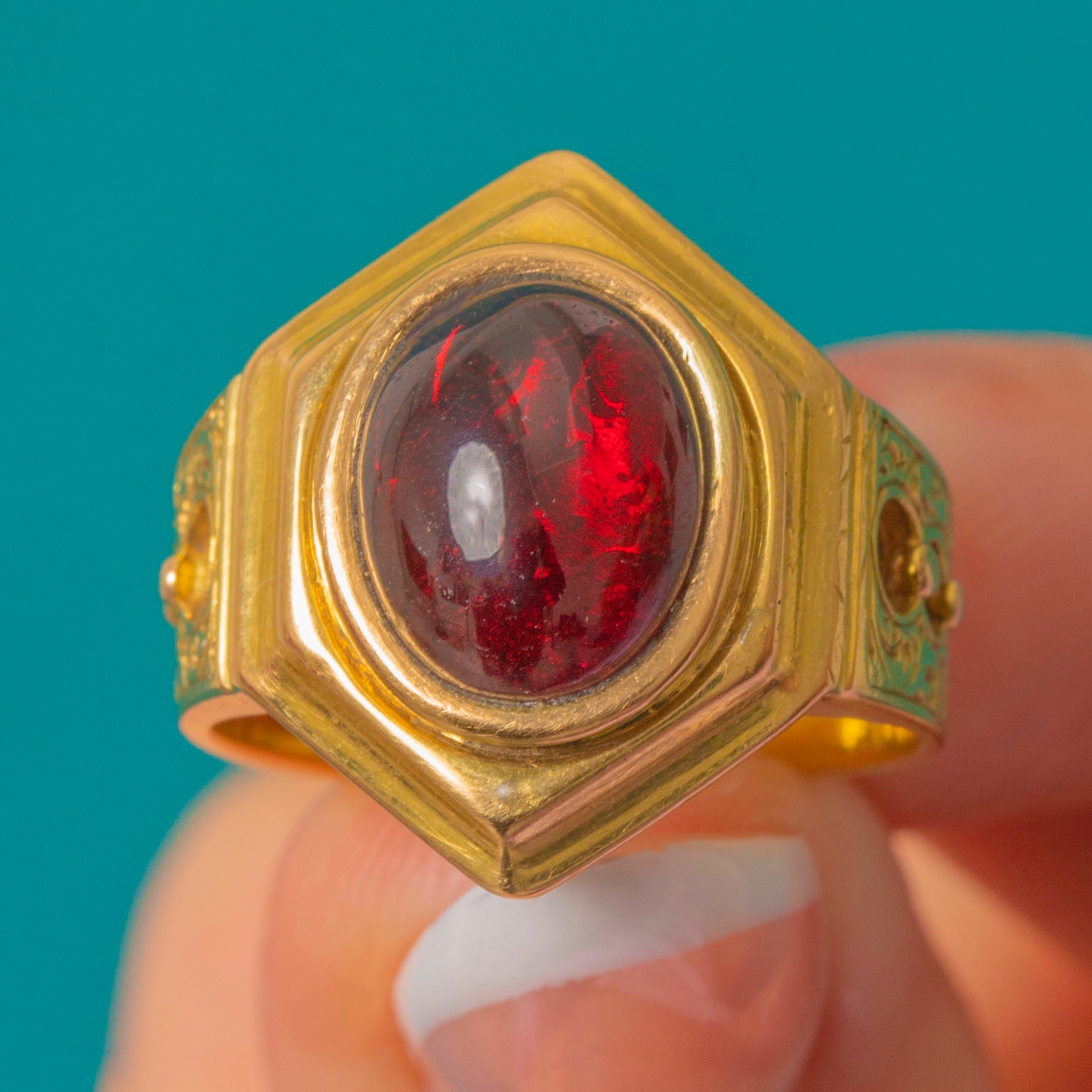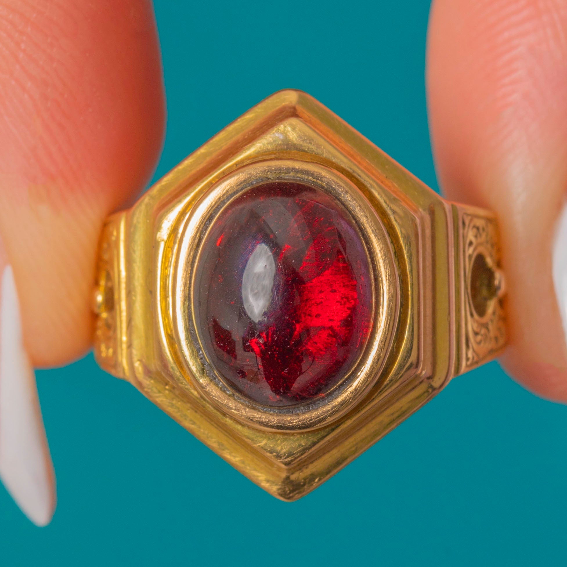 With a full set of English hallmarks dating to 1867, this Victorian Garnet ring is a fine collector's piece! Crafted entirely from solid 18ct Gold, the impressive hexagonal ring face is inlaid with a 2.16ct Garnet cabochon, with a deep crimson hue that will seduce you the moment you lay eyes on her.